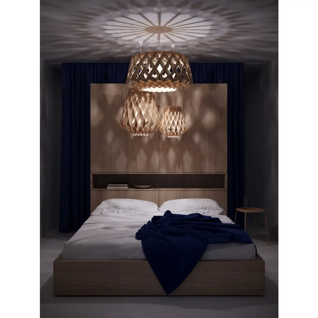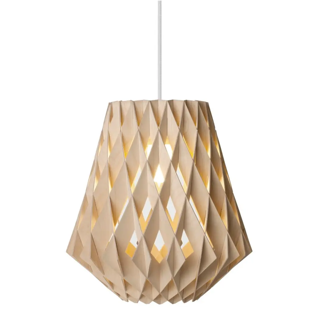 The Pilke Signature 28 pendant by Pilke Lights provides an atmospheric glow to any space. As you might have guessed by the luminaire's name, the Pilke 28 pendant light has a diameter of 11.02 x 0 in (28 x cm, cm), making it the perfect centerpiece for smaller rooms. The size also works well in a row over a table or in a cluster of several pendants, like a modern alternative for a chandelier. Pilke 28 is part of the simple yet ornamental Pilke Signature Collection designed by Tuukka Halonen. Crafted from birch plywood, the Pilke luminaires are an enchanting combination of technology and tradition: Halonen sought influences for the design from traditional Finnish wood crafts but utilized today’s manufacturing methods and materials. As a contemporary interpretation of shingle work, the lamps are characterized by a crystal-like pattern that filters the light pleasantly and casts beautiful shadows on the walls and ceiling. All Pilke lamps are designed and handcrafted in Finland. Please note that in 2022, the lamp was updated slightly: the new version comes with a new white textile cord and a white ceiling cup in metal.