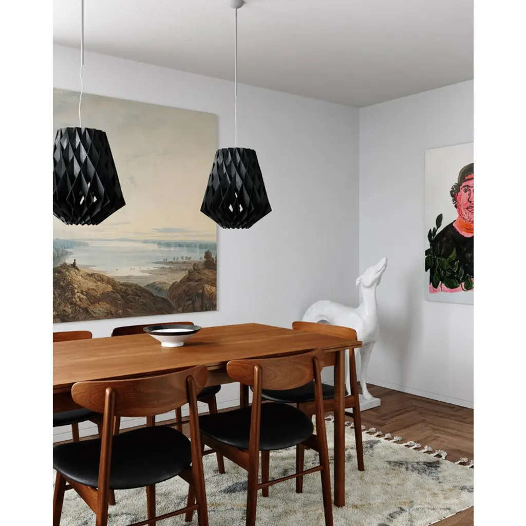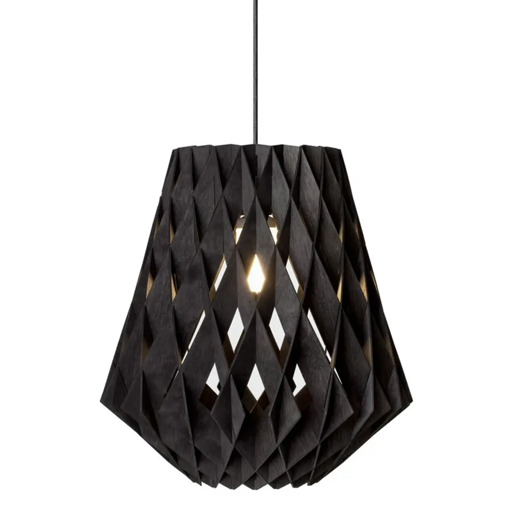 The Pilke Signature 36 pendant by Pilke Lights provides an atmospheric glow to any space. As you might have guessed by the luminaire's name, the Pilke 36 pendant light has a diameter of 14.17 x 0 in (36 x cm, cm), making it the perfect centerpiece for slightly smaller living rooms, for example. The size also works well in a row or cluster of several pendants – a modern alternative for a chandelier! Pilke 36 is part of the simple yet ornamental Pilke Signature Collection designed by Tuukka Halonen. Crafted from birch plywood, the Pilke luminaires are an enchanting combination of technology and tradition: Halonen sought influences for the design from traditional Finnish wood crafts but utilized today’s manufacturing methods and materials. As a contemporary interpretation of shingle work, the lamps are characterized by a crystal-like pattern that filters the light pleasantly and casts beautiful shadows on the walls and ceiling. All Pilke lamps are designed and handcrafted in Finland. Please note that in 2022, the lamp was updated slightly: the new version comes with a new black textile cord and a black ceiling cup in metal.
