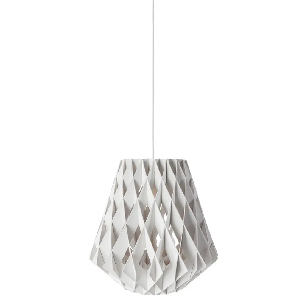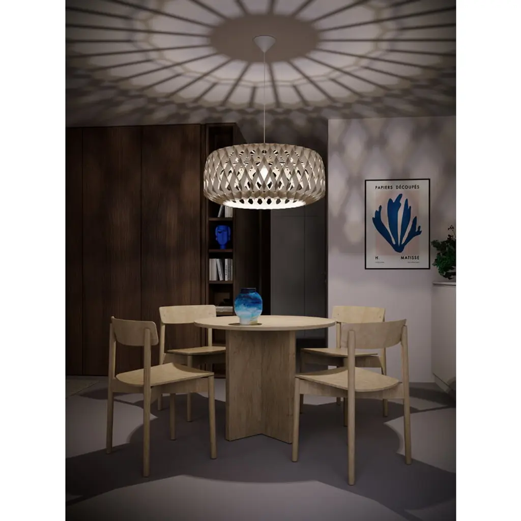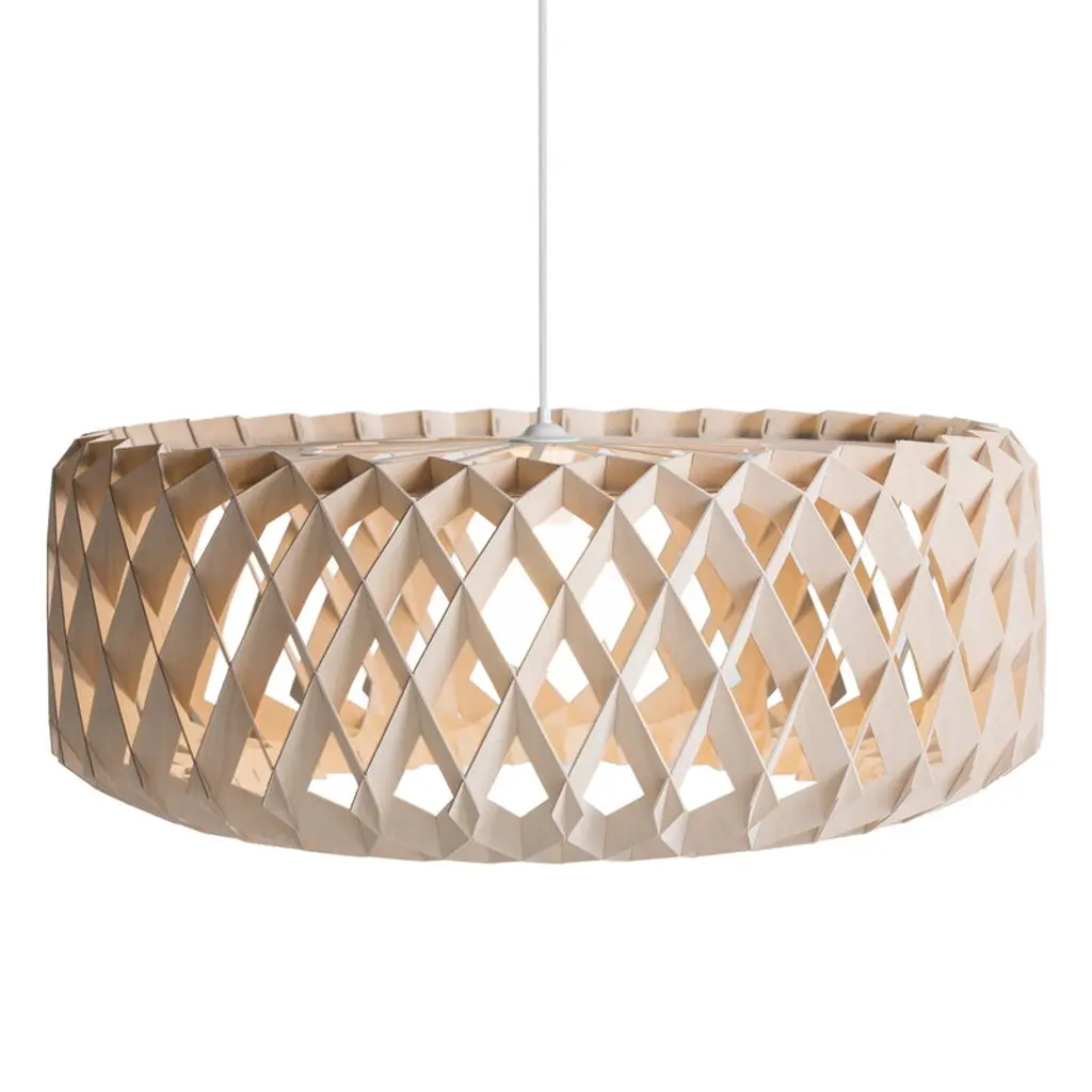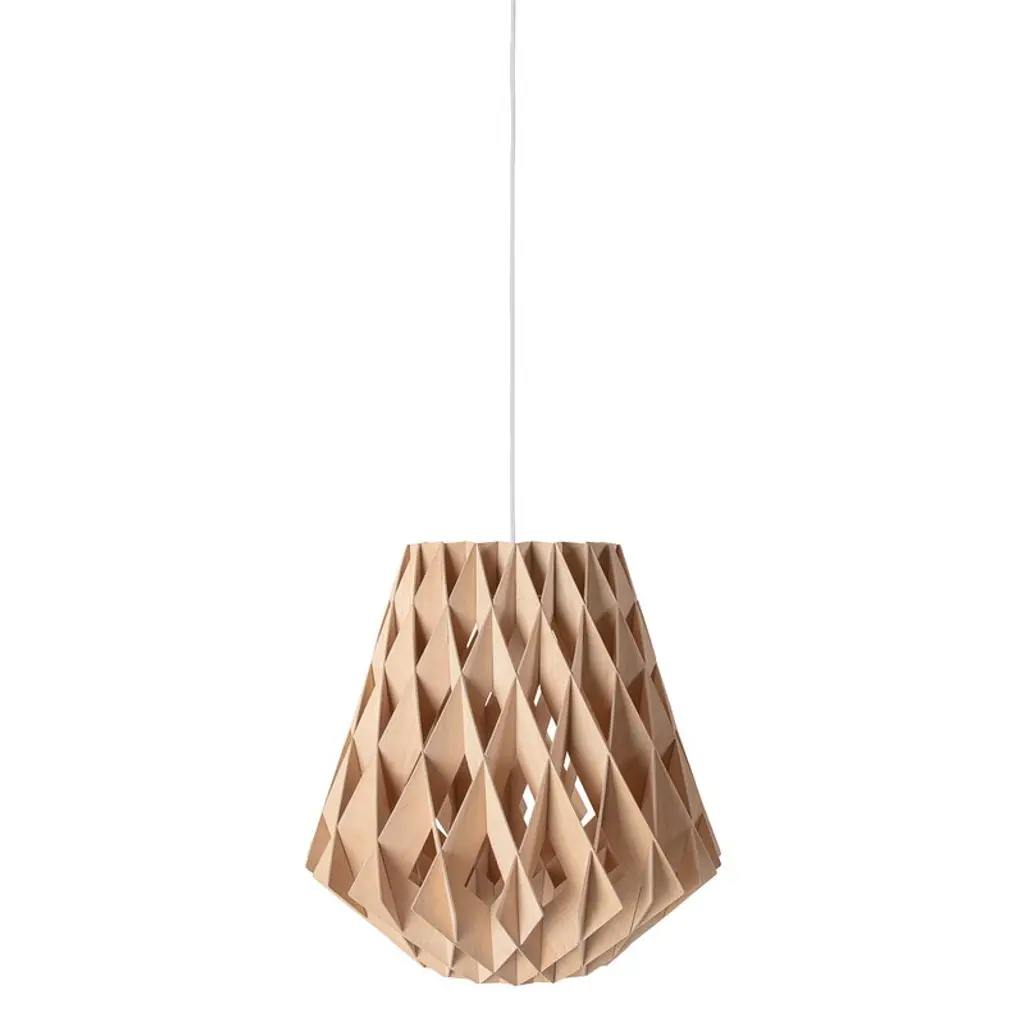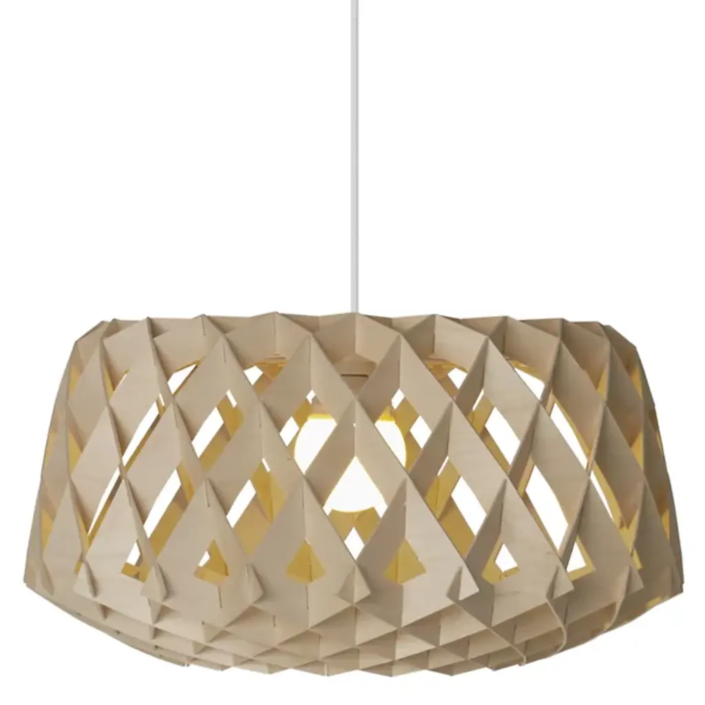 The Pilke Signature 80 pendant by Pilke Lights provides an atmospheric glow to any space. As you might have guessed by the luminaire's name, the Pilke 80 pendant light has a diameter of 31.5 x 0 in (80 x cm, cm), making it ideal for larger rooms; its voluminous yet airy design looks particularly appealing when hung over a coffee table or a dining room table. Pilke 80 is part of the simple yet ornamental Pilke Signature Collection designed by Tuukka Halonen. Crafted from birch plywood, the Pilke luminaires are an enchanting combination of technology and tradition: Halonen sought influences for the design from traditional Finnish wood crafts but utilized today’s manufacturing methods and materials. As a contemporary interpretation of shingle work, the lamps are characterized by a crystal-like pattern that filters the light pleasantly and casts beautiful shadows on the walls and ceiling. All Pilke lamps are designed and handcrafted in Finland. Please note that in 2022, the lamp was updated slightly: the new version comes with a new white textile cord and a white ceiling cup in metal.