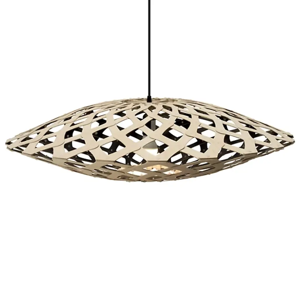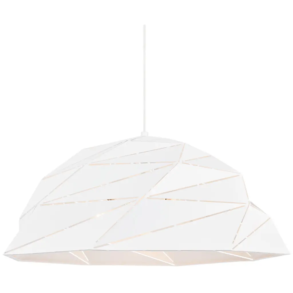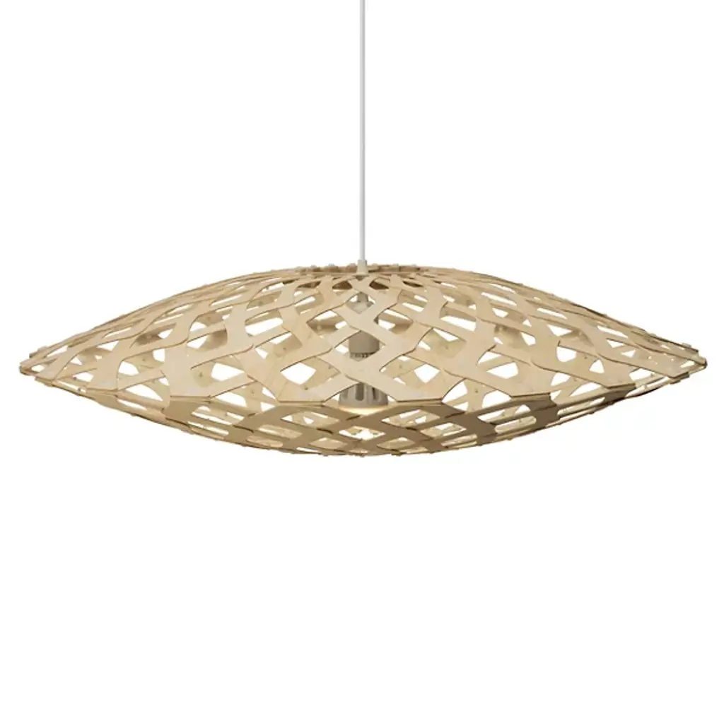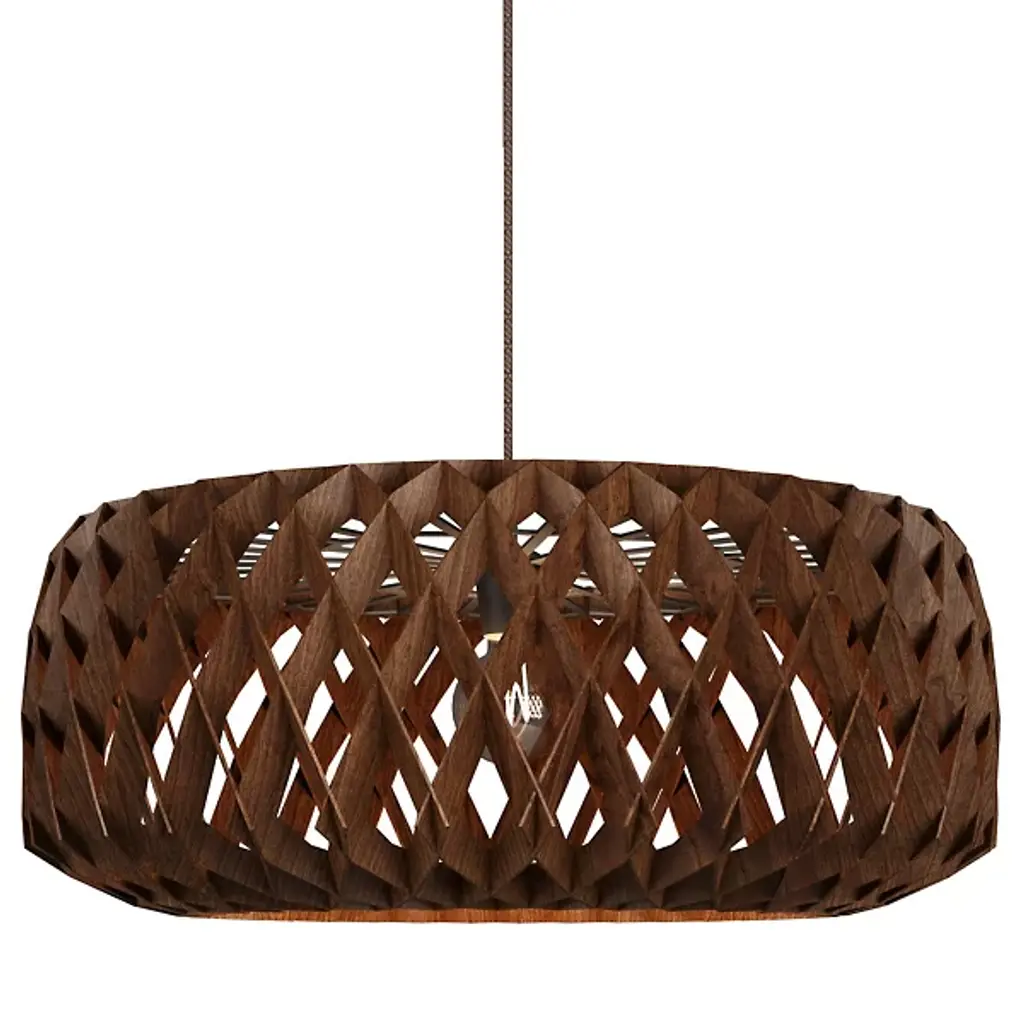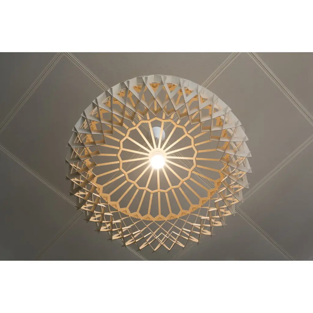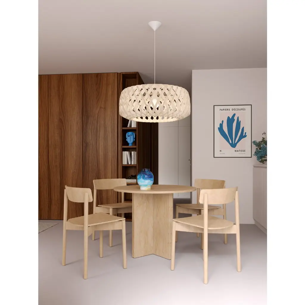 The Pilke Signature 80 pendant by Pilke Lights provides an atmospheric glow to any space. As you might have guessed by the luminaire's name, the Pilke 80 pendant light has a diameter of 31.5 x 0 in (80 x cm, cm), making it ideal for larger rooms; its voluminous yet airy design looks particularly appealing when hung over a coffee table or a dining room table. Pilke 80 is part of the simple yet ornamental Pilke Signature Collection designed by Tuukka Halonen. Crafted from birch plywood, the Pilke luminaires are an enchanting combination of technology and tradition: Halonen sought influences for the design from traditional Finnish wood crafts but utilized today’s manufacturing methods and materials. As a contemporary interpretation of shingle work, the lamps are characterized by a crystal-like pattern that filters the light pleasantly and casts beautiful shadows on the walls and ceiling. All Pilke lamps are designed and handcrafted in Finland. Please note that in 2022, the lamp was updated slightly: the new version comes with a new white textile cord and a white ceiling cup in metal.