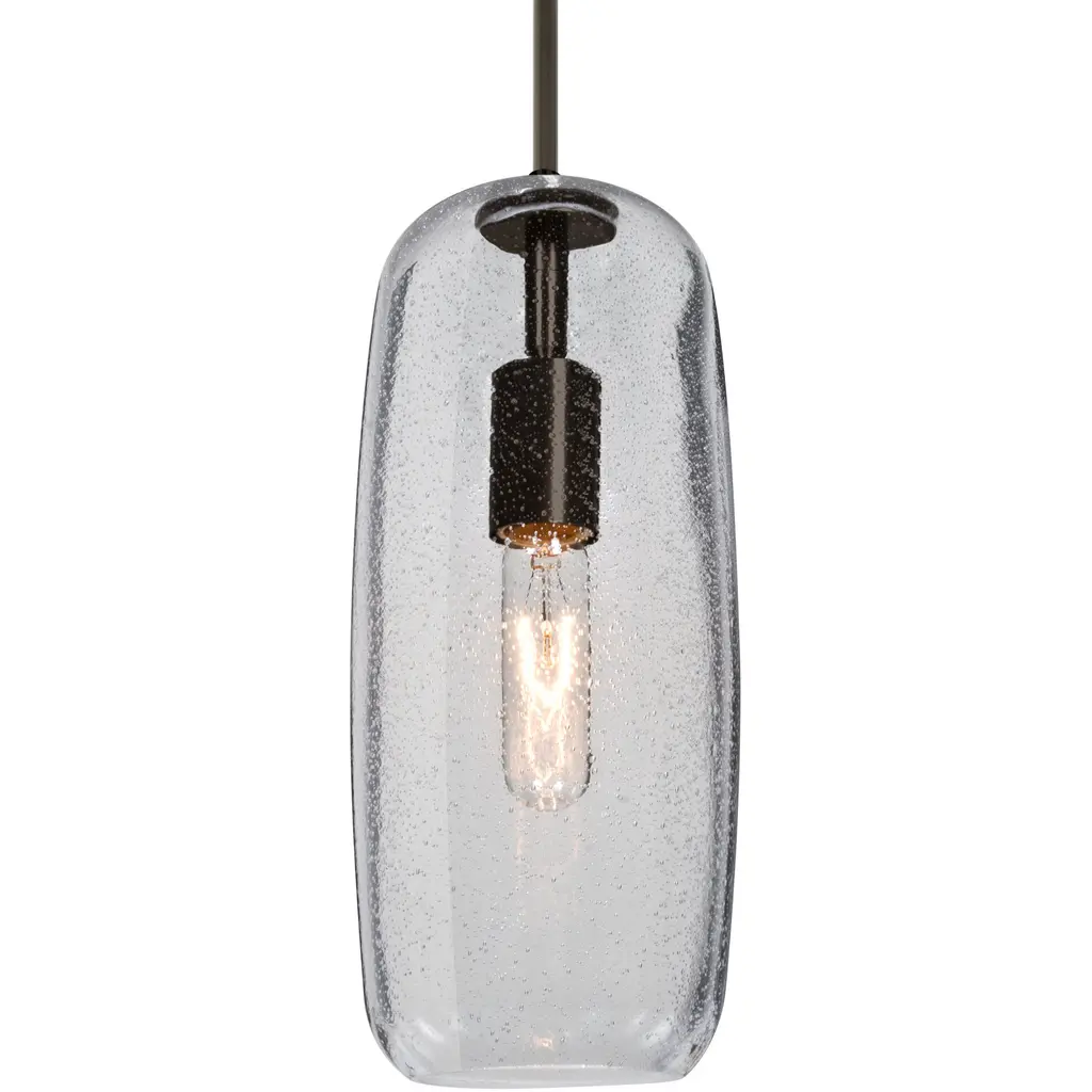 The Pinots 18 feature oblong, free form glass shades, with a soothing injection of random bubble patterning. The transparent Blue glass with the pleasing play of light through the bubble accents make for a striking affect. The cord pendant fixture is equipped with a 10' SVT cordset and a low profile flat monopoint canopy. These stylish and functional luminaries are offered in a beautiful Satin Nickel finish.