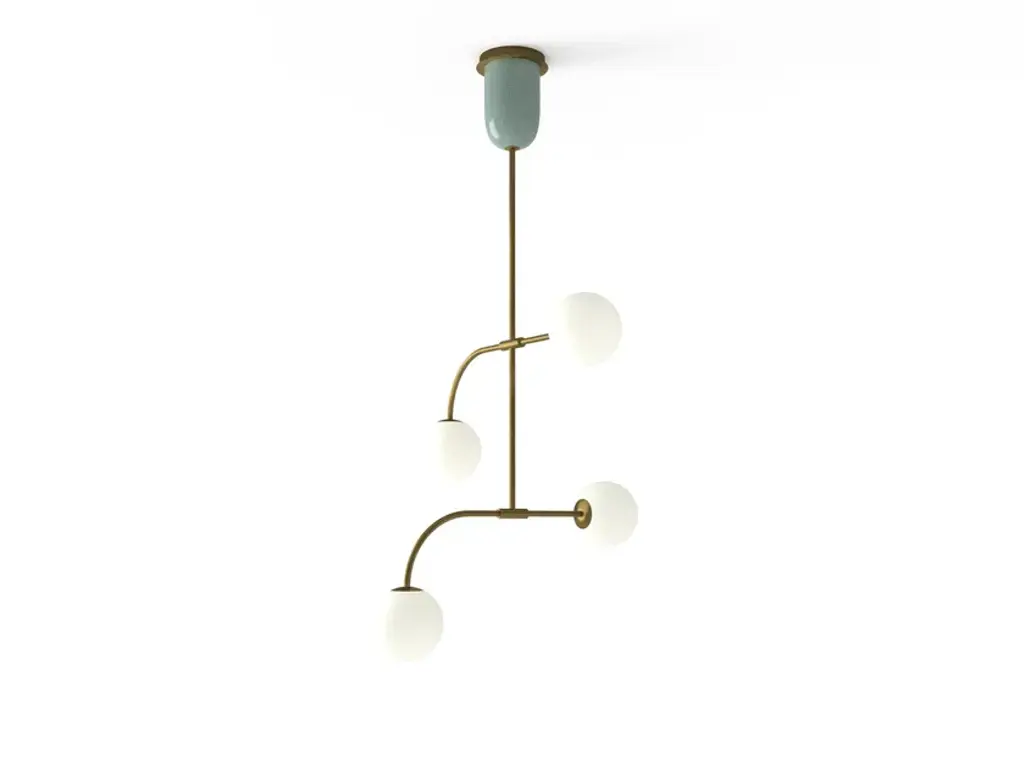 PINS is a suspension with brushed brass structure and glazed ceramic element, available in different finishes and colors.Overlapping volumes that interact with each other with simplicity and brightness, emphasized by a ceramic element in contrasting color that emphasizes the surfaces and highlights the extension of the suspended object to the maximum. The light source diffused by the spherical frosted glass opens freely to the space which softly illuminates.The suspensions of the Notorious collection feature a sleek design, top quality construction details, wide range of finishes so they are particularly suitable to be inserted in the most fascinating residential and hospitality projects.4 x G9 Led 10W