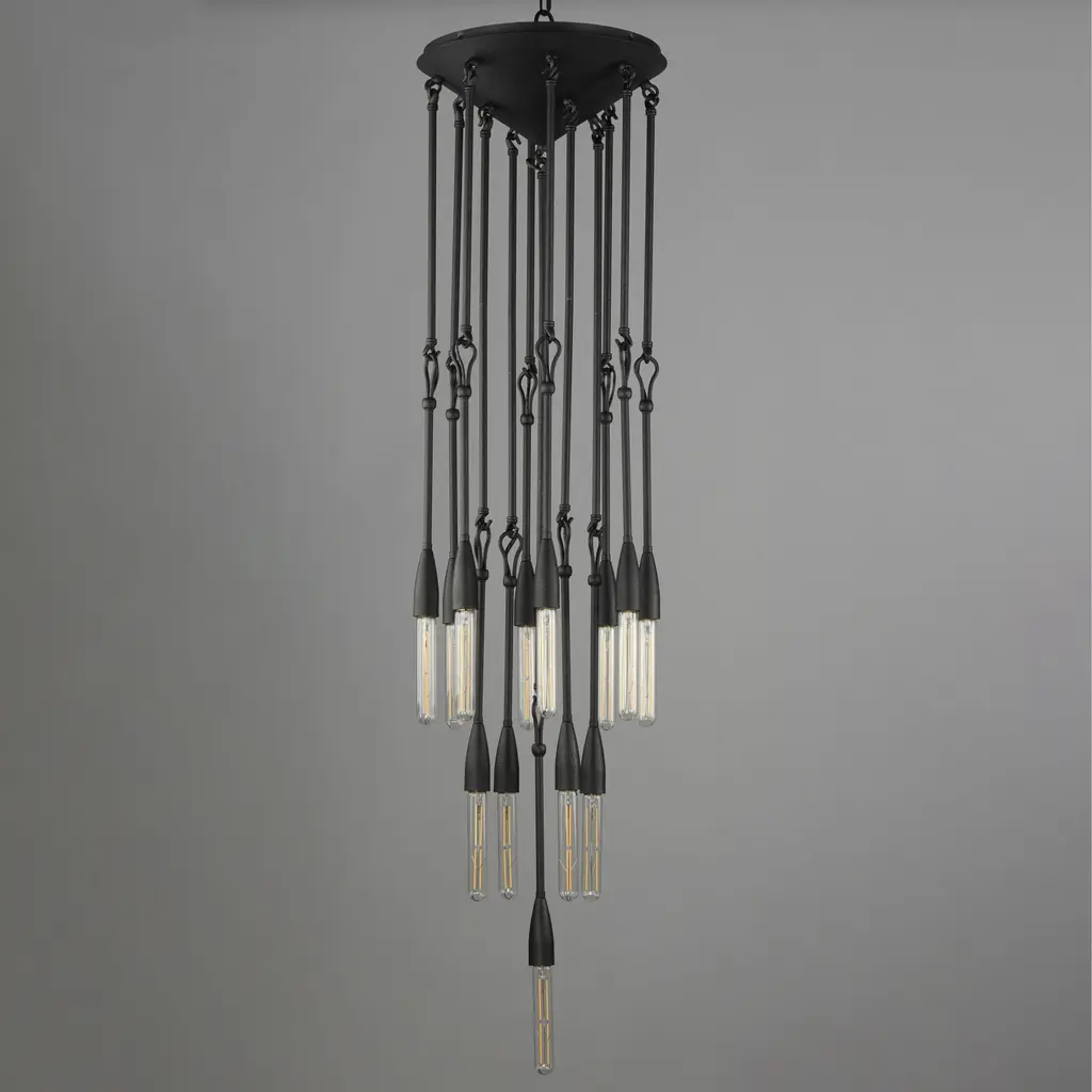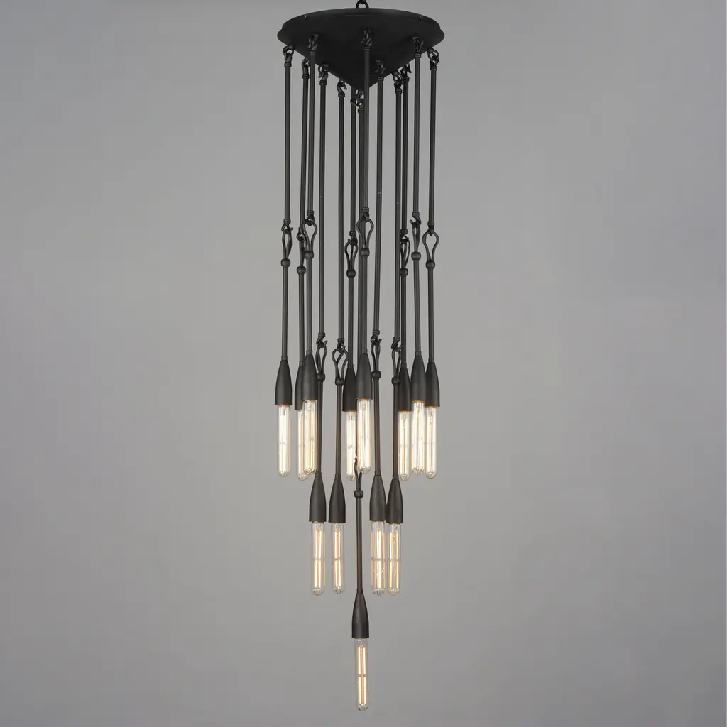 Simple and rustic, elongated metal rods are tiered with forged iron hook and loop details and in multiple configurations. The fixtures are finished in a textured Anthracite finish that adds to the forged iron craftsmanship. Available in multi-pendant configurations as well as a single pendant and sconce. Use tubular filament lamps to accentuate the verticality of the design.
