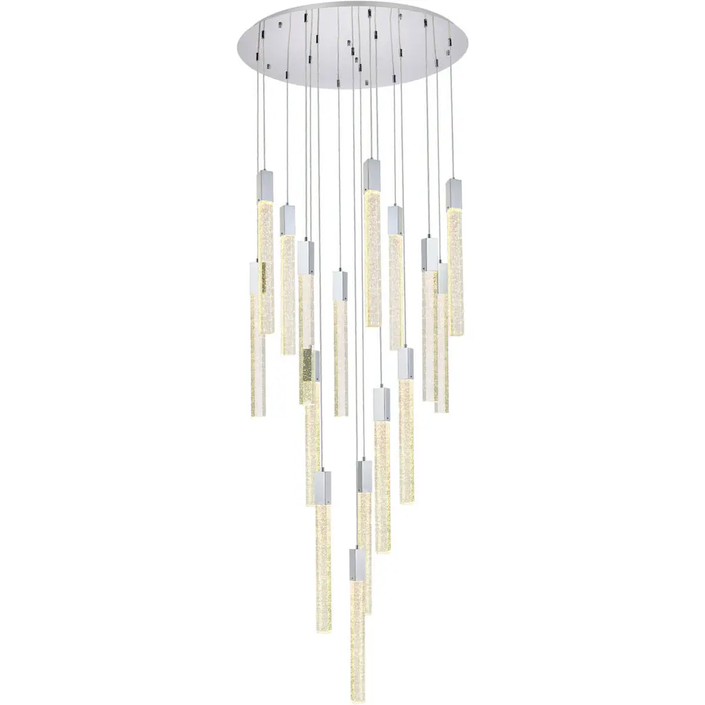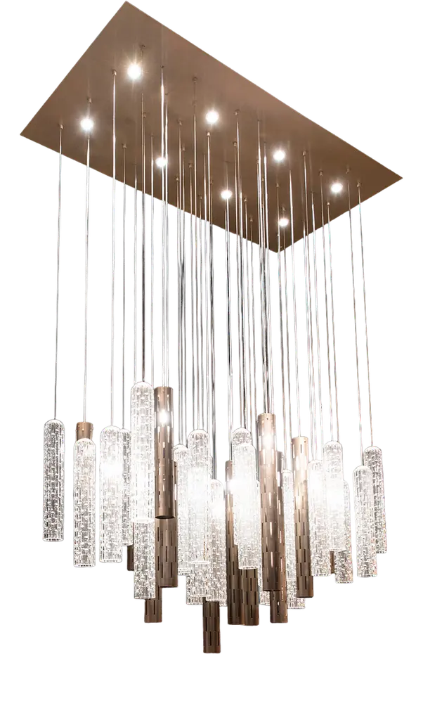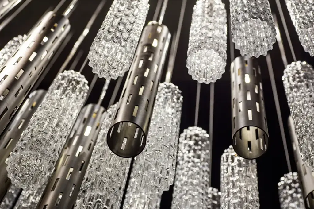 Chandelier made of Murano glass pipes and iron pipes in glossy brass, with LED spotlights in the ceiling.