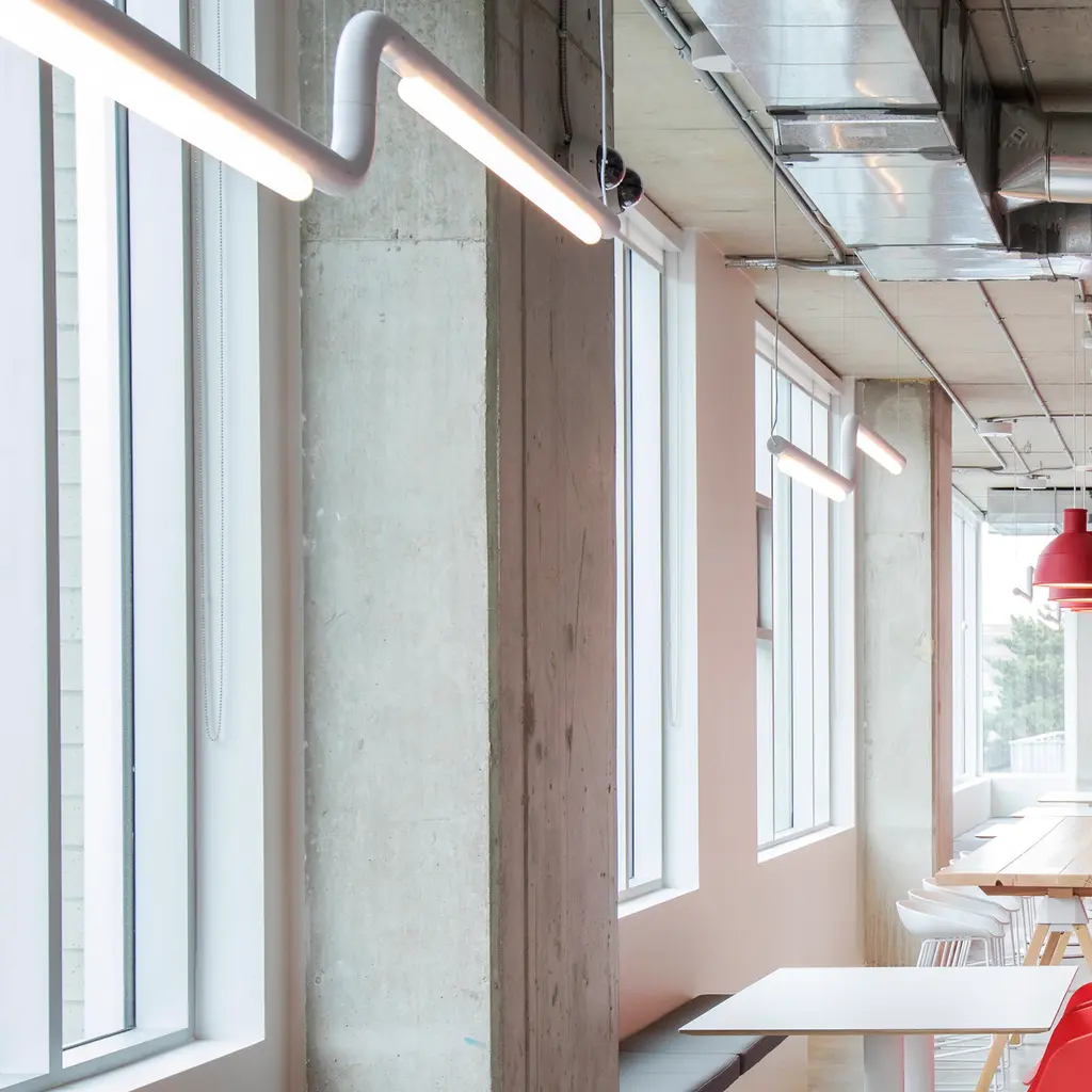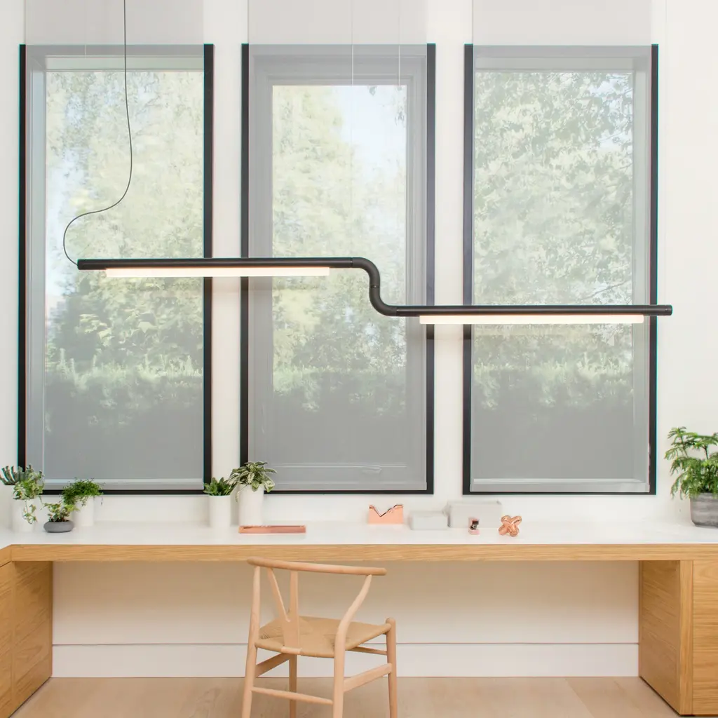 Extending a length of gently diffused LED light, Pipeline CM3 is a curved linear expanse that elegantly holds its own but can also be combined with similar straight and angled segments for a completely customizable installation. The brainchild of designer Caine Heintzman of Vancouver-based A-N-D, the suspended pendants can be oriented for specific lighting needs and expanded to suit even grandly scaled proportions.