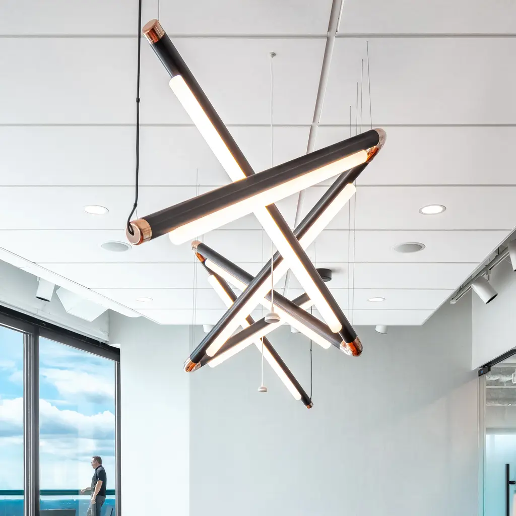 A-N-D cofounder and designer Caine Heintzman adds a theatric geometric construction to the Pipeline linear pendant series. With the aplomb of an abstract sculpture, CM9 would be an equally dramatic cynosure poised over a kitchen island or above a conference table. Available in a selection of metal finishes, the tubular fixture emits multidirectional glowing LED illumination while definitely stealing the show.