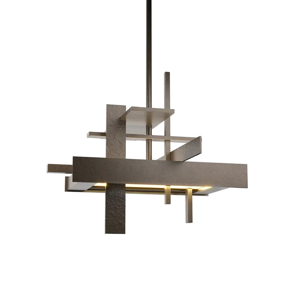 Named after the planar surface of the LED guide plate, the Planar family was inspired by Frank Lloyd Wright's Fallingwater home. The geometric interplay of lit, glowing planes and steel surfaces that are both heavily textured and smooth embraces the function of LED with Hubbardton Forge's brand and the transitional arts and crafts aesthetic. The Planar collection offers two sizes of pendants. All pieces have a color temperature of 2700K, are dimmable and are available in a choice of finish. Features