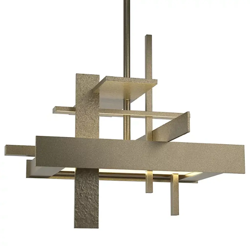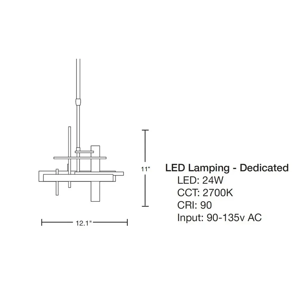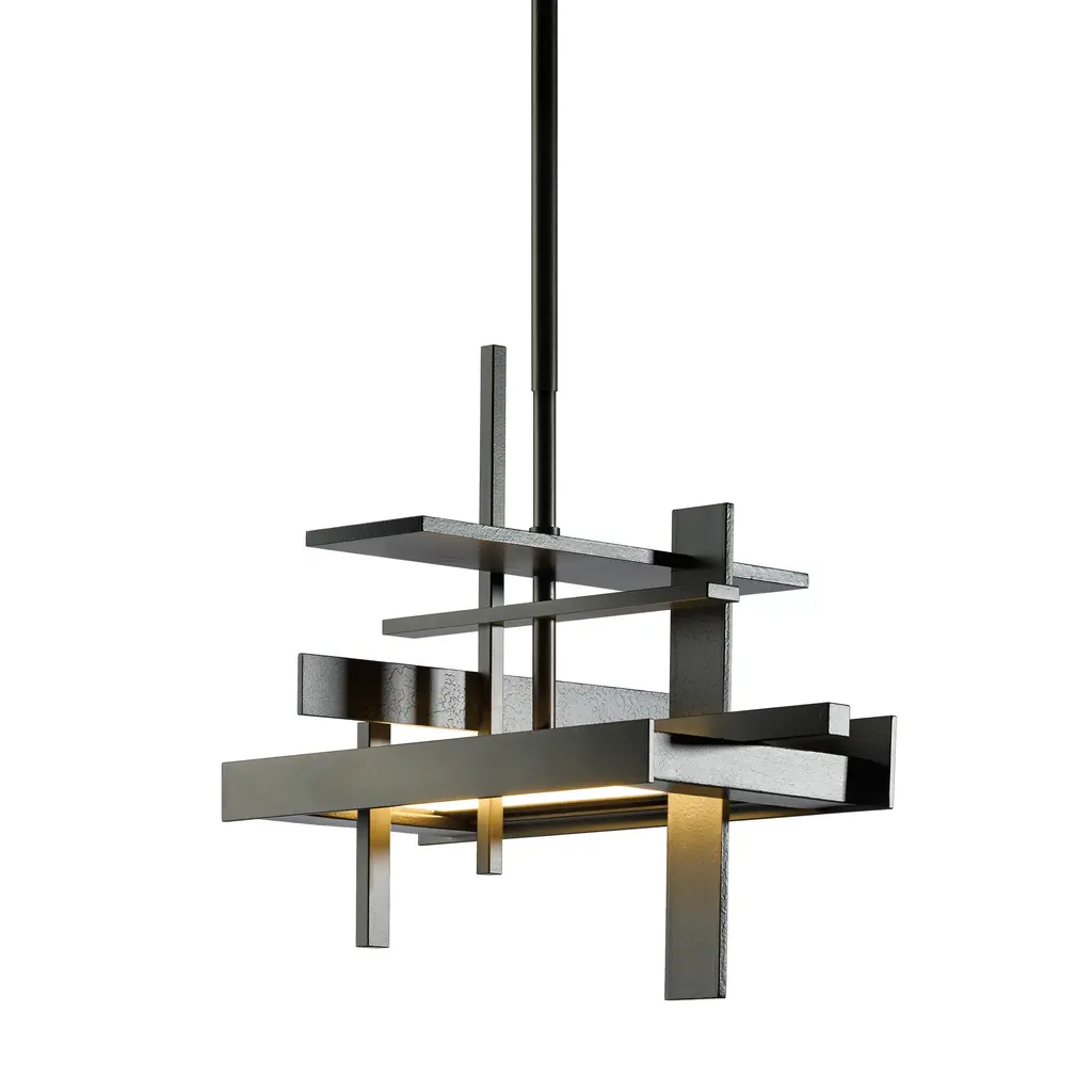 Named after the planar surface of the LED guide plate, the Planar family was inspired by Frank Lloyd Wright's Fallingwater home. The geometric interplay of lit, glowing planes and steel surfaces that are both heavily textured and smooth embraces the function of LED with Hubbardton Forge's brand and the transitional arts and crafts aesthetic. The Planar collection offers two sizes of pendants. All pieces have a color temperature of 2700K, are dimmable and are available in a choice of finish. Features