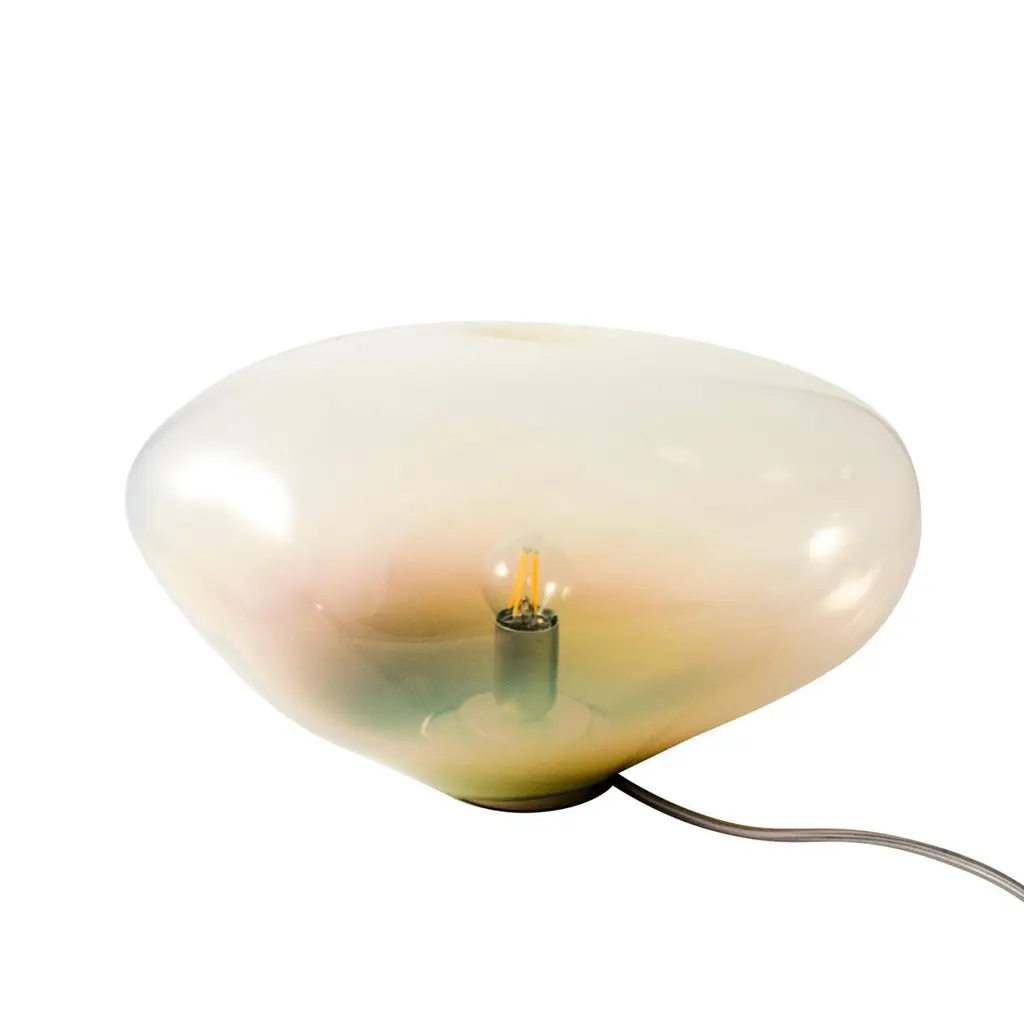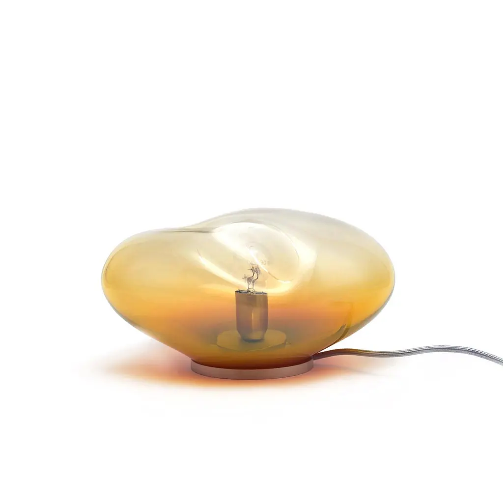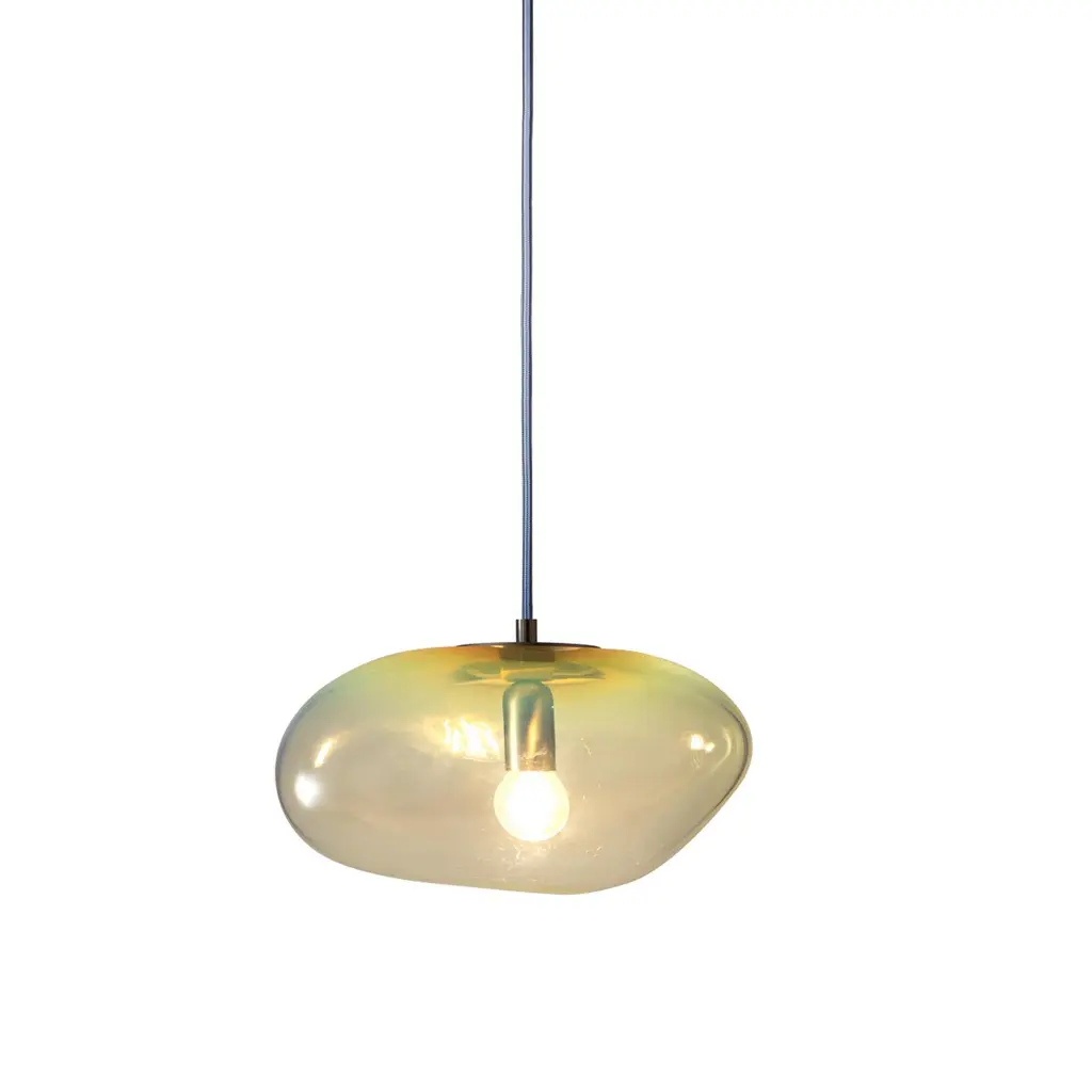 Planetoide Airisi amber iridescent pendant by EloaNo UL listed Material: glass, steel, silver, LED bulbDimensions: D30 x W30 x H250 cmAlso available in different colours and dimensions.All our lamps can be wired according to each country. If sold to the USA it will be wired for the USA for instance.Planetoids are small asymmetrical objects that float delicately in space. Combine their various forms and colors to custom design the celestial ambience of your room. Planetoids are available as individuals or in trios, quartets, quintets, etc for creating infinite variations of your own, personal constellations.Light objects float weightlessly in space. Fragile, iridescent, timeless. ELOA is amodular lighting system composed of unique handcrafted glass pieces. Select from a variety of hand-blown forms, which are one of a kindin shape, size andcolor - unique.Solitary or in constellation, the Eloa lights create individual light concepts andassociate with star constellations. Each glass piece is named after a star or a planet.They exist as hanging, floor, standing and wall luminaries.Eloa combines the craft of ancient glassblowing with a simple, yet distinct design.In order to achieve the large size of the glass objects and working without forms, it takes a high level of refined craftsmanship and skill performed by only a few master glassblowers.