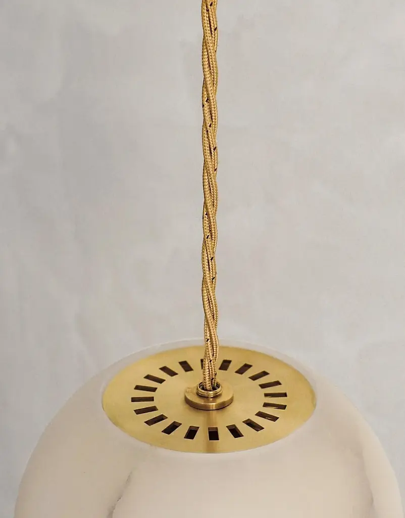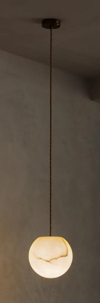 Planette Cable 16.5 Pendant by ContainDimensions: Ø 16.5 x H 100 cm (custom lenght).Materials: Alabaster, brass, optical lens.Also available in different finishes and dimensions (Ø12 cm / Ø16,5 cm / Ø18 cm x custom length). Please contact us.All our lamps can be wired according to each country. If sold to the USA it will be wired for the USA for instance.“You are where you live” So, we decided to live in Mallorca. We are Mauricio Obarrio and Juan Peralta and Contain is our lighting and furniture design studio.This collection is the result of the collaboration between our studio, local artisans and the industrial sector; where creativity and simplicity creates a unique synergy and generates a narrative between the materials used and the pieces created.Our mission is to deliver artisan crafted, highly engineered, sophisticated yet simple lighting design solutions. Our studio's inspiration is fueled by an obsession with natural materials such as brass, glass, and hardwoods along with a love for artisan craftsmanship.