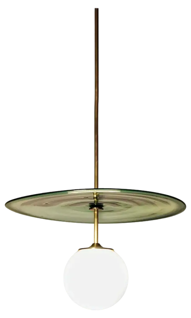 Plat pendant 45/47 by contain dimensions: ø 45/7 x h 100 cm (custom length). Materials: brass structure, opal glass and blown glass from local production. Available in different finishes. Available in two diferents diameters: 40/42 cm ø x (custom length) / 45/47 cm ø x (custom length). Please contact us. All our lamps can be wired according to each country. If sold to the usa it will be wired for the usa for instance. up to 250v (europe/uk standard).