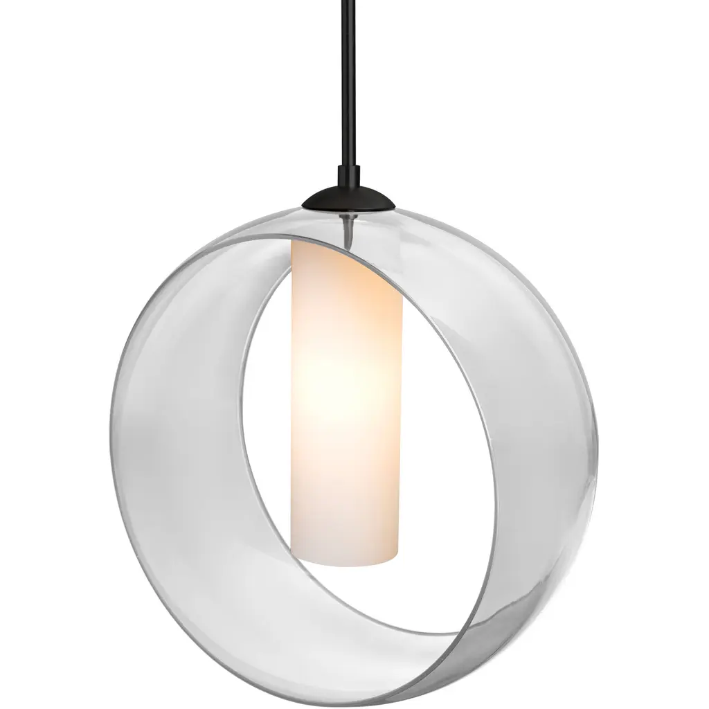 The Plato is a playful double-glass pendant, with a globe-shaped opal glass centered in a radiused outer transparent glass ring. Our Trans-Smoke colored blown glass complements the soft white Opal cased glass, which can suit any classic or modern decor. Opal has a very tranquil glow that is pleasing in appearance, as the Trans-Smoke glass sparkles with the accents from that glow. The smooth satin finish on the opals outer layer is a result of an extensive etching process. This blown glass combination is handcrafted by a skilled artisan, utilizing century-old techniques passed down from generation to generation. The cord pendant fixture is equipped with a 10' SVT cordset and a low profile flat monopoint canopy. These stylish and functional luminaries are offered in a beautiful Black finish.