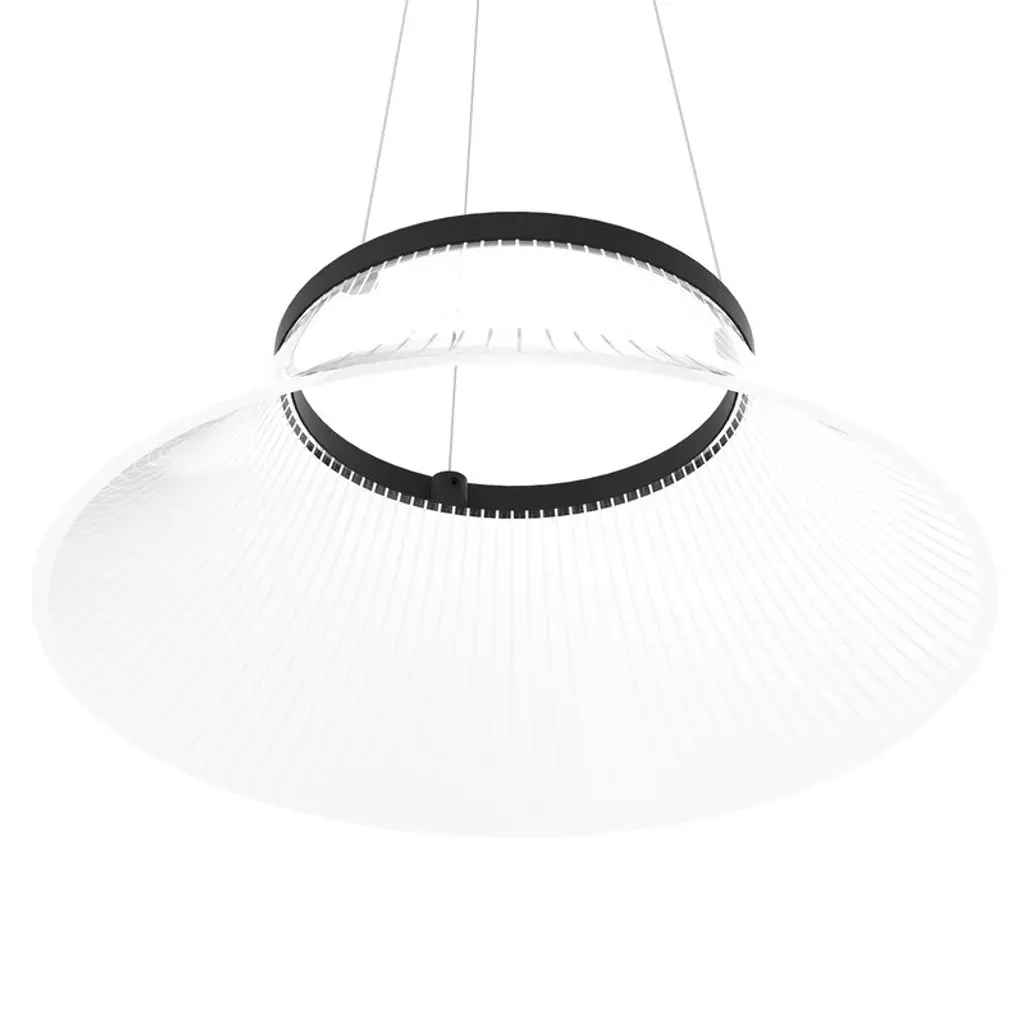 The Plissé pendant by Martinelli Luce is a subtle yet decorative ceiling lamp, perfect, for example, over a dining table. Designed by Emiliana Martinelli, Plissé consists of a light source hidden inside a gray aluminum ring as well as a plastic diffuser with laser engraved lines that, together with the light, create a beautiful pattern and an outline for the transparent shade. Hanging on three wires, the pendant illuminates softly and pleasantly - the light’s tone is a warm white (3000K).