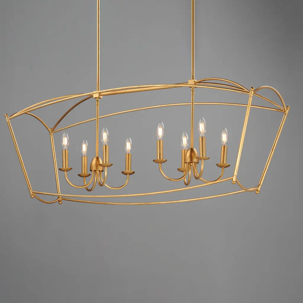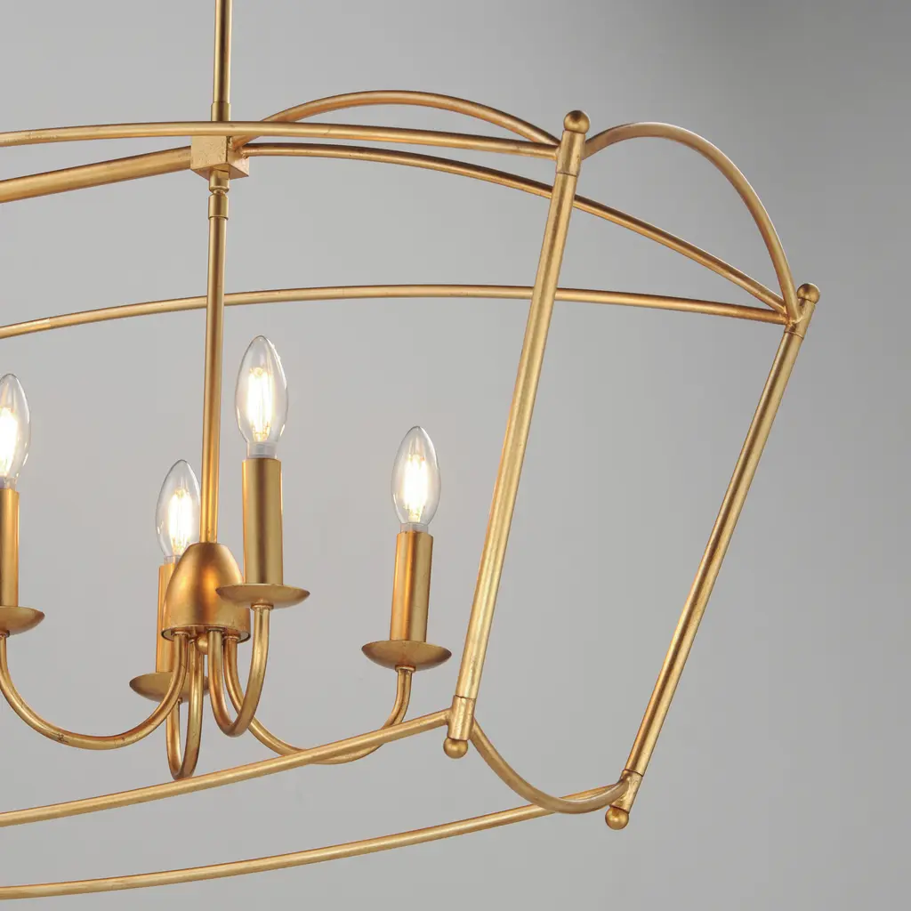 Sweeping metal accents links create classic curves on a minimalist chandelier. Available in hand-rubbed Chestnut Bronze or elegant Gold Leaf finishes. Add crystal accents to elevate the design for a more extravagant glamour. The design manages to evoke French Country charm and enchants any room it illuminates.