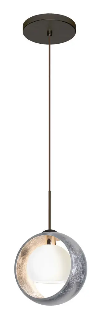 The Pogo is a playful double-glass pendant, with a globe-shaped opal glass centered in a radiused glass ring. Our Silver Foil glass is sparkling and metallic. Distressed metal foil is applied to the inner surface of a glossy clear blown glass. The silver color complements the soft white Opal cased glass, which can suit any classic or modern decor. Opal has a very tranquil glow that is pleasing in appearance, as the silver foil sparkles with the accents from that glow. The smooth satin finish on the opal’s outer layer is a result of an extensive etching process. This blown glass combination is handcrafted by a skilled artisan, utilizing century-old techniques passed down from generation to generation. The 12V cord pendant fixture is equipped with a 10' braided coaxial cord with Teflon jacket and a low profile flat monopoint canopy. These stylish and functional luminaries are offered in a beautiful brushed Bronze finish.