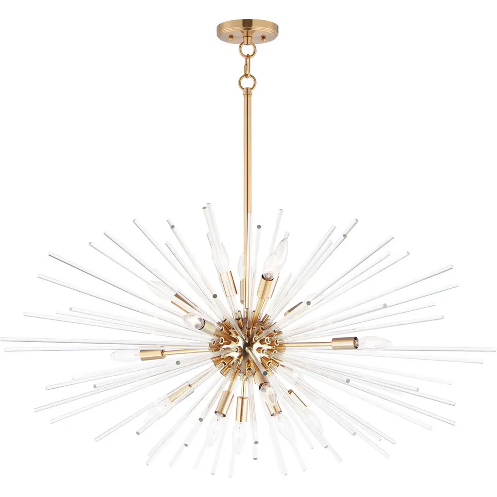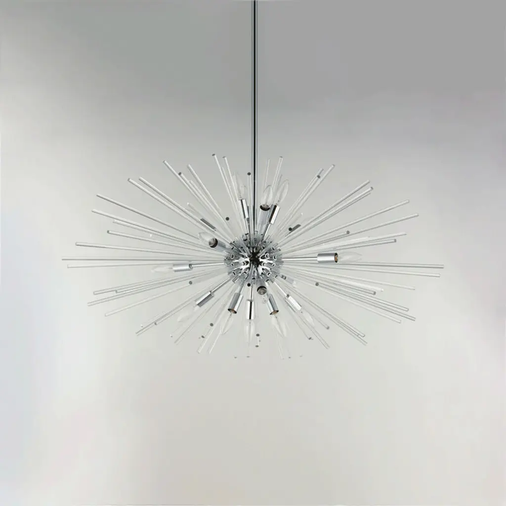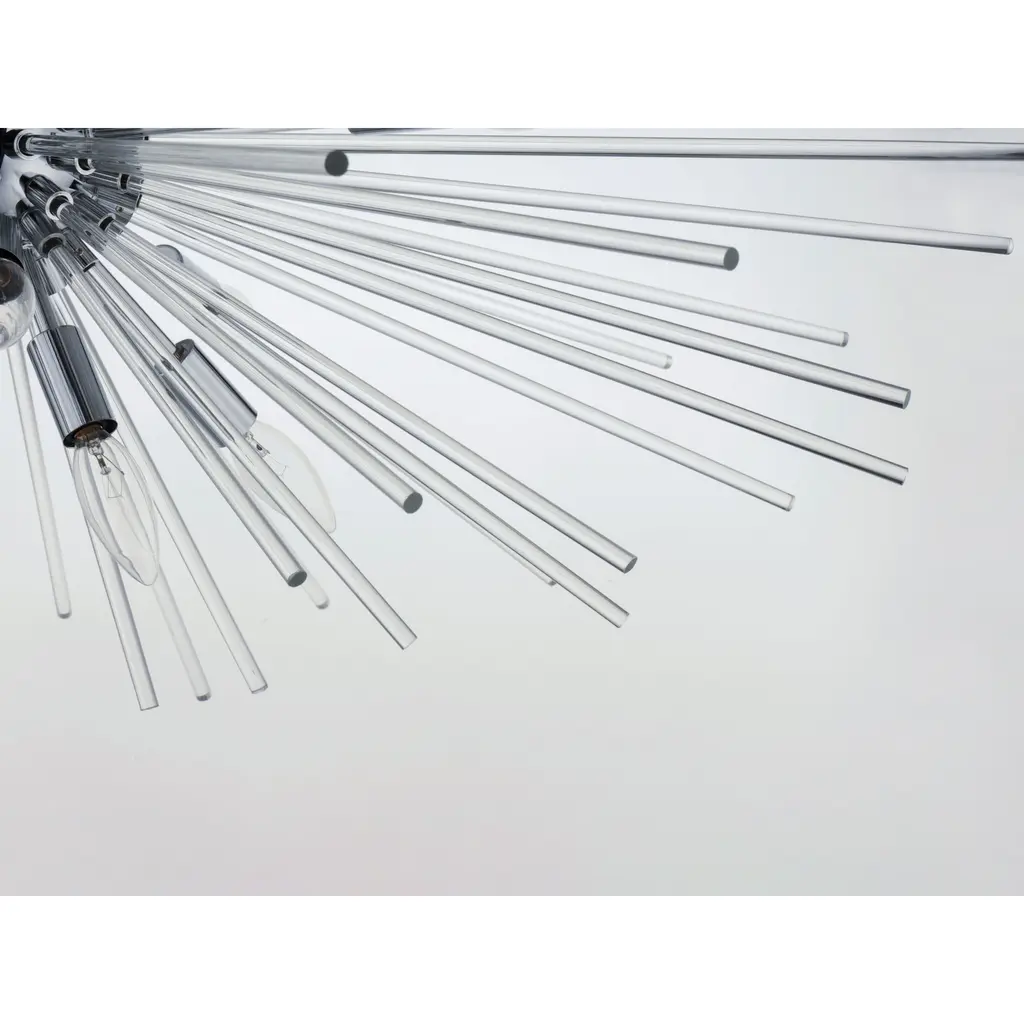 A dazzling burst of Clear glass rods extend from a classic sputnik shape finished in a bright Polished Chrome or warm Satin Brass. Available in two sizes of pendants and as a ceiling fixture, this unique look is a statement piece designed to attract attention.