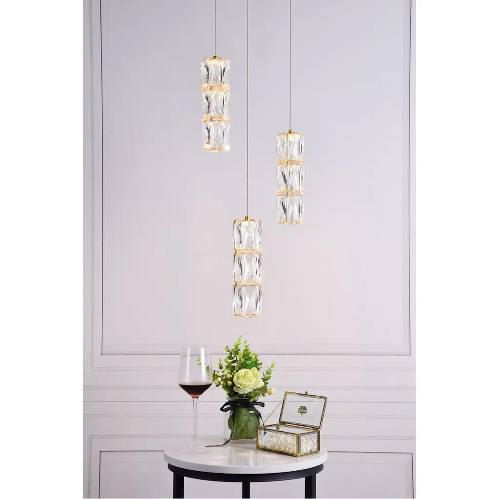 The Polaris collection is the epitome of “cool” in lighting, because each of the fixtures has rectangular, elegant-cut crystals that look like ice cubes, gracefully suspended from a stainless-steel base with a bright gold finish. Designed for rooms with higher ceilings, these fixtures are definitely stylistic attention-getters.