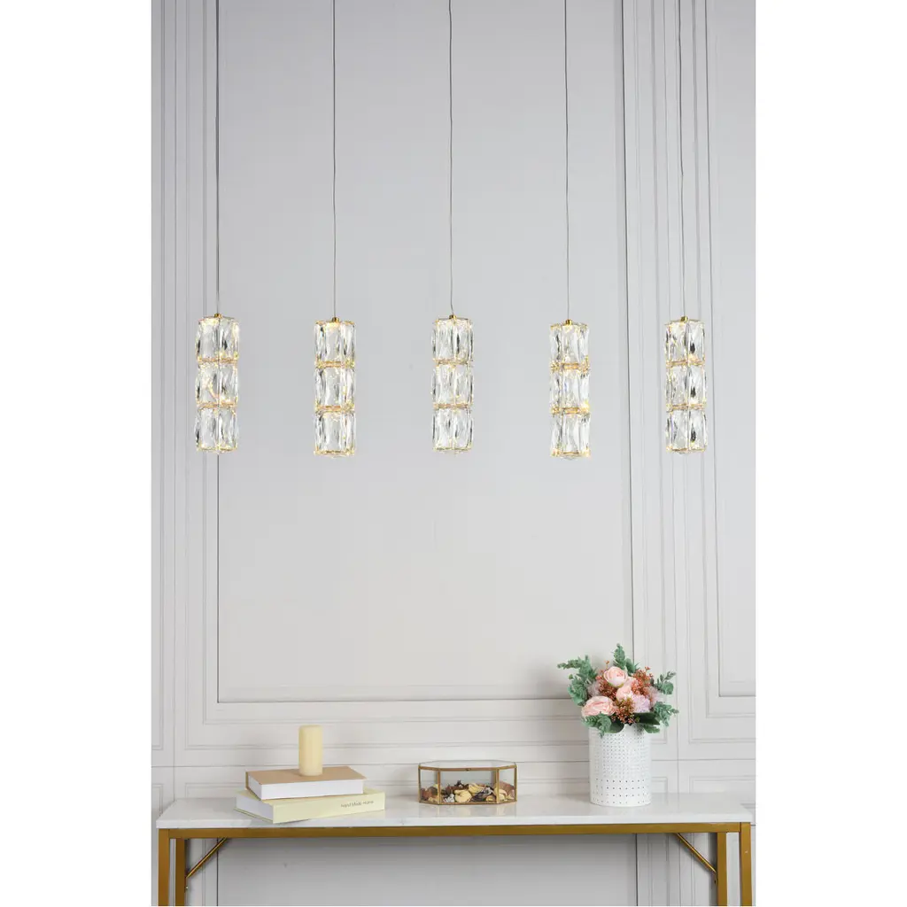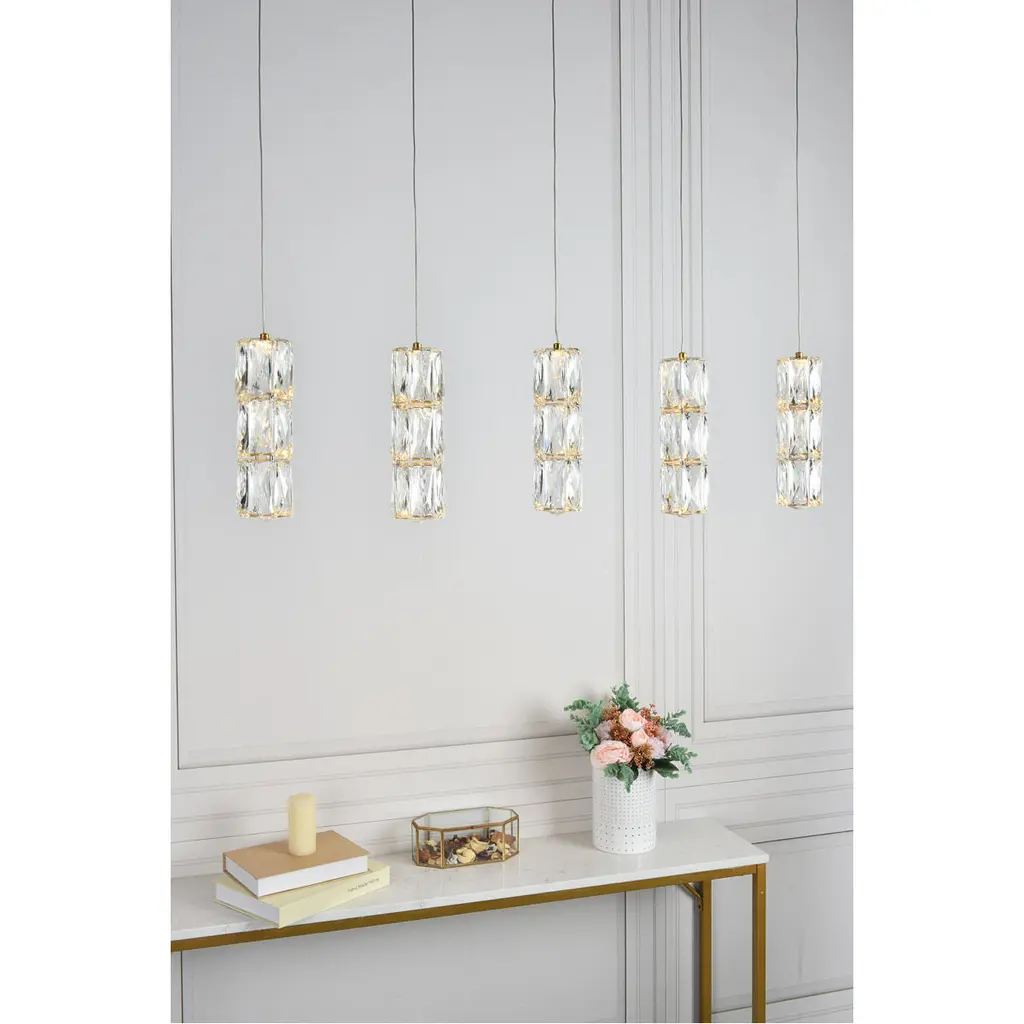 The Polaris collection is the epitome of “cool” in lighting, because each of the fixtures has rectangular, Royal-cut crystals that look like ice cubes, gracefully suspended from a stainless-steel base with a bright gold finish. Designed for rooms with higher ceilings, these fixtures are definitely stylistic attention-getters.