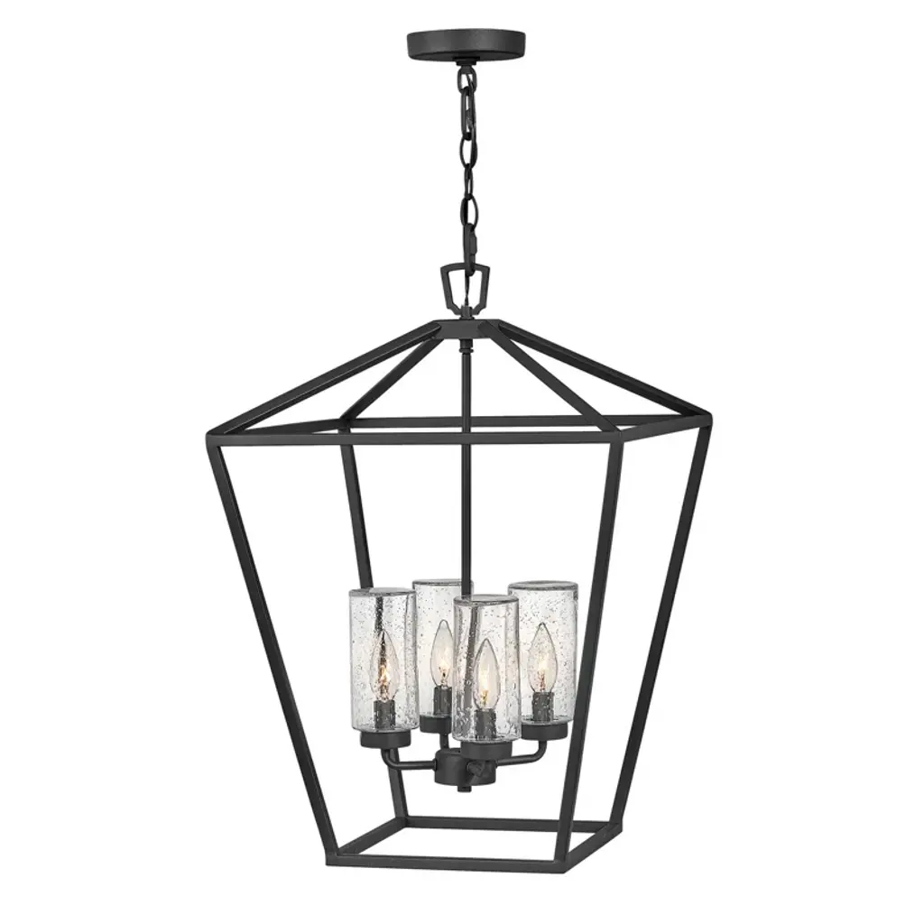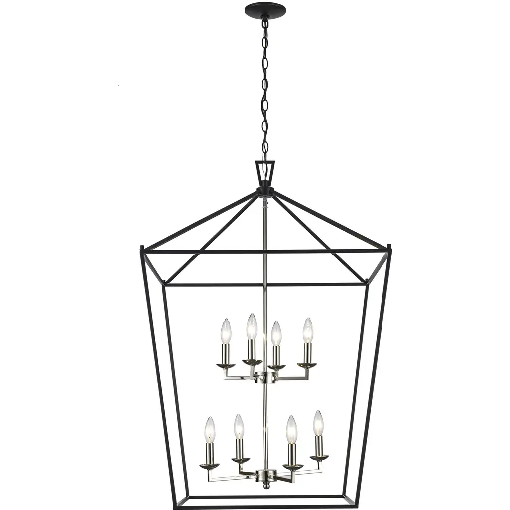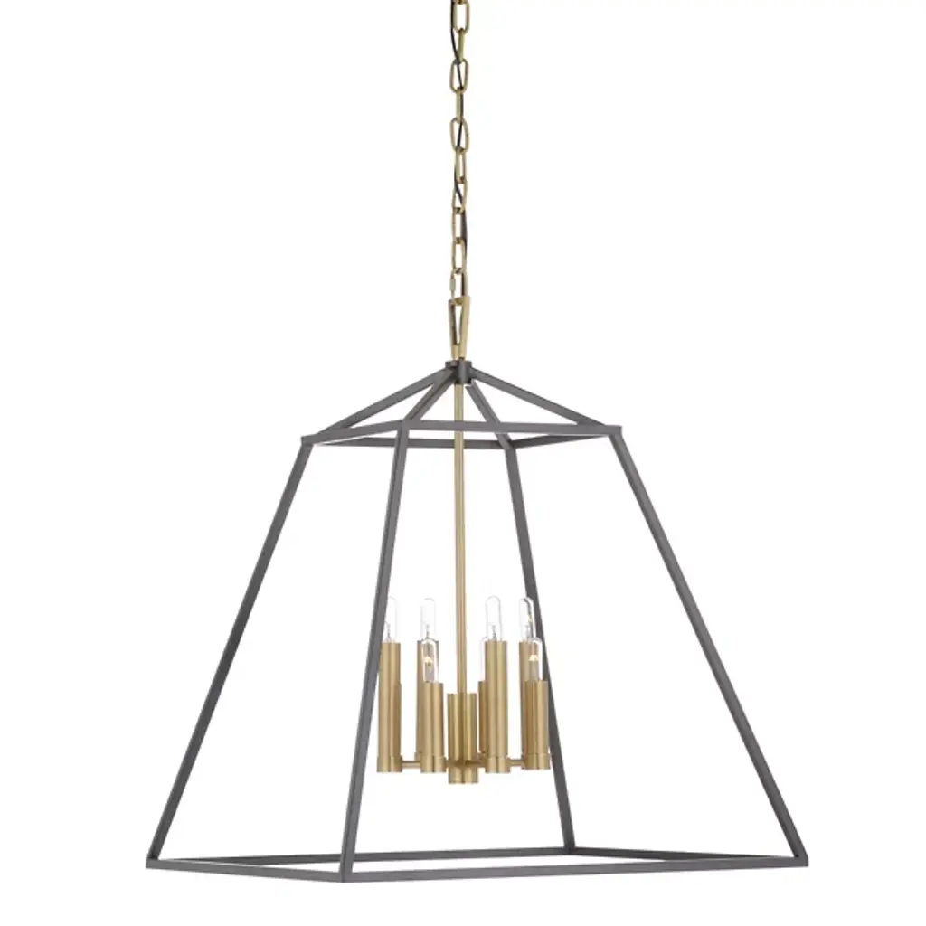 The Poligono Pendant from Wildwood combines iron with warm brass accents in a geometric design that creates depth through contrasting materials. Eight candle-style lights cluster at the center, providing substantial illumination from within the open framework. The pendant comes with a long chain that allows for ideal positioning in spaces with standard or vaulted ceilings. This fixture works well in dining rooms, where the open design prevents it from blocking sightlines across the table. The contrast between the dark outer structure and lighter interior elements creates visual interest even when the lights are off.
