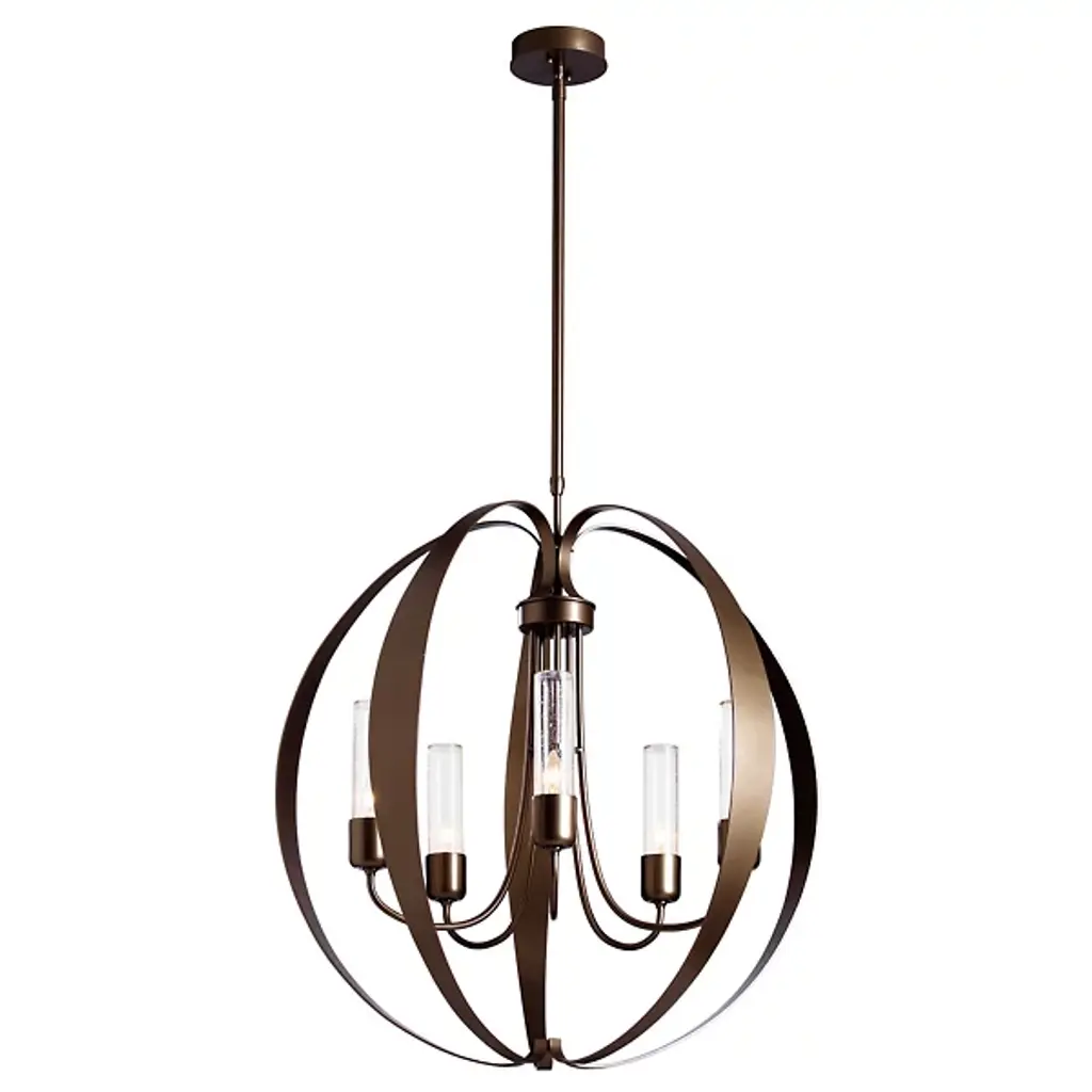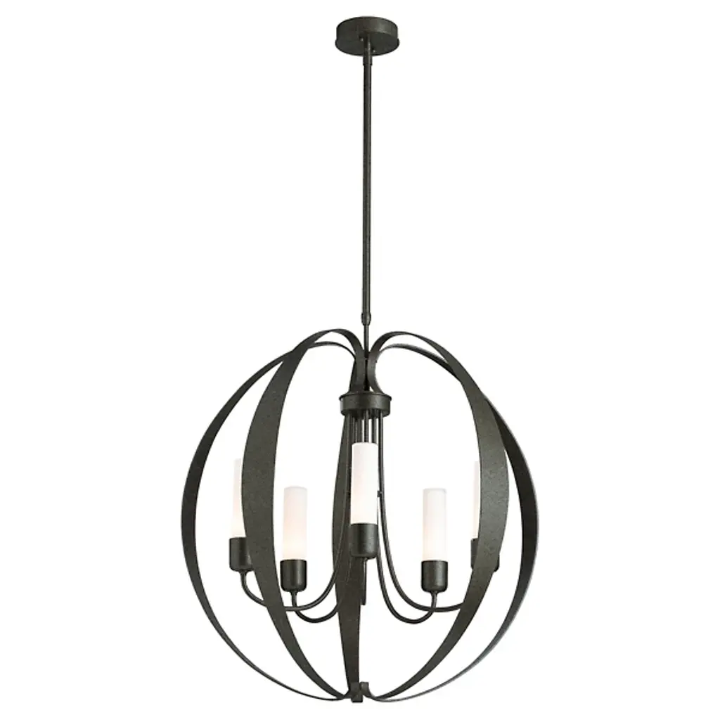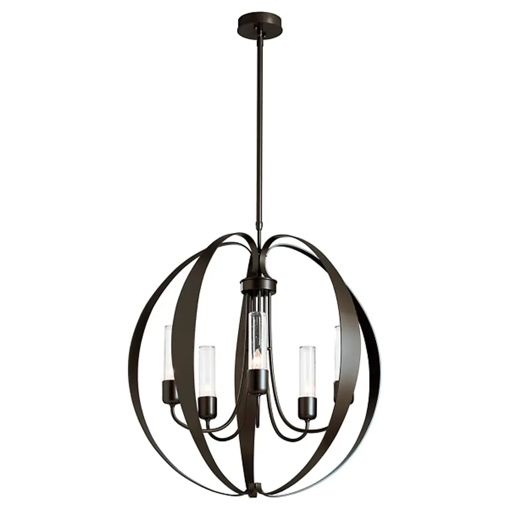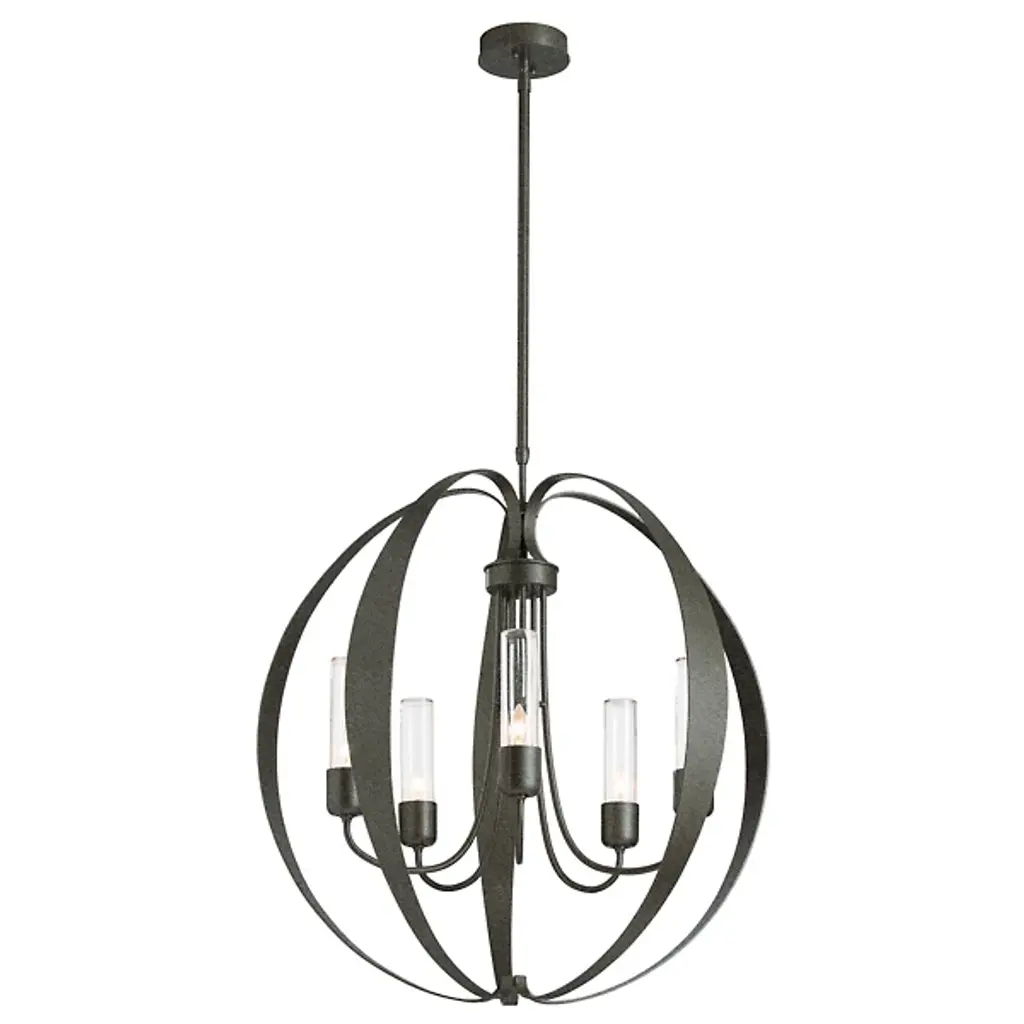 The Pomme Outdoor Pendant by Hubbardton Forge is an openly styled, durable, and delightful design that resembles its namesake with an apple-like form. Handcrafted, smoothly curved metal ribbons create an airy orb that a set of candelabras shine within. Set on an arrangement of arched arms, cylindrical glass shades add a lovely touch to this pendant. A robust outdoor coastal finish allows this elegant and contemporary piece to resist some of the harshest environmental conditions, bringing a bright touch to its surroundings throughout the year.