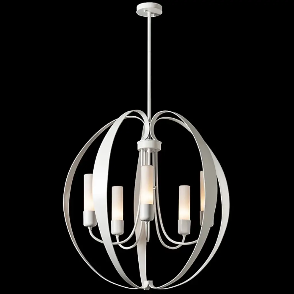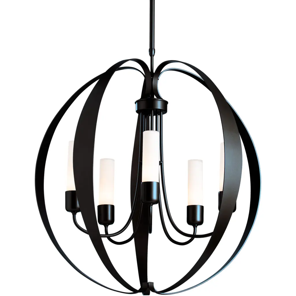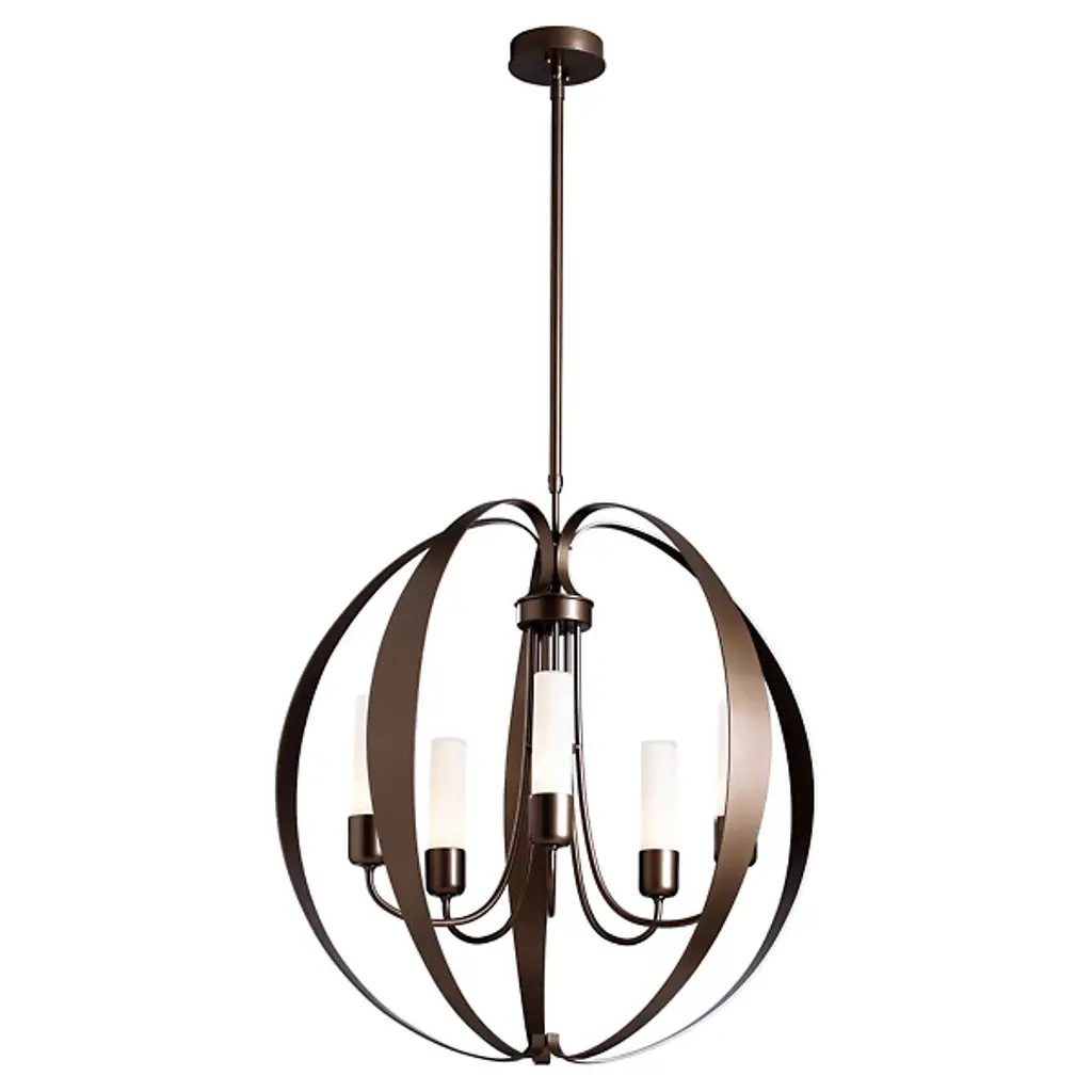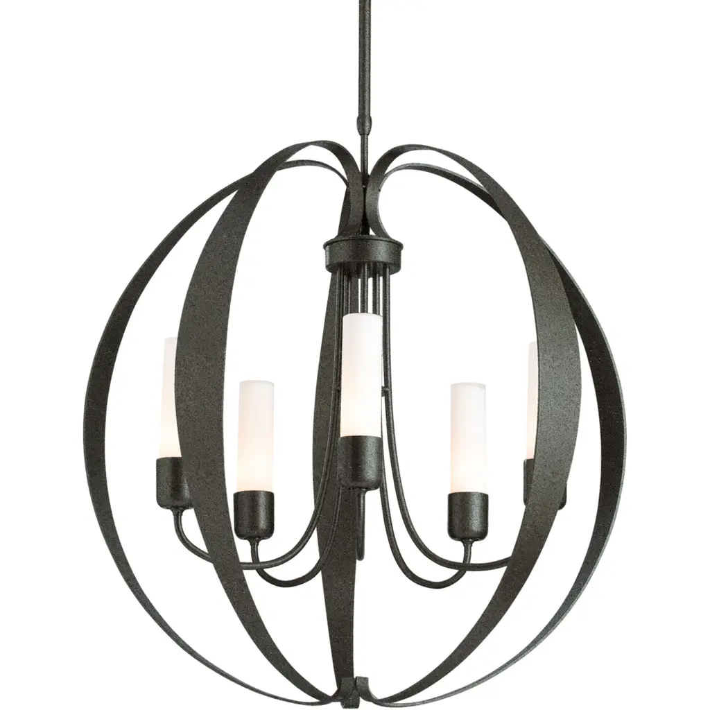 The Pomme Outdoor Pendant by Hubbardton Forge is an openly styled, durable, and delightful design that resembles its namesake with an apple-like form. Handcrafted, smoothly curved metal ribbons create an airy orb that a set of candelabras shine within. Set on an arrangement of arched arms, cylindrical glass shades add a lovely touch to this pendant. A robust outdoor coastal finish allows this elegant and contemporary piece to resist some of the harshest environmental conditions, bringing a bright touch to its surroundings throughout the year.
