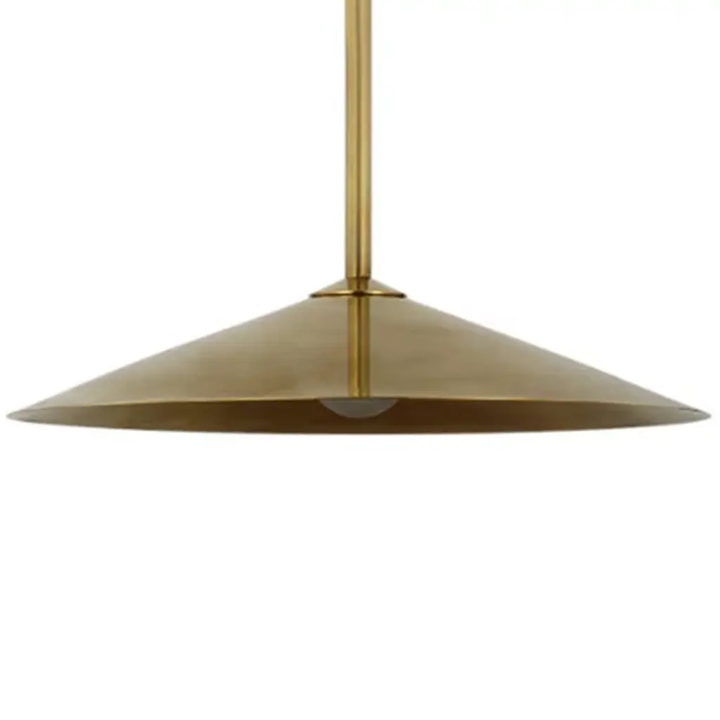The Ponce LED Pendant from Visual Comfort Signature reduces lighting to geometric essentials with its conical brass shade. Light flows downward in a concentrated beam, ideal for task-focused areas requiring directed illumination. Interior designer Amber Lewis brings her signature minimalist sensibility to this pendant through clean lines and honest material expression. The unadorned brass surface develops character over time, gaining a subtle patina that enhances its appeal. Custom height options ensure perfect positioning above kitchen islands, dining tables, or entryway consoles. This pendant excels in both singular installation and grouped arrangements where multiple cones create a choreographed lighting composition.