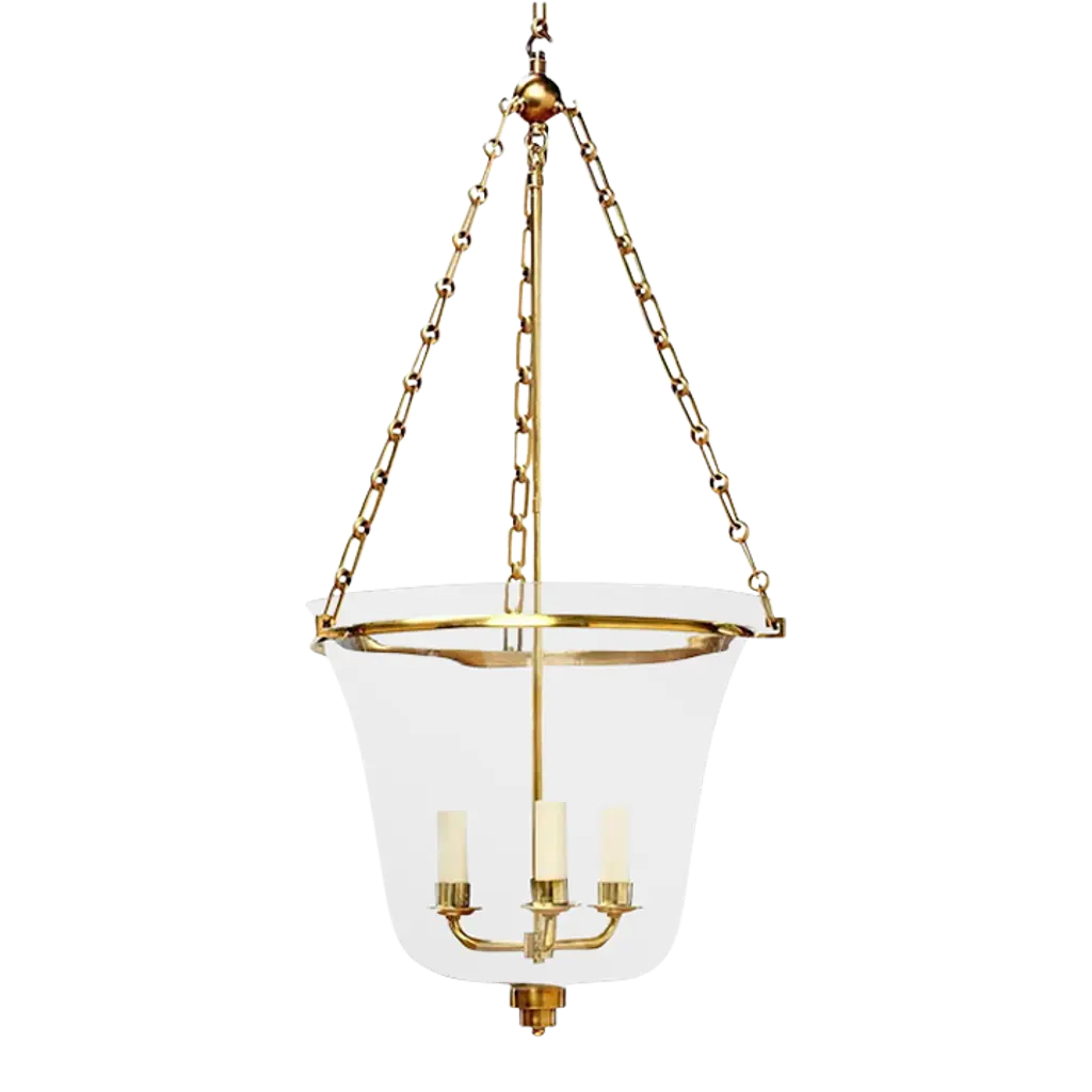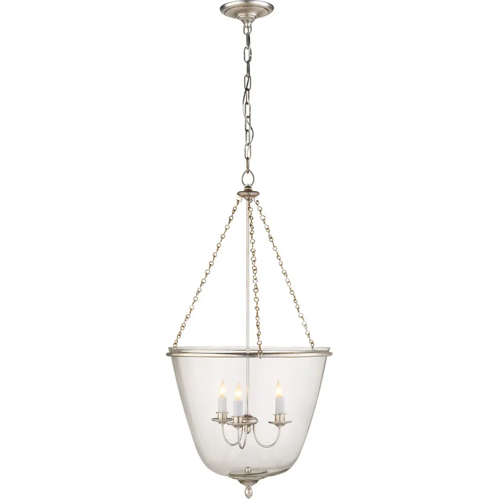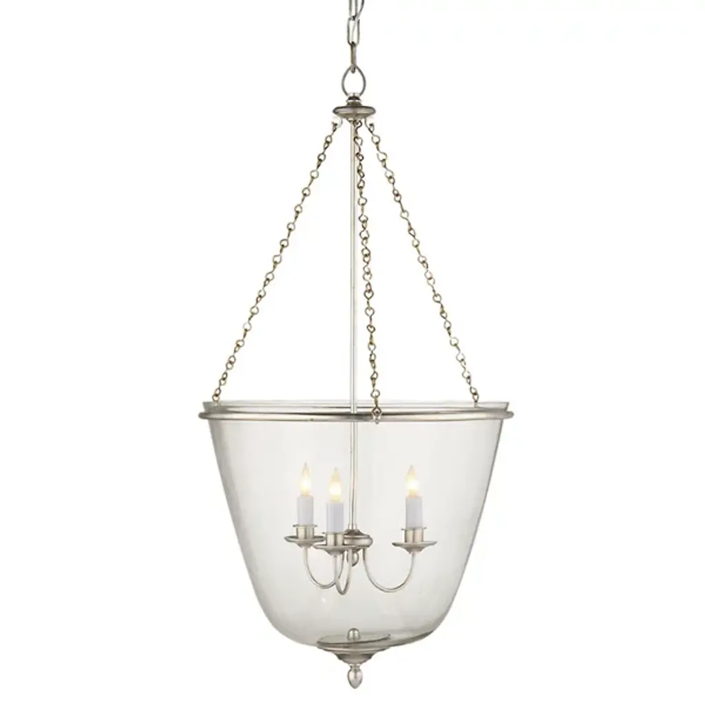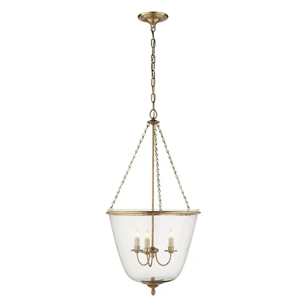 Add a clever, classic presence to inside spaces with the airy, elegant lines of the Pondview Pendant from Visual Comfort Signature, formerly known as Visual Comfort, A retro design with enchanting detail, it descends from a circular canopy along a central chain, ending in a hub that suspends a slim stem and three fine chains below it. The stem descends to a small, finely-wrought array of damp-listed candelabra-style lamps, while the chains support a broad horizontal ring containing an inverted glass dome shade accented by a metal finial. This layered arrangement gentles direct light, transforming it into a pleasing and radiant warmth.