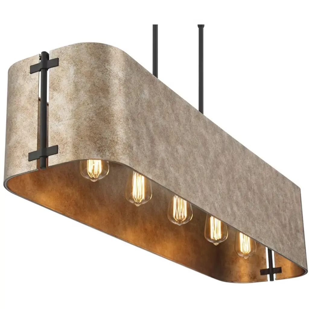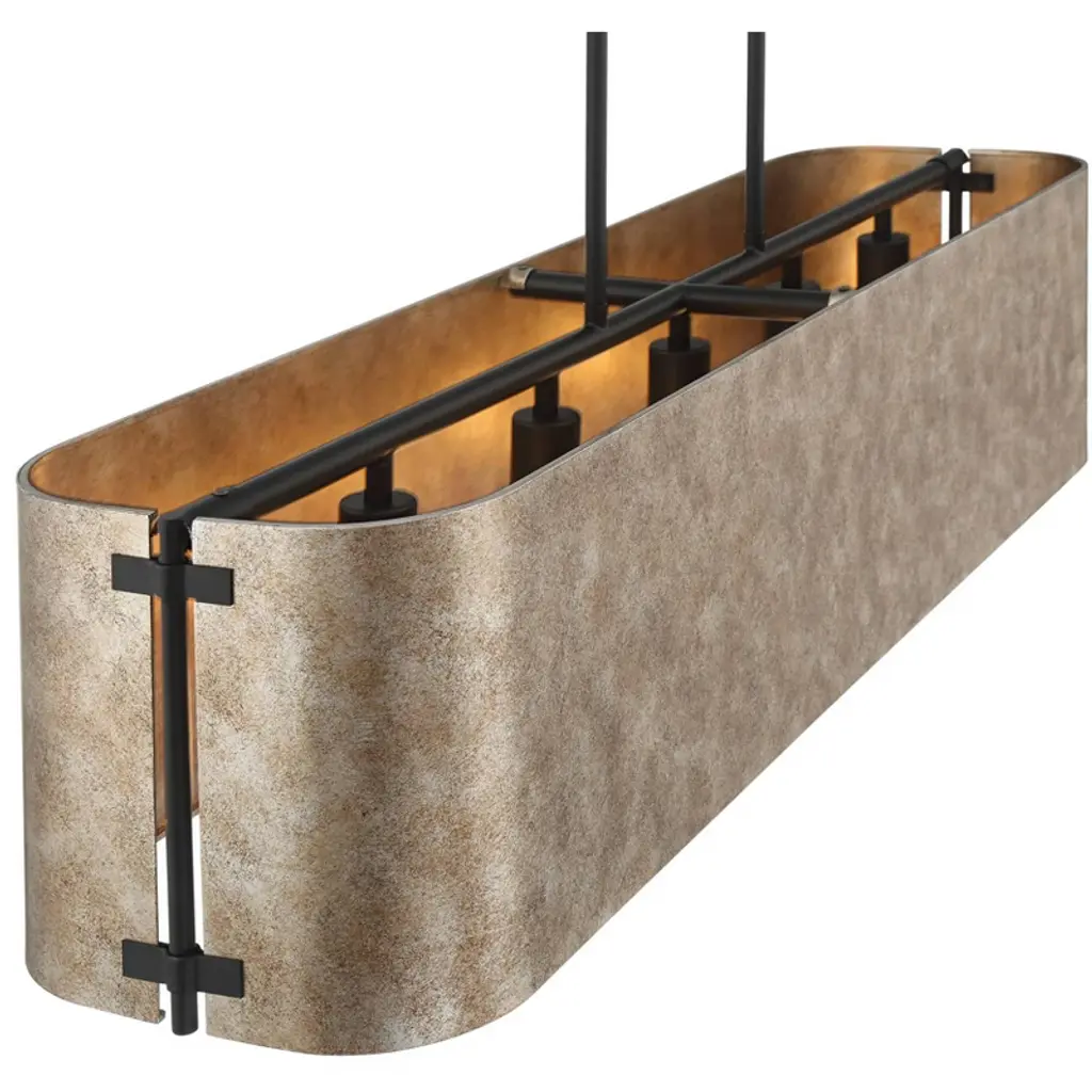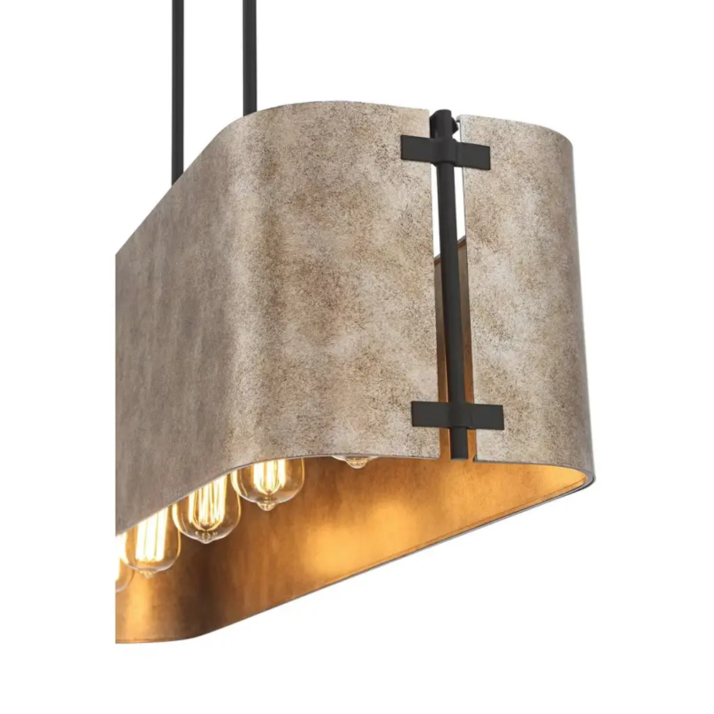 Bring a new look of sophistication to your kitchen or dining room decor with the Julian rustic industrial linear pendant. Ideal for use over long counter or table surfaces, the design features a wide rectangular form with gently rounded ends in a rustic silver finish. Canopy and downrods feature a black finish to complement any space.