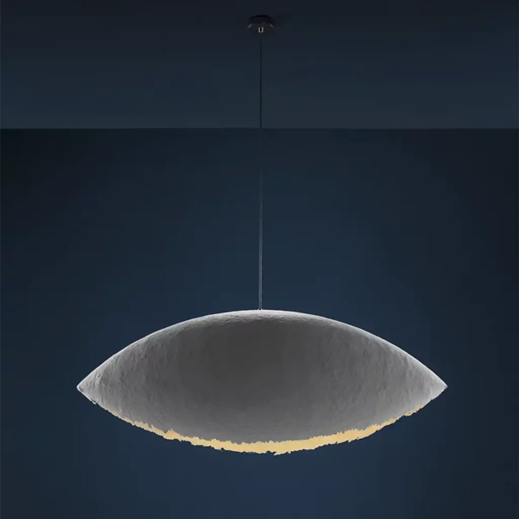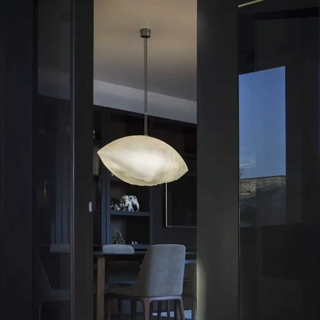 The PostKrisi Pendant from Catellani & Smith is a mood-setting presence, feeling airy yet weighty overhead with a handcrafted fiberglass volume. The single form on display underscores Catellani & Smith’s goal of giving shape to light. All eyes focus on the form by hanging overhead with a visually-disappearing cord suspension. Designed with versatility and strength in mind, the handcrafted fiberglass shade presents itself in a familiar yet abstract silhouette. The wide, pointy shape captivates with rich texture from edge to edge. Its generous opening lets a pool of warm light cast below, leaving behind an artful silhouette