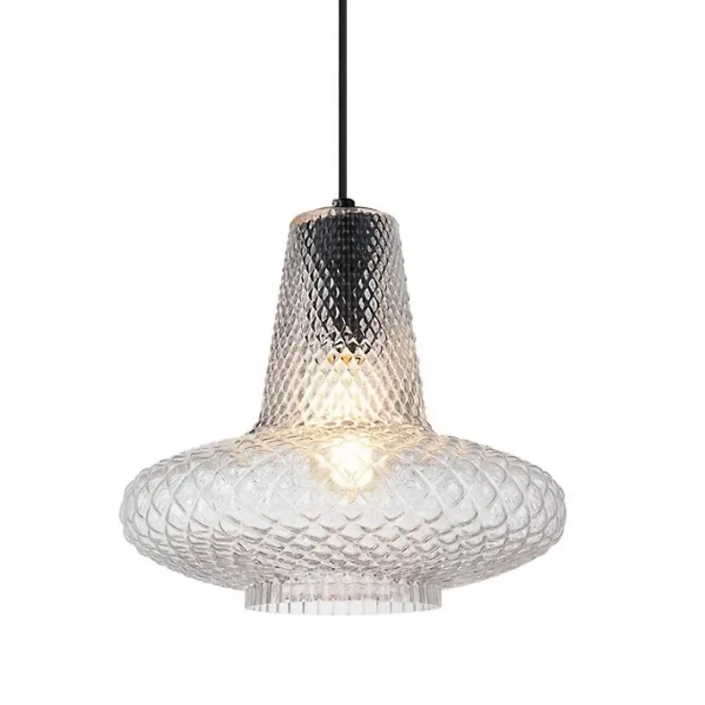 The Potter Pendant by Alder & Ore is an elegant piece with a simple and classic silhouette. With a vintage inspiration, a lovely diamond textured glass with a tapered top, oval center and an open, round base create a shapely space for light to filter through. A fabric-wrapped cord supports this pendant, and the pattern along its surface brings a pretty touch to the spaces it brightens, lending them both a layer of practical and ambient light.