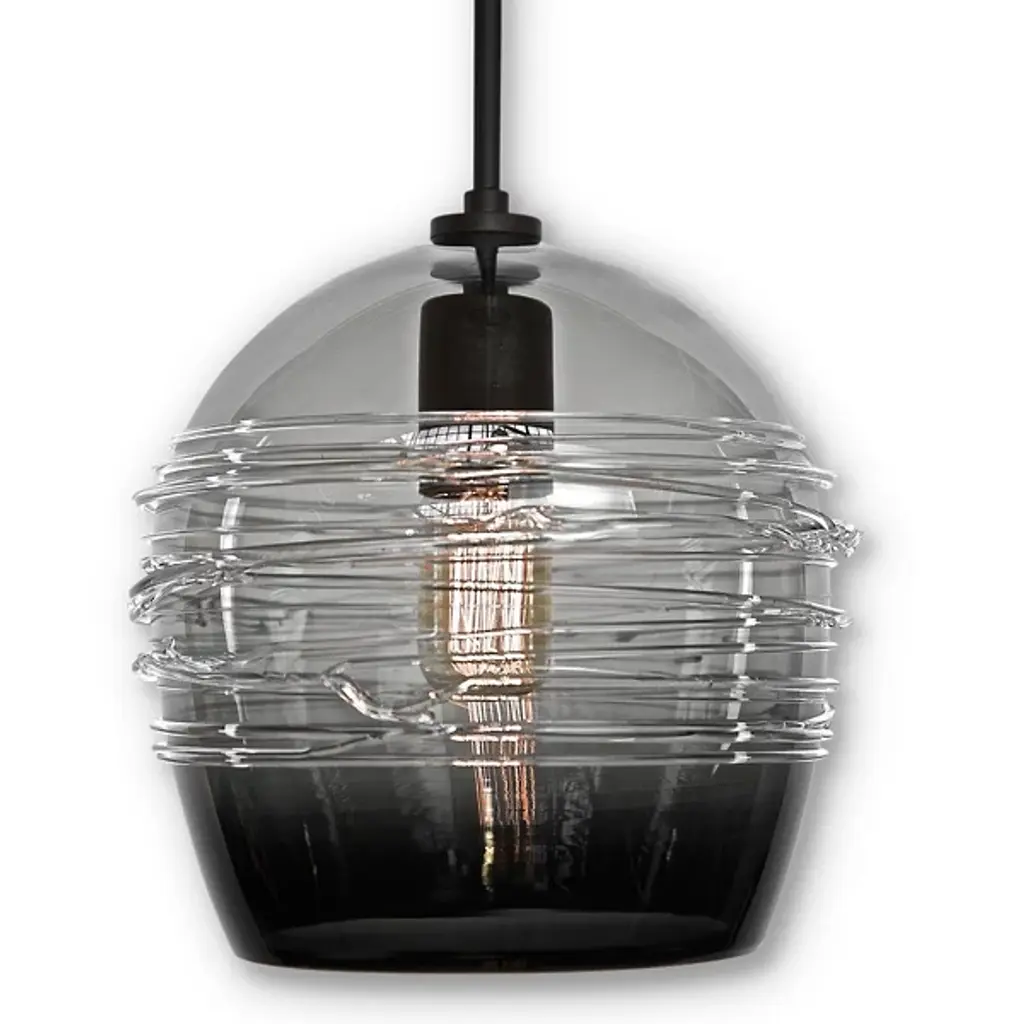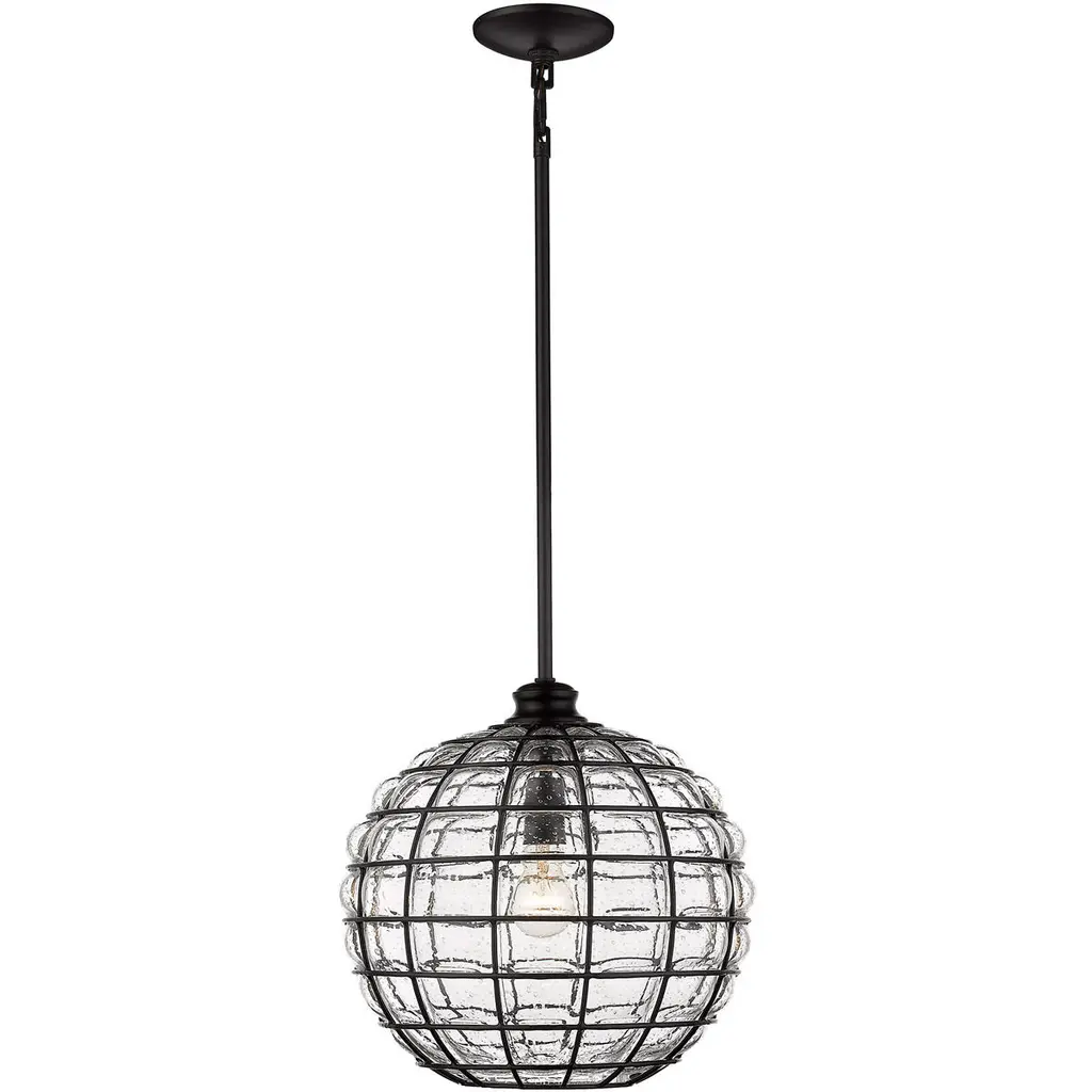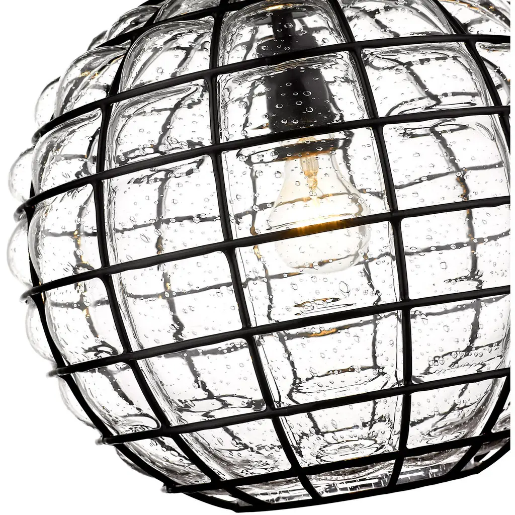 Powell is a collection of lovely glass and metal pendants. The decorative, mixed materials of the shades are the focus of these contemporary fixtures. To allow the shades to take center stage, the remaining matte black hardware is kept simple by design. Composed of curved iron, the shade’s metal ribbing forms an elongated sphere. Open at the bottom and handblown by artisans, the structured glass has an industrial-modern feel. During the blowing process, hot, molten glass pours through each crevice creating raised bubbles along the surface. As it cools, the seeded glass clings to the grid-like metal cage. When lit, the gently diffused shades have a unique glow. Beckoning onlookers, these lights add visual interest anywhere they hang.