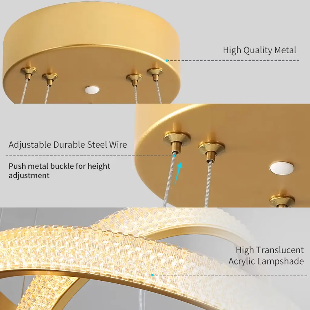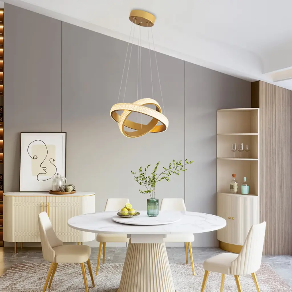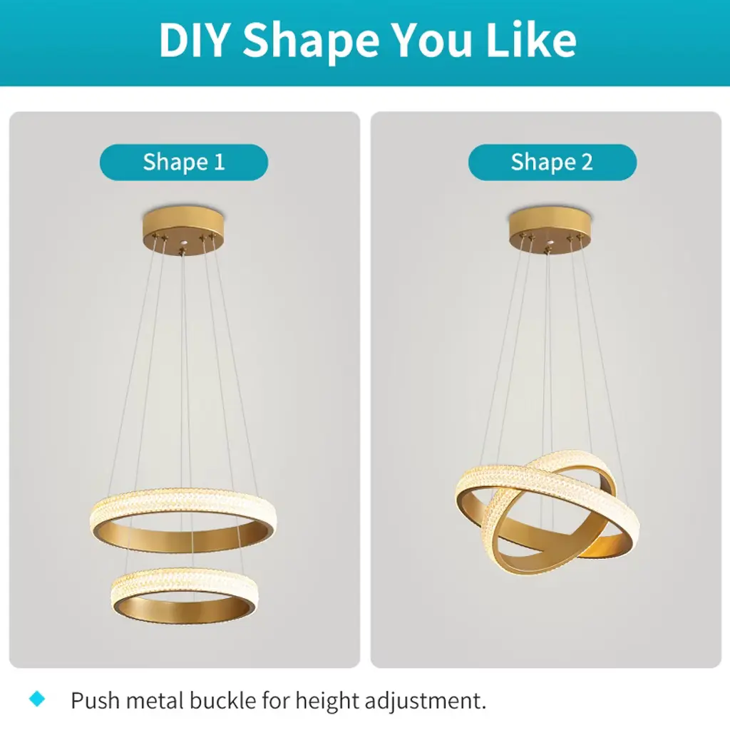 This innovative pendant light combines sleek design with creative flexibility. The unique design enables you to customize the form of the pendant light to your liking. Our pictures show two installation methods. The high-quality metal frame features an adjustable steel wire system - simply push the metal buckle to modify the height to your preference. The high-translucent acrylic lampshade diffuses 4000K neutral white light (34W integrated LED) for bright, energy-efficient illumination. If you are also a DIY enthusiast, choose our LED pendant light and unleash your creativity!