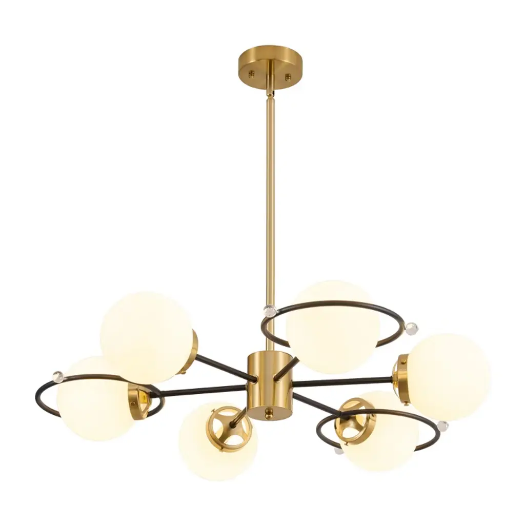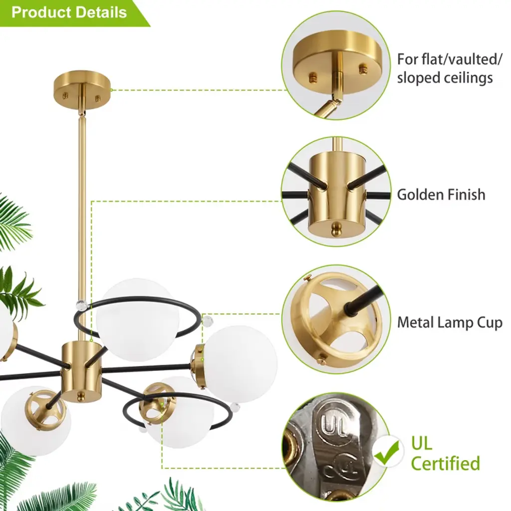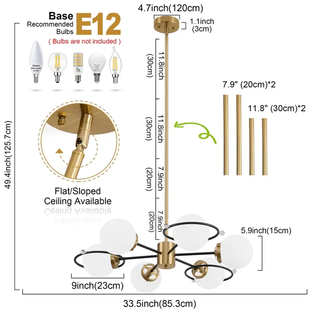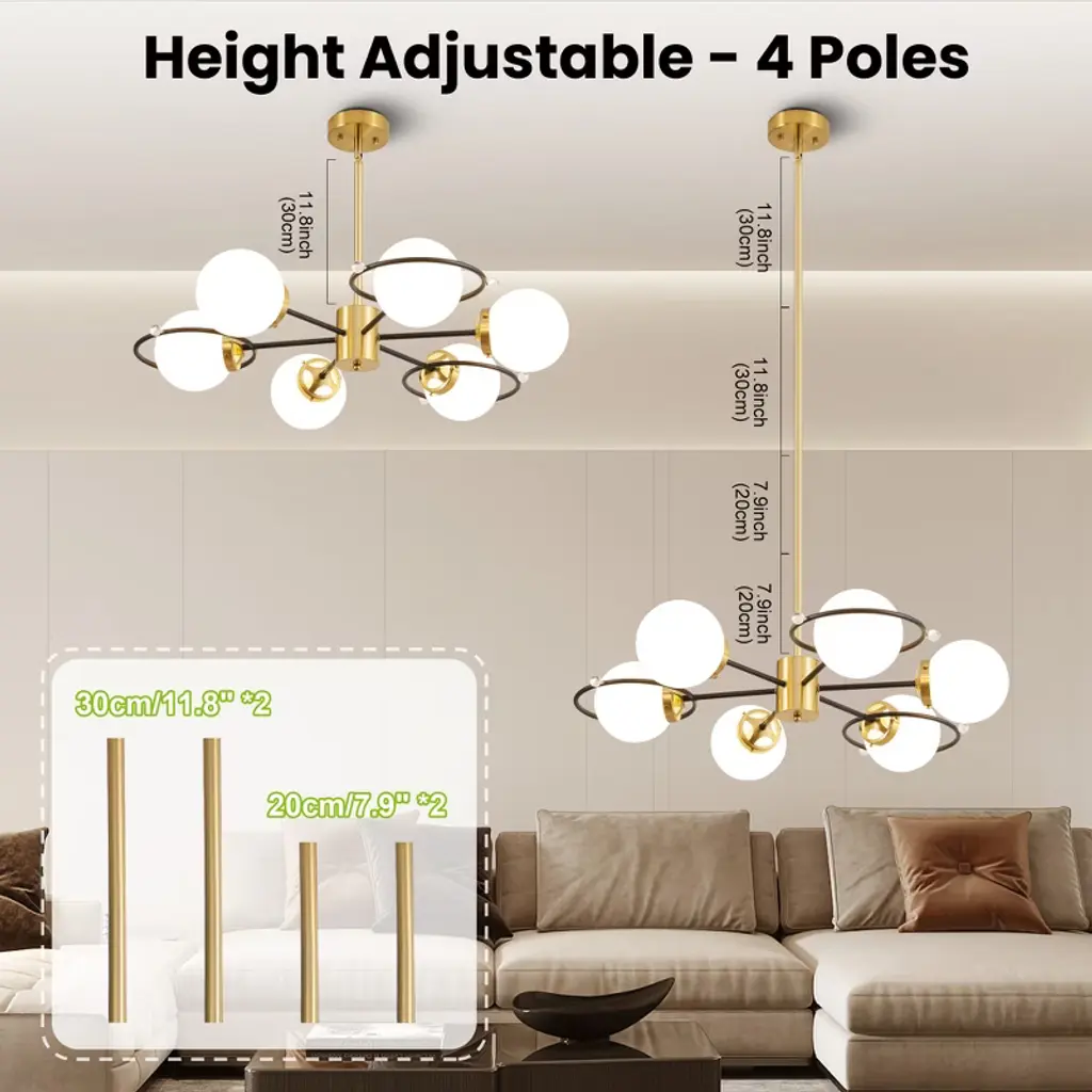 Illuminate your space with this versatile 6-light chandelier featuring height-adjustable poles for customized positioning. The golden metal lamp cups with milk white spherical shades create an elegant glow, while the UL-certified construction ensures safety. Perfect for various ceiling types (flat, vaulted, or sloped), its flexible design allows angle adjustments to direct light where needed. The E12 base accommodates your choice of bulbs (not included), making it ideal for dining rooms, living areas, or bedrooms. Combining mid-century inspired design with modern functionality, this chandelier adds both ambiance and adaptability to your home.