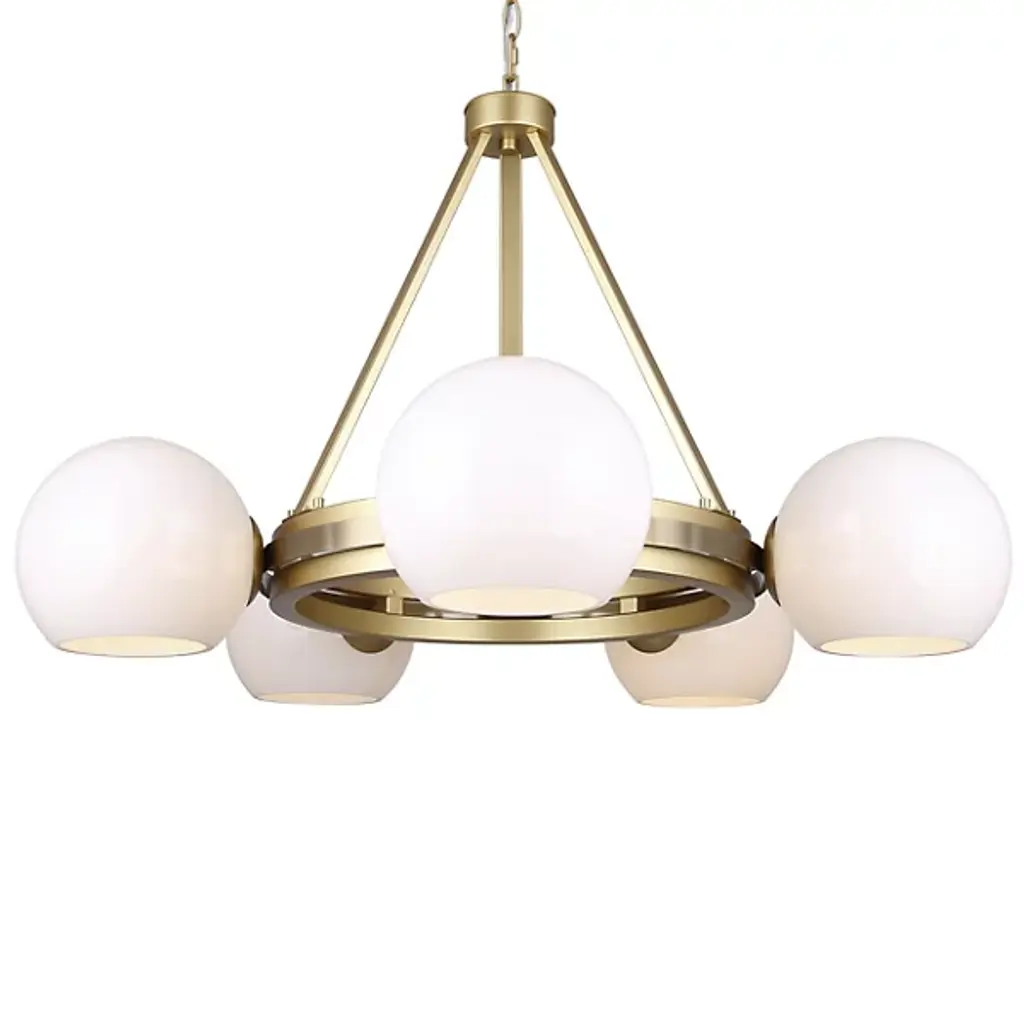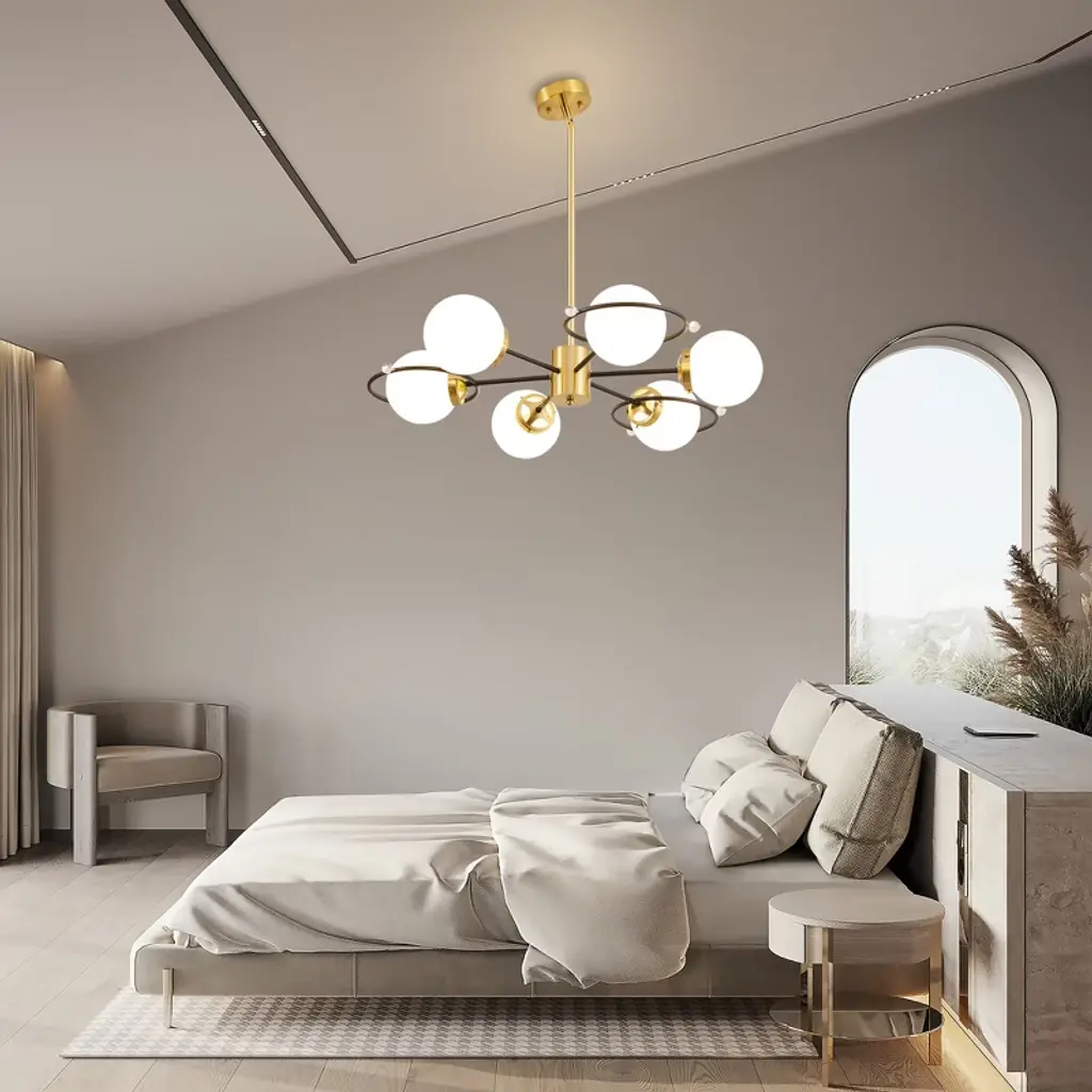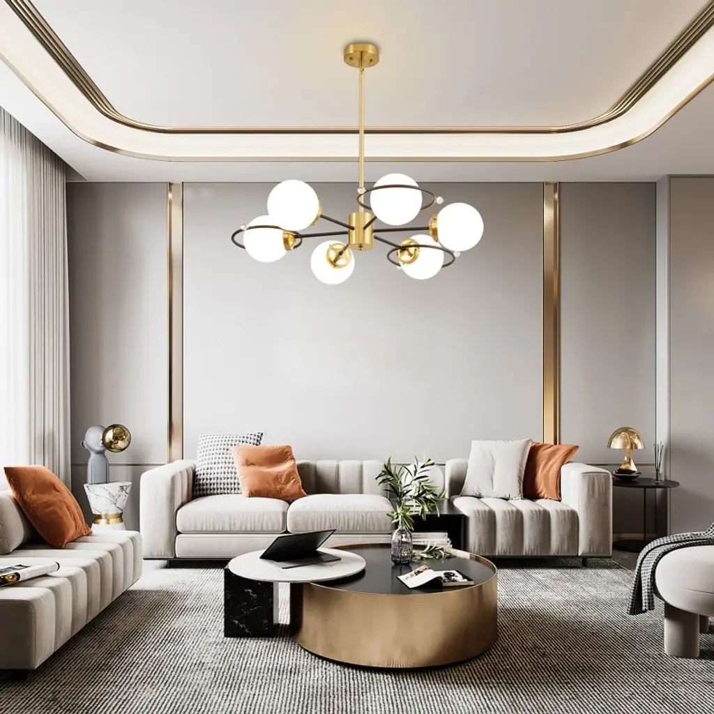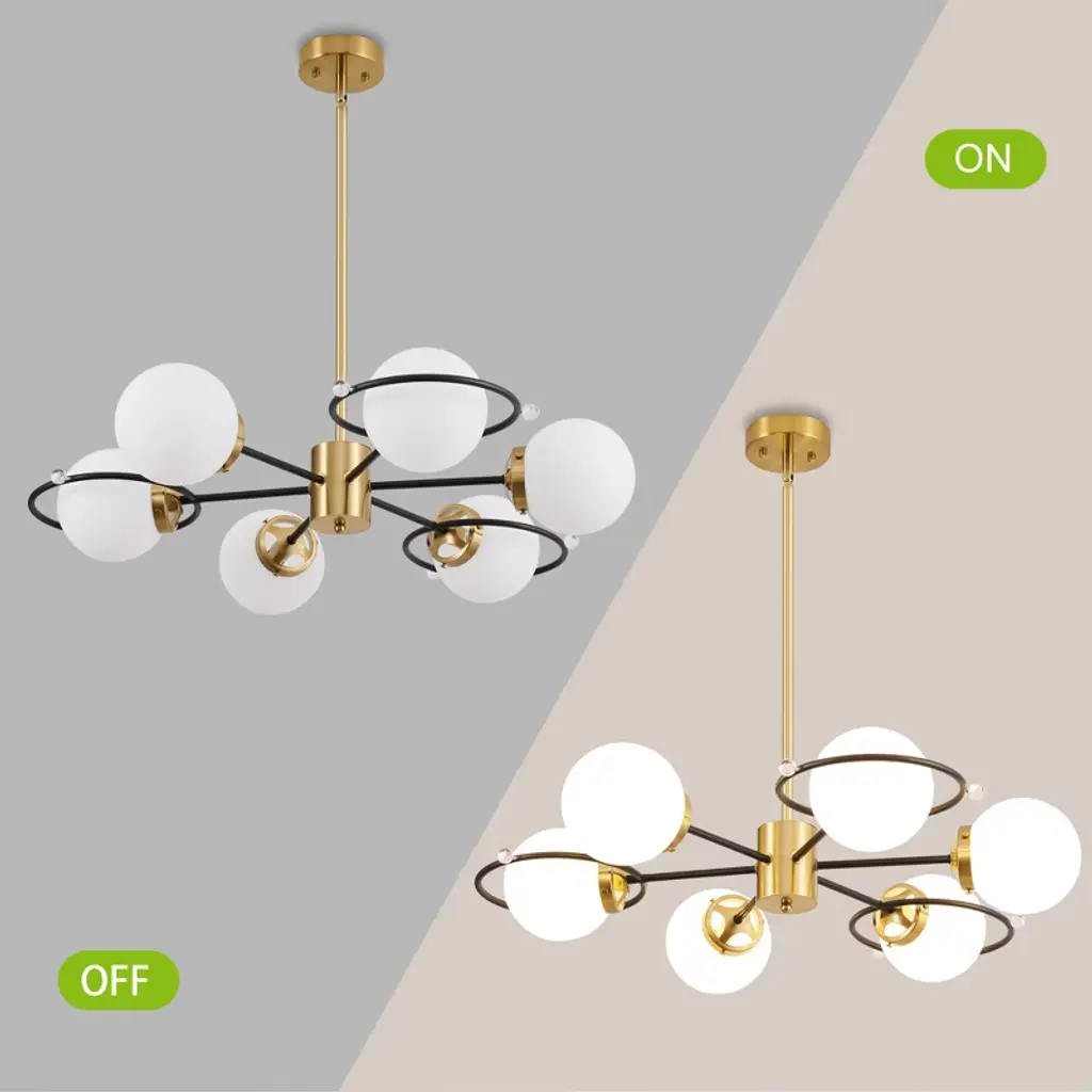 Illuminate your space with this versatile 6-light chandelier featuring height-adjustable poles for customized positioning. The golden metal lamp cups with milk white spherical shades create an elegant glow, while the UL-certified construction ensures safety. Perfect for various ceiling types (flat, vaulted, or sloped), its flexible design allows angle adjustments to direct light where needed. The E12 base accommodates your choice of bulbs (not included), making it ideal for dining rooms, living areas, or bedrooms. Combining mid-century inspired design with modern functionality, this chandelier adds both ambiance and adaptability to your home.