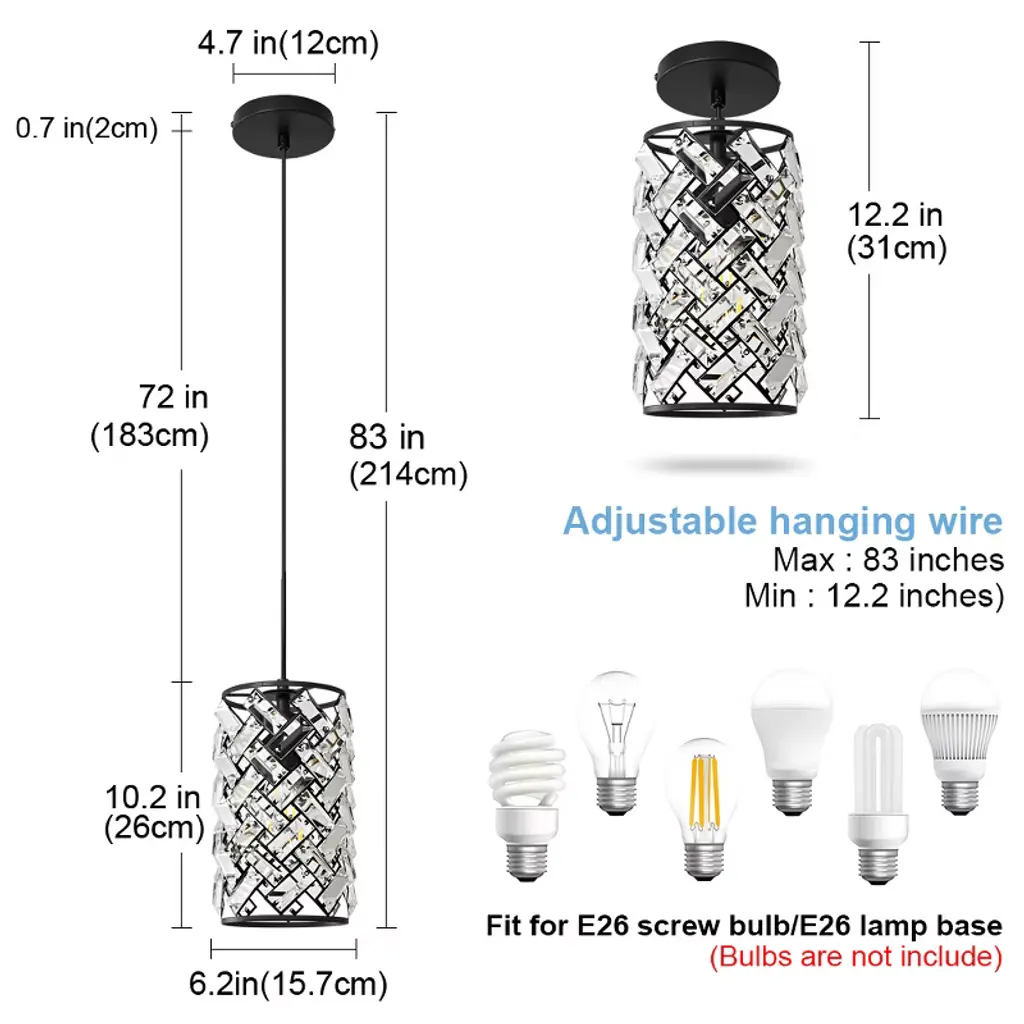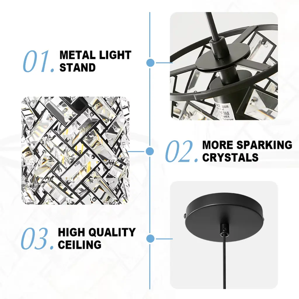 This exquisite lighting fixture combines timeless elegance with modern functionality, featuring a polished metal frame and handcrafted multi-faceted crystal accents that create dazzling light refraction. The high-quality black finish complements the sparkling crystals, producing a luxurious visual effect whether illuminated or unlit. Designed for versatile placement, it functions beautifully as both a statement chandelier and refined ceiling light, with an adjustable suspension system that accommodates various ceiling heights. Compatible with standard E26 bulbs (not included) and universal 110V-240V voltage, it easily adapts to bedrooms, dining rooms, living spaces, or entryways.