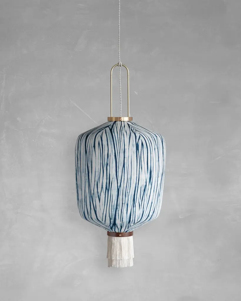 PP02O Pendant Lamp L by Taiwan LanternDimensions: D 35 x W 35 x H 49 cm.Material: Walnut & bamboo frame, Hand-colored fabrics, Metal pipes, Leather lace, Handmade porcelain ceiling cap.This brown color is inspired by Wu Xing 五行. Brown presents Tu 土,earth, which signifies neutrality and good luck. The lantern is hand painted and finished with a layer of Tung oil which gives the lantern a smooth satin finish.Founded in 2013 by Pei-Ching Hsiao, Taiwan-Lantern is an Amsterdam-based studio on a mission to revive Taiwan's rich traditions and century-old craftsmanship. Beyond the common perception of mass production and electronics, our studio cherishes Taiwan's unique heritage, crafting items with stories and memories.We work with Taiwan’s last remaining traditional lantern factory and the finest local artisans. Together we embarked on an adventurous journey to modernize the design, optimize the quality, and return to natural materials.Each lantern involves various crafts, from ceramics, fabric dyeing with plants, painting, traditional knotting, woodworking, metal welding, and bamboo crafts. By combining these diverse traditional crafts, we honor our beloved heritage and advance the evolve the art of lantern making. Each lantern represents Taiwan's rich cultural legacy.We prioritize sustainability, using 95% locally sourced natural materials. Our lantern frames, crafted from walnut wood and locally grown Makino bamboo, connect Taiwan's historical roots with a sustainable future, infusing each lantern with heart and soul.