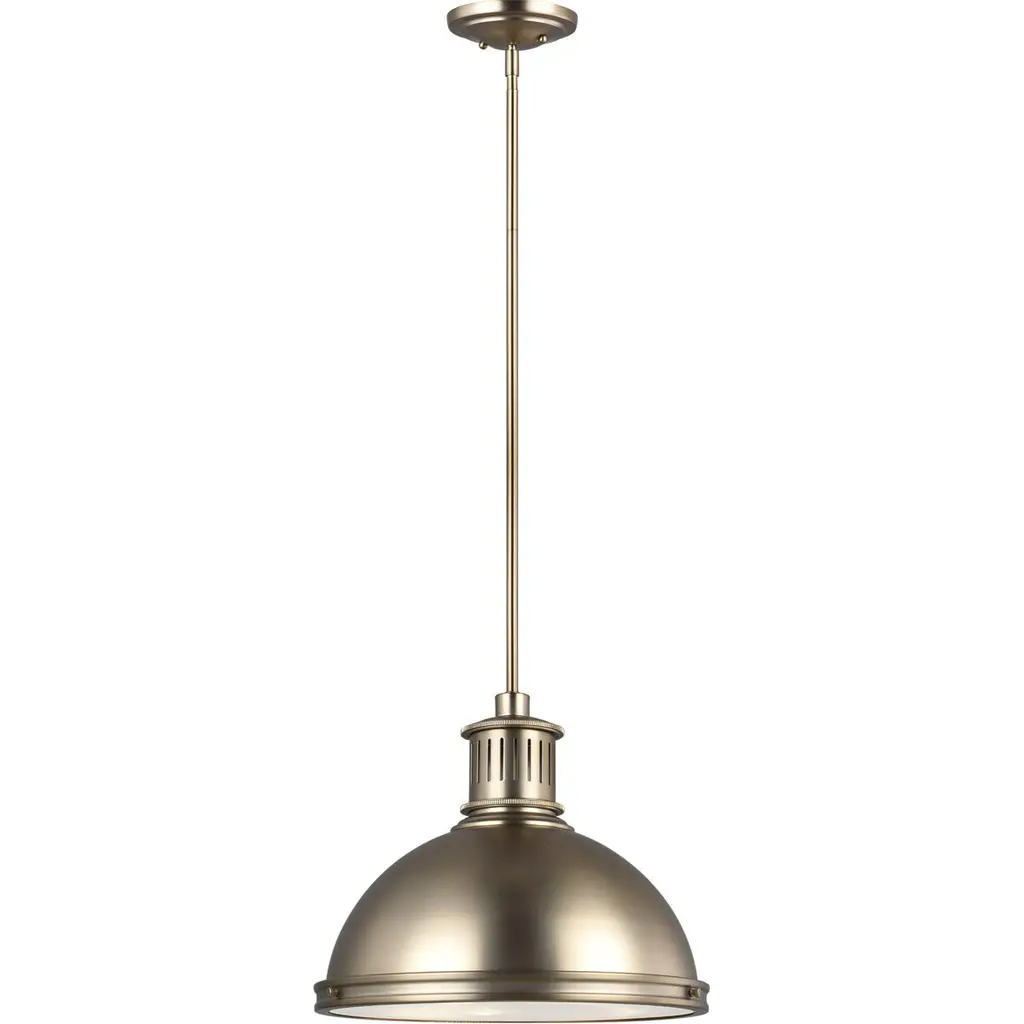 The Pratt Street Metal one light indoor pendant in satin brass is an ENERGY STAR½ qualified lighting fixture that uses LED bulbs to save you both time and money. Inspired by industrial lighting, the hard-working, large-scale Pratt Street metal pendants by put light where you need it, while making a significant design statement. Offered in a choice of Brushed Nickel, Satin Bronze or Autumn Bronze finishes, the one-light, two-light and three-light pendants are all fully enclosed with a prismatic diffusor at the bottom to spread light output evenly and alleviate glare. The pendants are available in incandescent and ENERGY STAR-qualified LED versions, and all can easily convert to LED by purchasing LED replacement lamps sold separately.