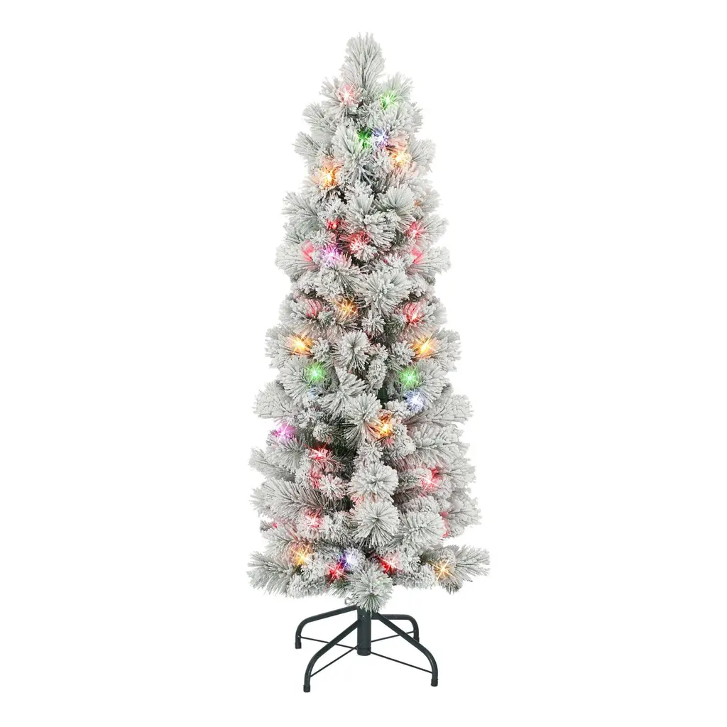 Transform your home into a winter wonderland with the pre-lit flocked Portland pine pencil Christmas tree. Standing tall at 4.5 feet, this artificial tree features snow-dusted pine needles for a realistic snowy vibe. With pre-attached multicolored incandescent lights, it radiates a vibrant and festive glow. Say farewell to the hassle of hanging lights and embrace the enchanting beauty of this hassle-free Christmas tree. Celebrate the holidays with colorful magic! Product Features: Pre-lit with 100 multicolor lights Bulb size: mini Bulb type: incandescent 195 tips Black wire cord Accented with flocked needles Additional Product Features: Pencil profile tree UL-certified and approved For indoor use only Comes with a metal stand Hypoallergenic and needle-shed resistant Assembly required Dimensions: 4.5’ high (from the base of the stand to the top of the tree) 16” base diameter (at the widest point) Material(s): PVC/metal/glass bulbs/wire Note: Branches are compressed for shipment, and need to be fluffed out upon arrival to look like the photo.