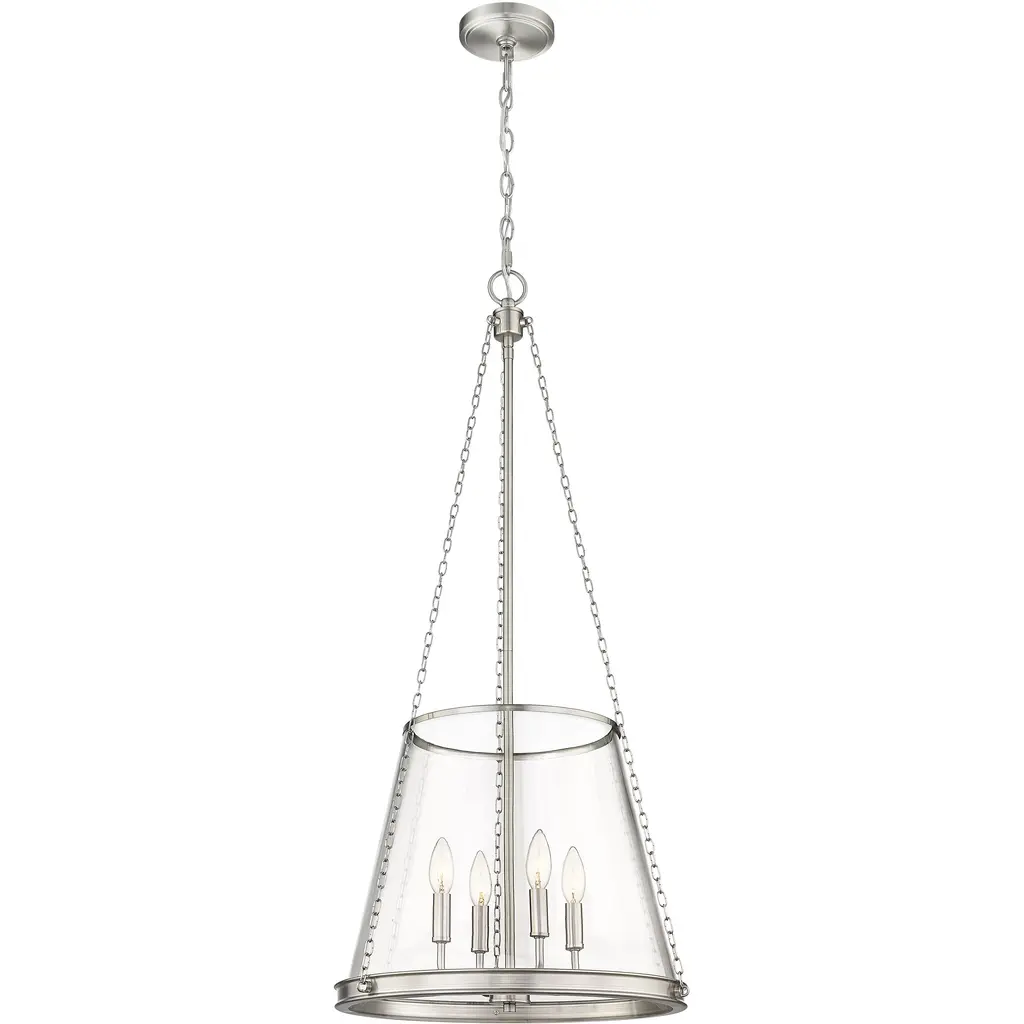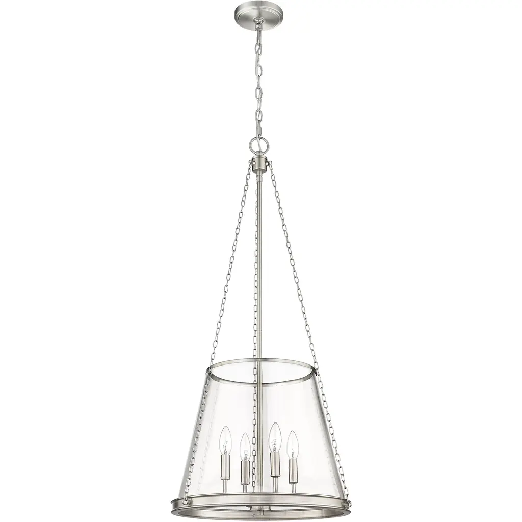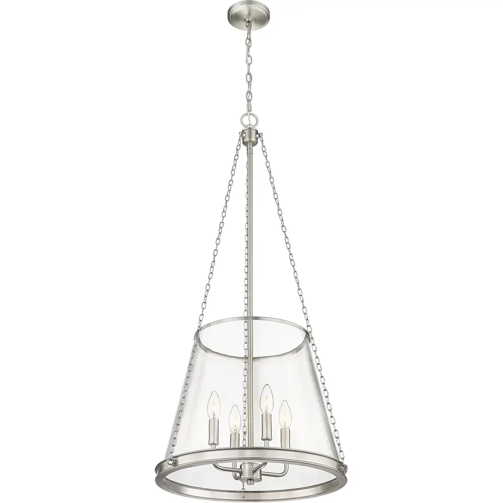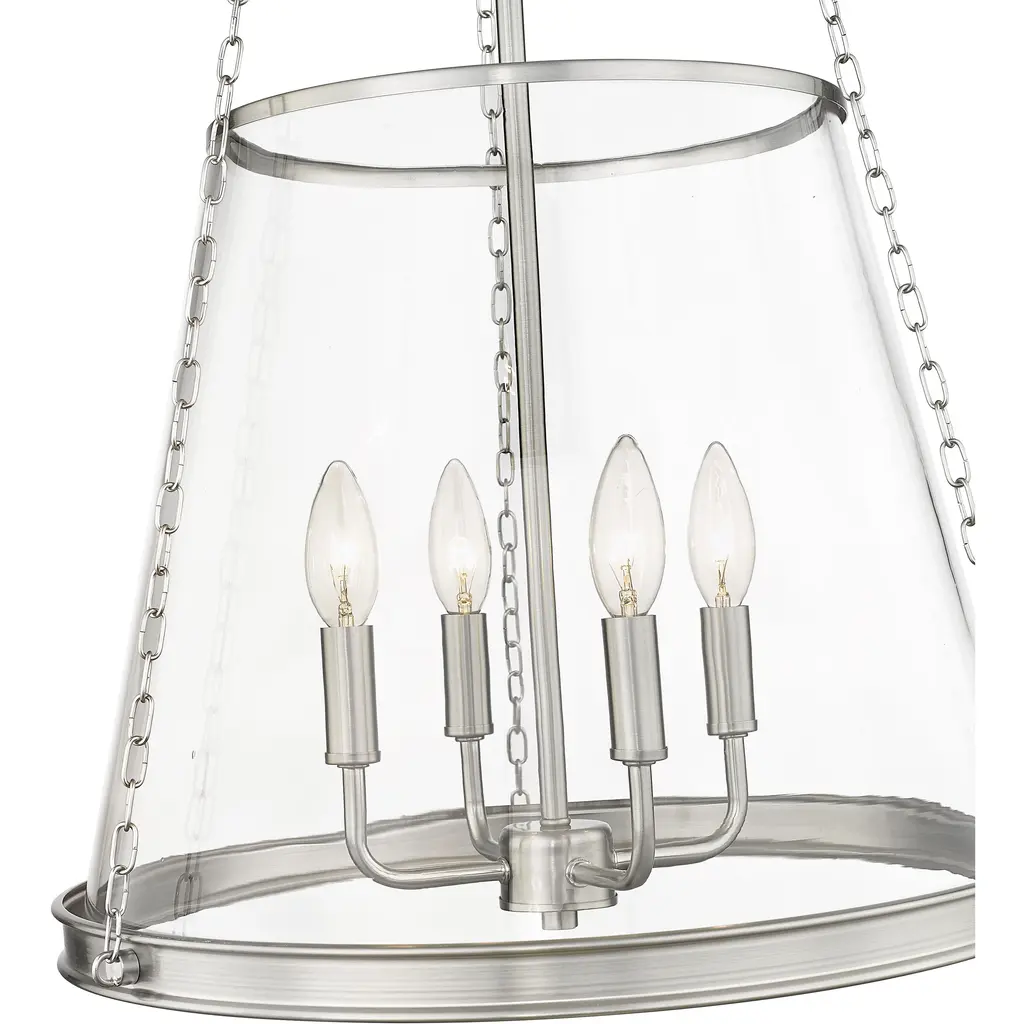 A contemporary take on an architectural restoration style classic, this transitional four-light pendant presents a shiny brushed nickel finish that offers an understated metallic accent to dining rooms and interior spaces. Perfect for spacious foyers and living rooms, this four-light pendant creates a breathtaking urban aesthetic and illuminates a space wonderfully with its four-arm candelabra style light that sits inside an elegantly tapered clear glass shade suspended by industrial style chain link supports.