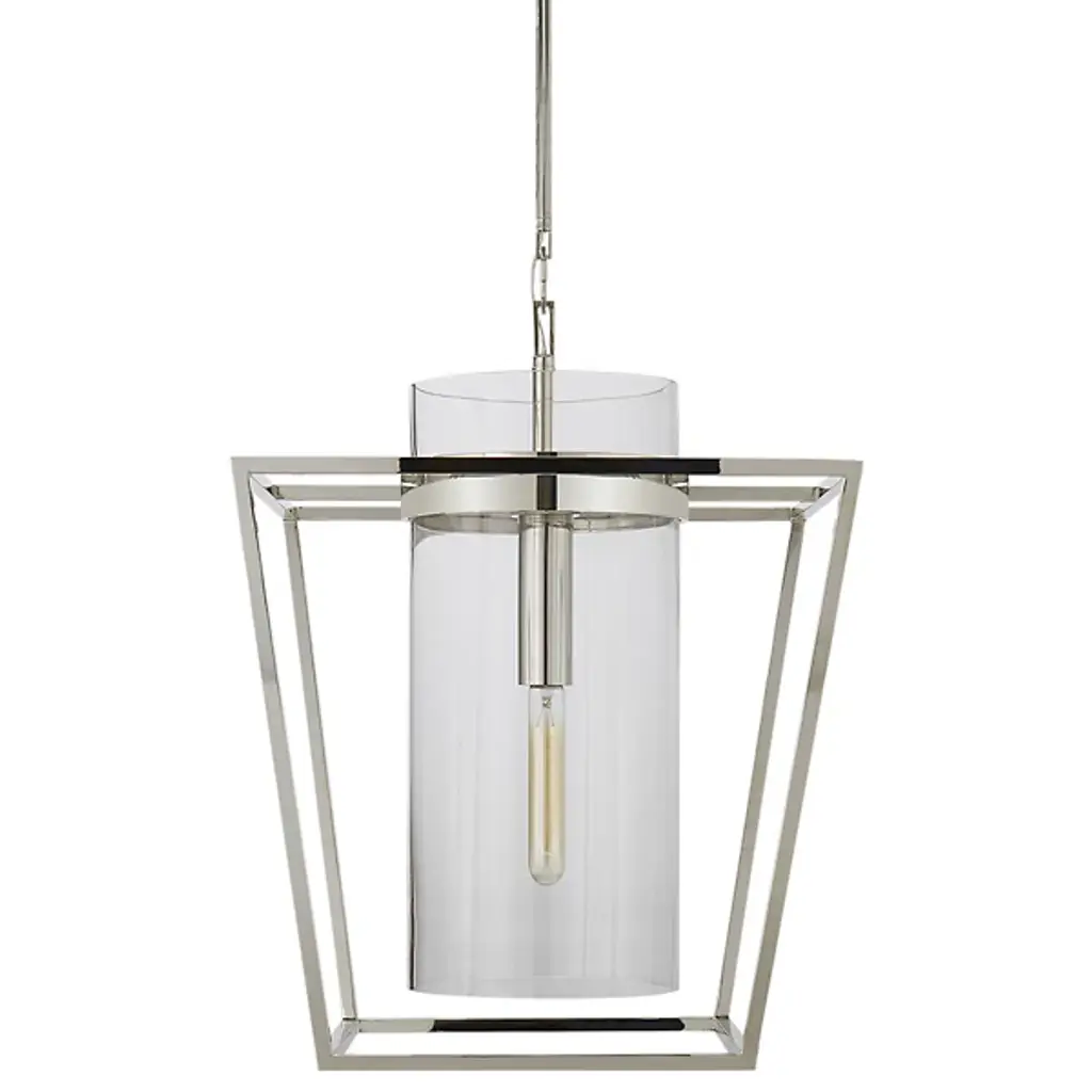 Modern minimalism pays homage to vintage style lighting. The Presidio Lantern Pendant by Visual Comfort Signature, formerly known as Visual Comfort, is defined by grace and simplicity. Designer Ian K. Fowler uses polished metal and clear glass to recreate this classic lantern with a contemporary flair, while retaining its core function of providing practical illumination. The beauty of this pared-down pendant comes to the forefront with its outer metal frame and a cylindrical clear glass shade at the center that secures the internal lamping (sold separately) and produces consistent, warm illumination.