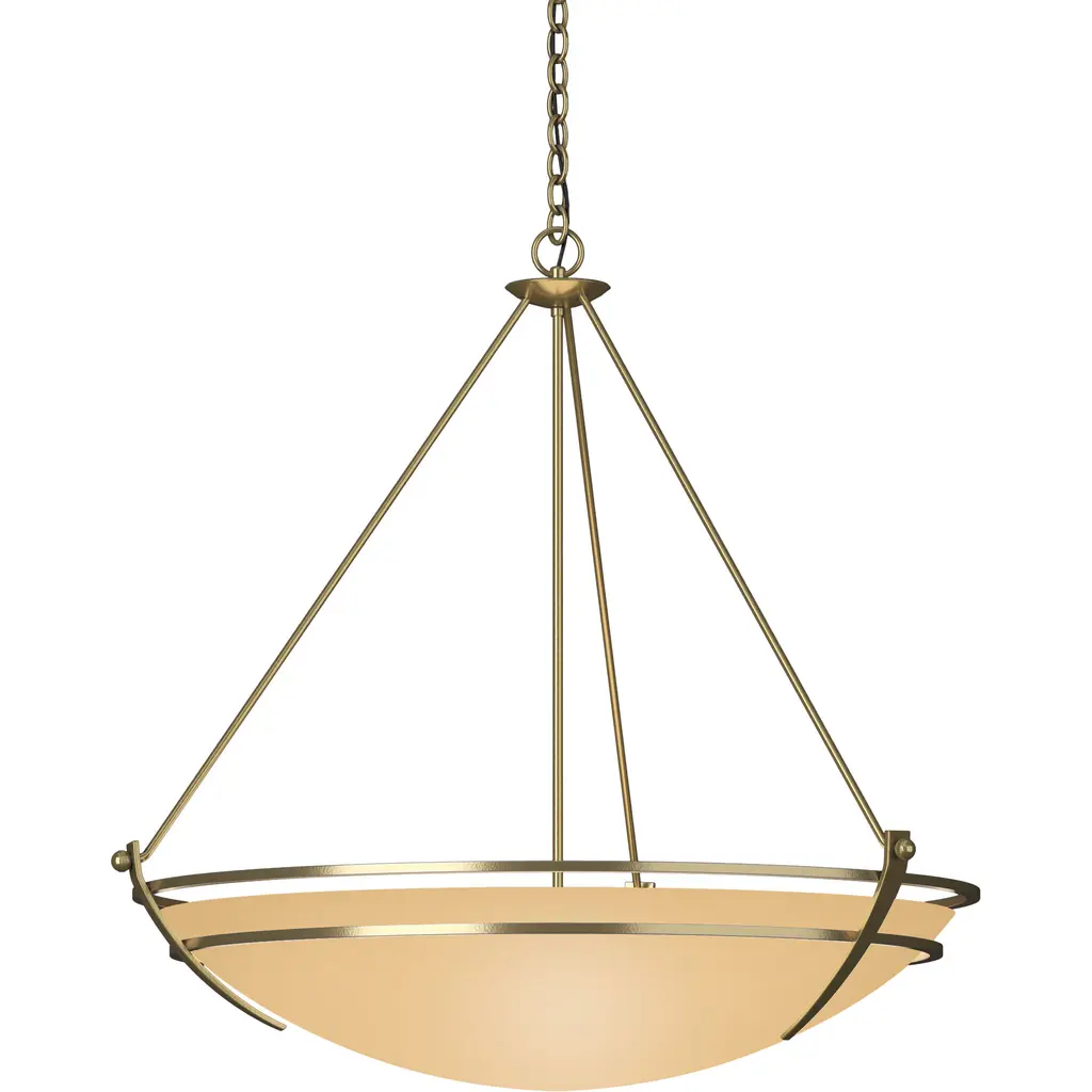 Concentric steel bands circle the glass bowl of this large-scale pendant. Handcrafted steel tines hold the bowl. This modern fixture is crafted using a mix of tradition and technique by artisans at our forge here in Vermont.