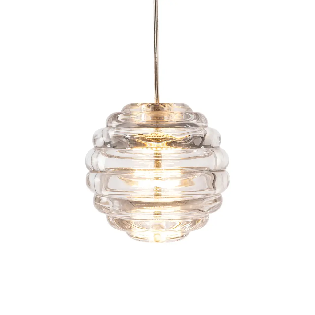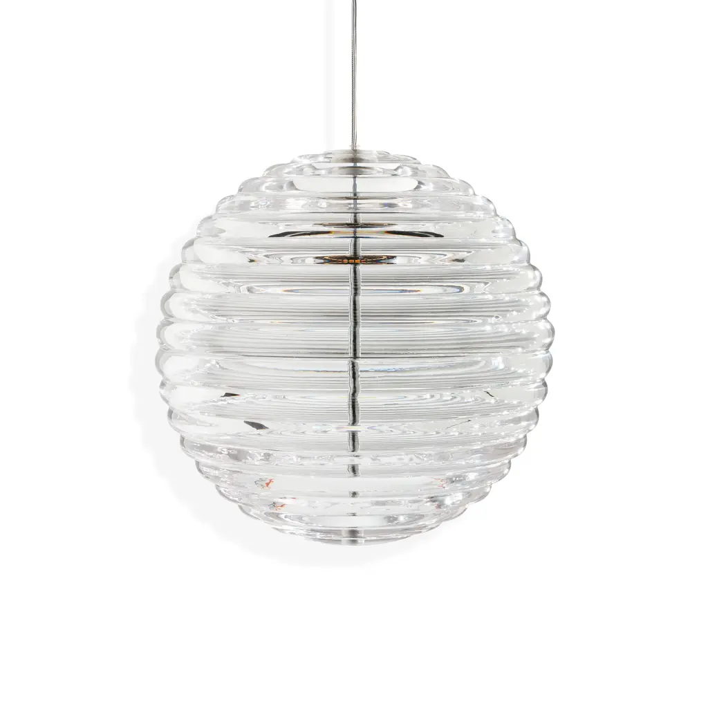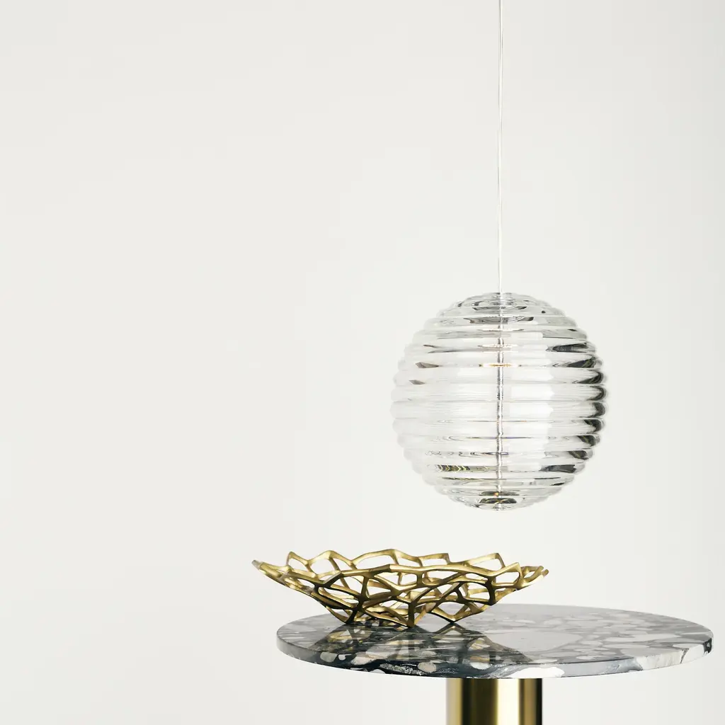 Press is a series of lights made from the thickest and most transparent glass with a satisfyingly rounded linear surface detail. Aptly named Sphere, the shape is reminiscent of shipping buoys and children’s toys. The ribbed glass creates diffusion of the light source and projects linear and stripy patterns. Bold in silhouette and simple in function, Press is manufactured by dropping massive globs of molten glass at 1,200 degrees centigrade, pressed in iron moulds under tons of pressure to create immensely durable lights. Features