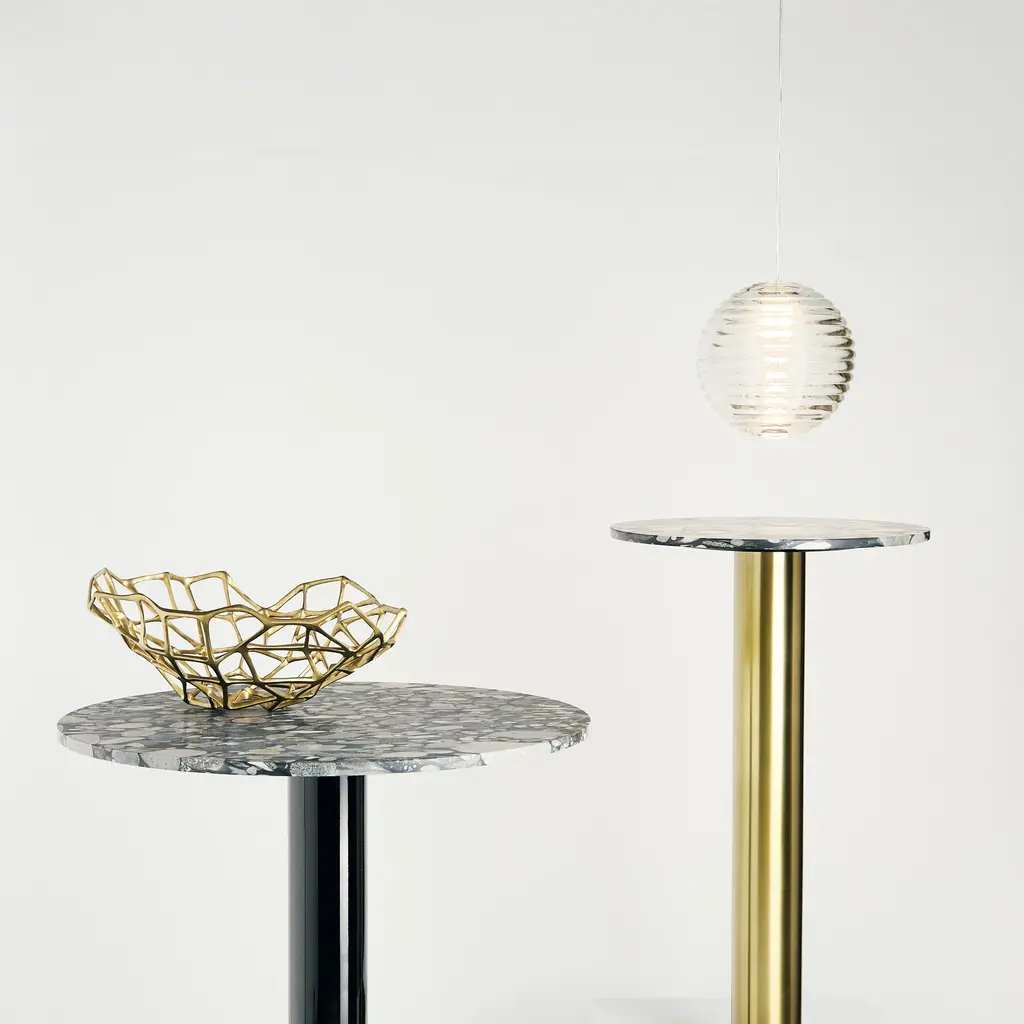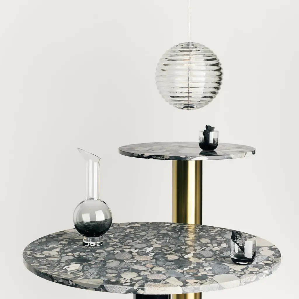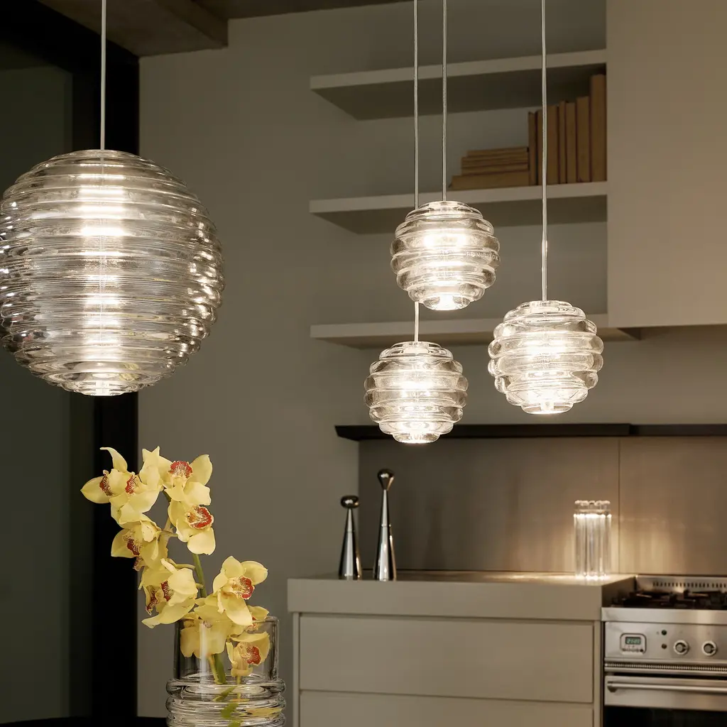 Press is a series of lights made from the thickest and most transparent glass with a satisfyingly rounded linear surface detail. Aptly named Sphere, the shape is reminiscent of shipping buoys and children’s toys. The ribbed glass creates diffusion of the light source and projects linear and stripy patterns. Bold in silhouette and simple in function, Press is manufactured by dropping massive globs of molten glass at 1,200 degrees centigrade, pressed in iron moulds under tons of pressure to create immensely durable lights. Features