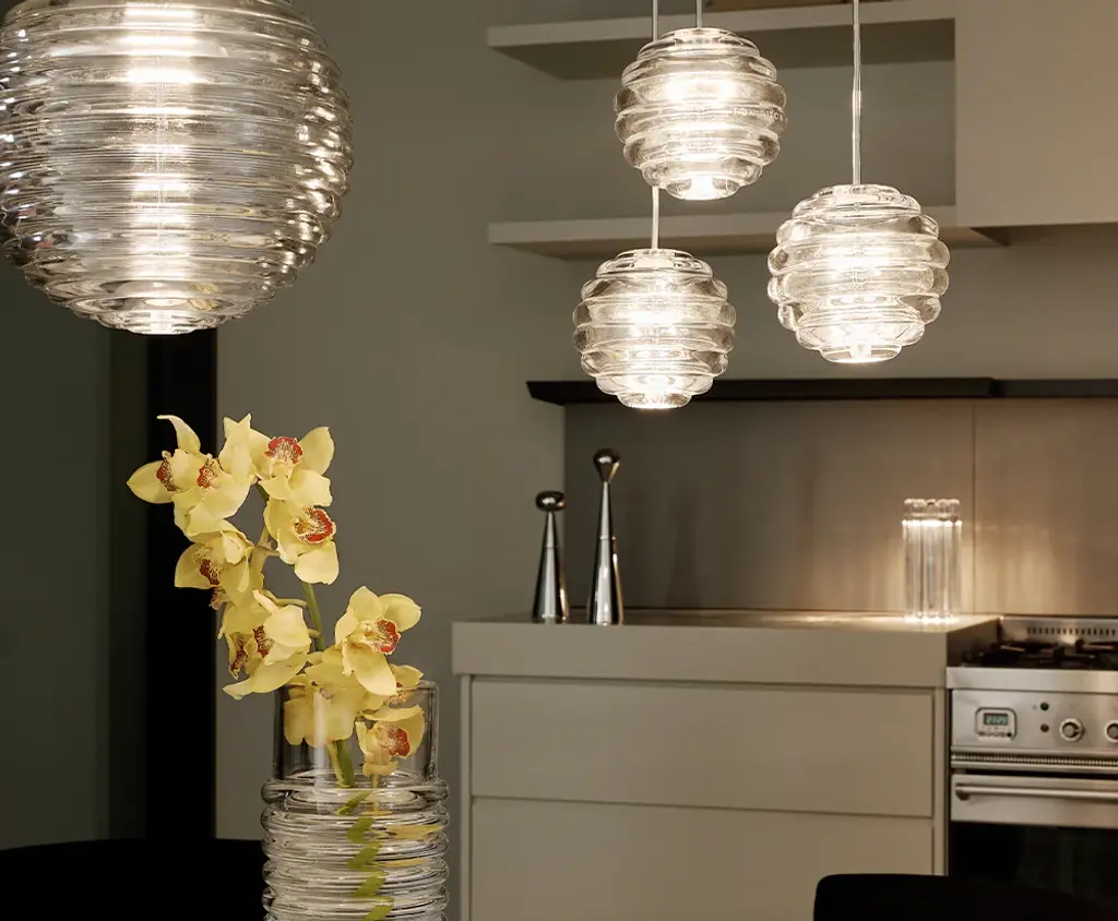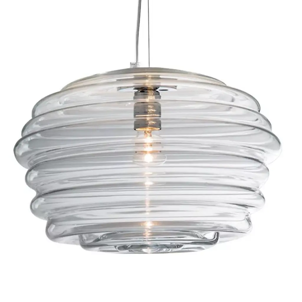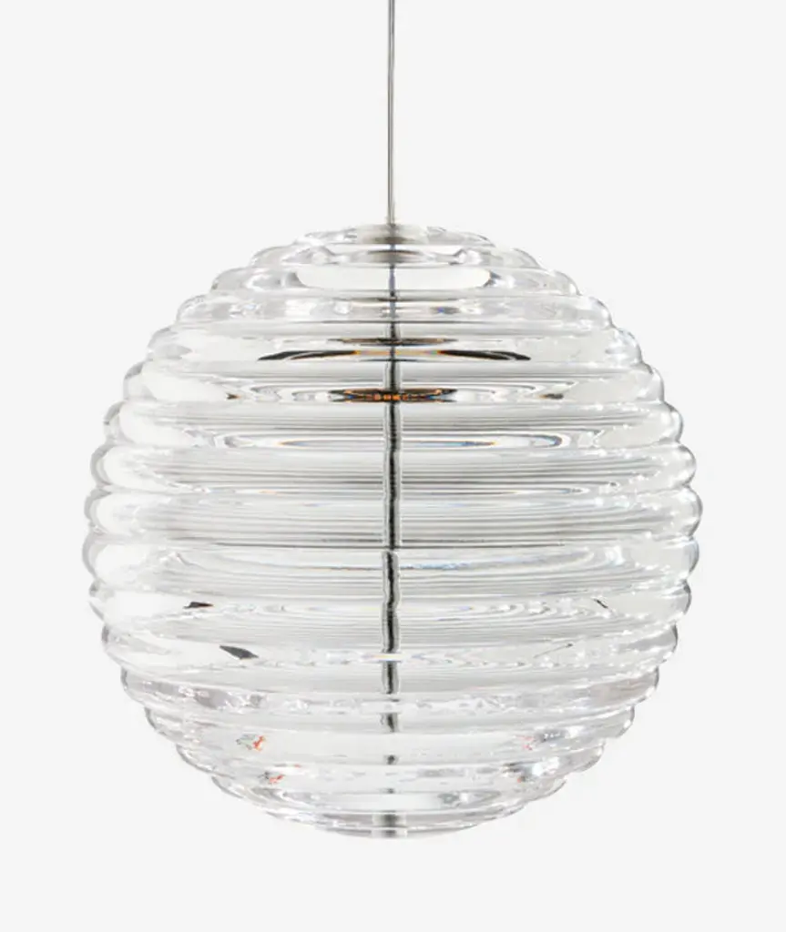 Press is a series of lights made from the thickest and most transparent glass with a satisfyingly rounded linear surface detail. Aptly named Sphere, the shape is reminiscent of shipping buoys and children’s toys. The ribbed glass creates diffusion of the light source and projects linear and stripy patterns. Bold in silhouette and simple in function, Press is manufactured by dropping massive globs of molten glass at 1,200 degrees centigrade, pressed in iron moulds under tons of pressure to create immensely durable lights.