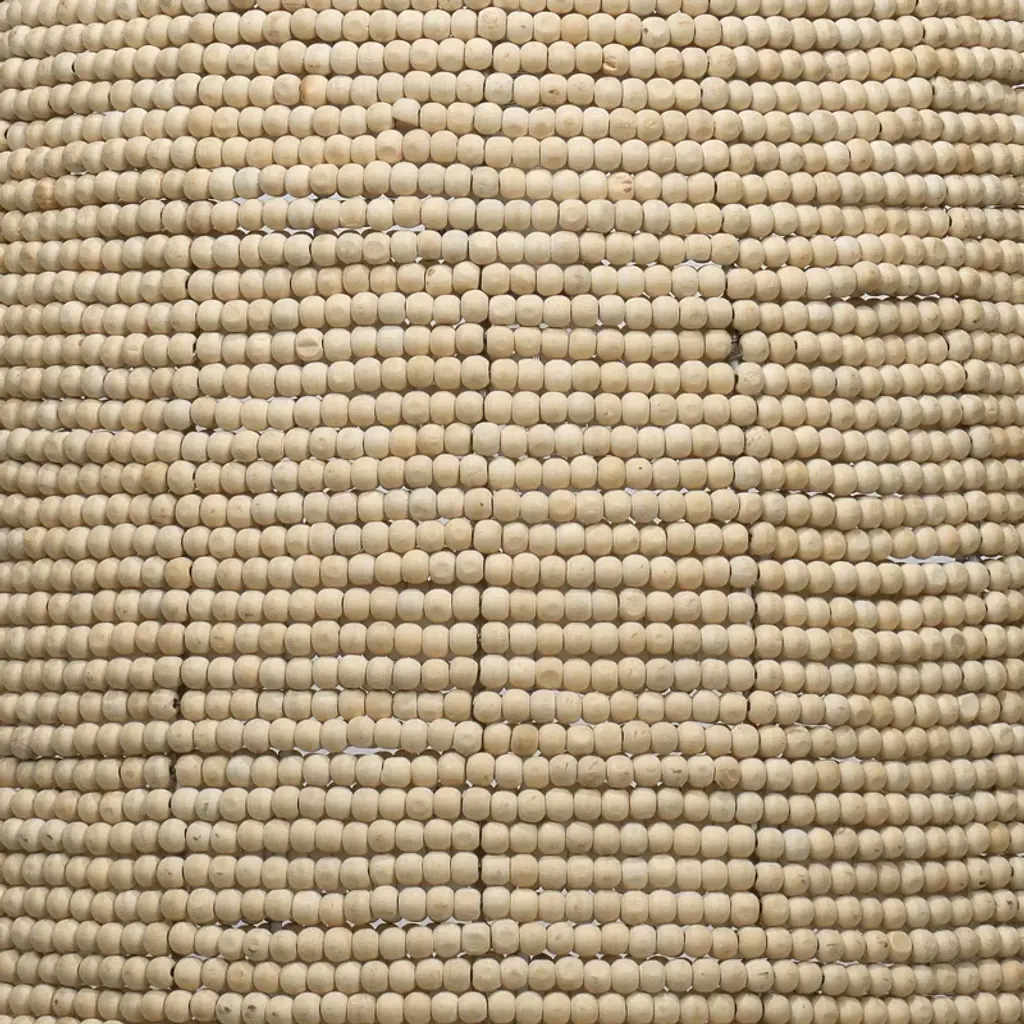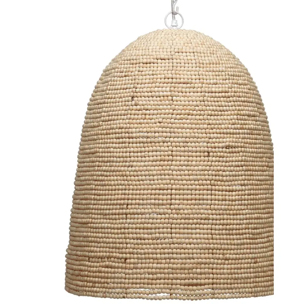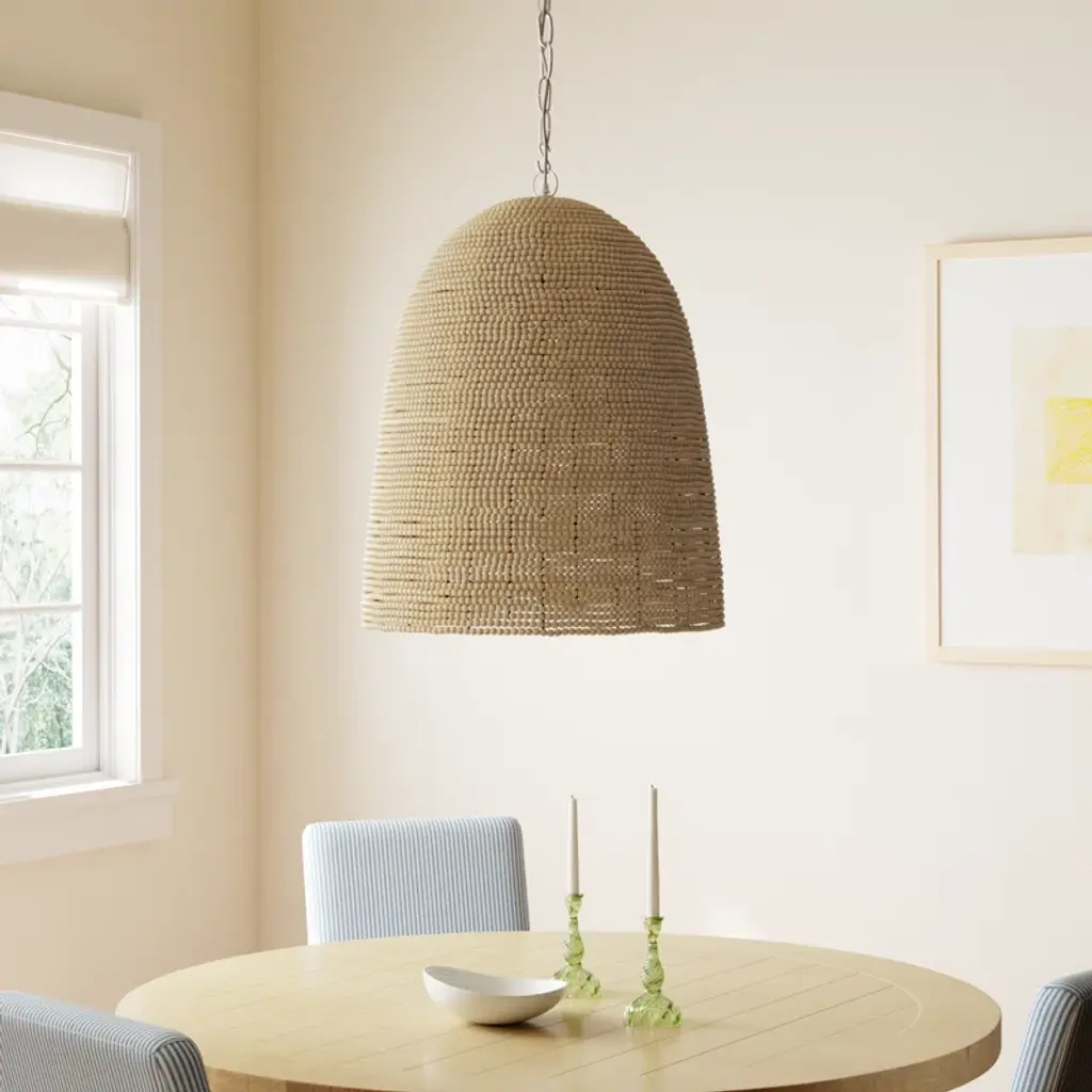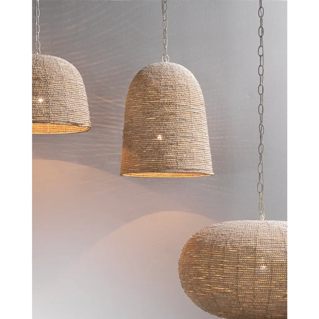 Strings of beads made with mango wood line the body of the oversized Preston Pendant. A white iron chain compliments the natural tone and texture of this piece. A statement piece with repeating patterns and textures like this can help add interest to any coastal palette.