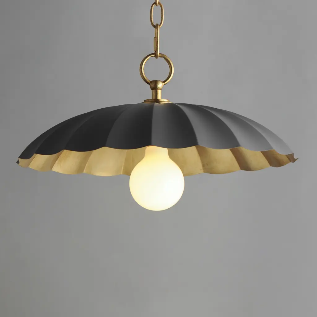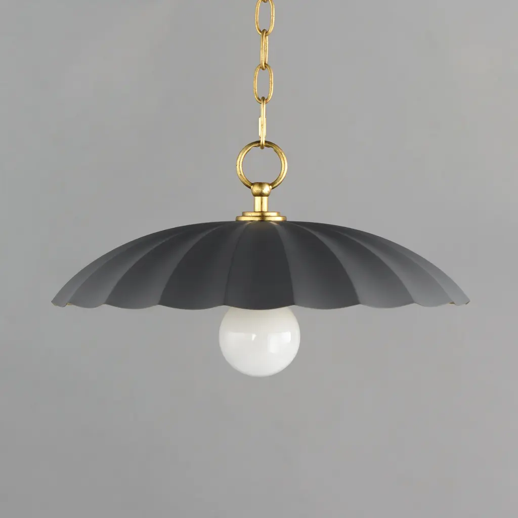 This refreshing collection features the nostalgic detailing of scalloped metal shades with gold leaf interiors. The hand applied gold-leaf interiors reflect the light source within the shades casting a warmer glow downwards. The collection is offered in charming chain hung pendants, a flush mount with Opal White schoolhouse glass, or oversized sconces. Available in Matte Black, Matte White, or Dark Grey with Gold leaf interiors and metalwork.