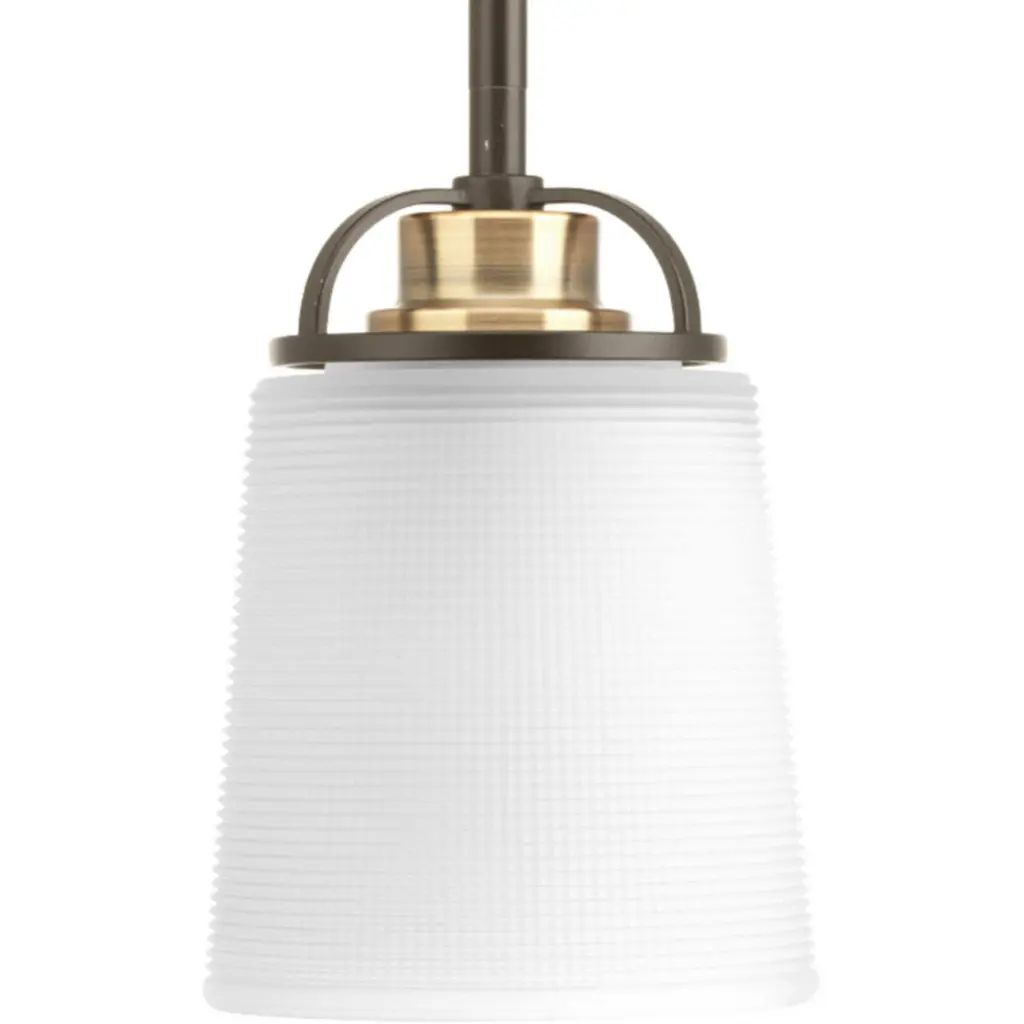 Introducing the Alexa Collection by Progress Lighting, featuring the exquisite one-light mini-pendant. Crafted from porcelain with a Brushed Nickel finish, this elegant piece boasts a width of 5.13" and a height of 7.75". The white linen finished glass is adorned with a crisp, clear edge accent strip, seamlessly blending traditional and modern design elements. With a moisture rating of Dry Rated, this mini-pendant is suitable for various indoor spaces. The product includes a canopy with a diameter of 5.13", along with rod lengths of 2-6, 1-12, and 2-15. The shade dimensions measure 4.06" x 5.56". Illuminate your space with the warm glow of incandescent lighting, with a wattage of up to 100 watts. Elevate your decor with the timeless sophistication of the Alexa Collection.