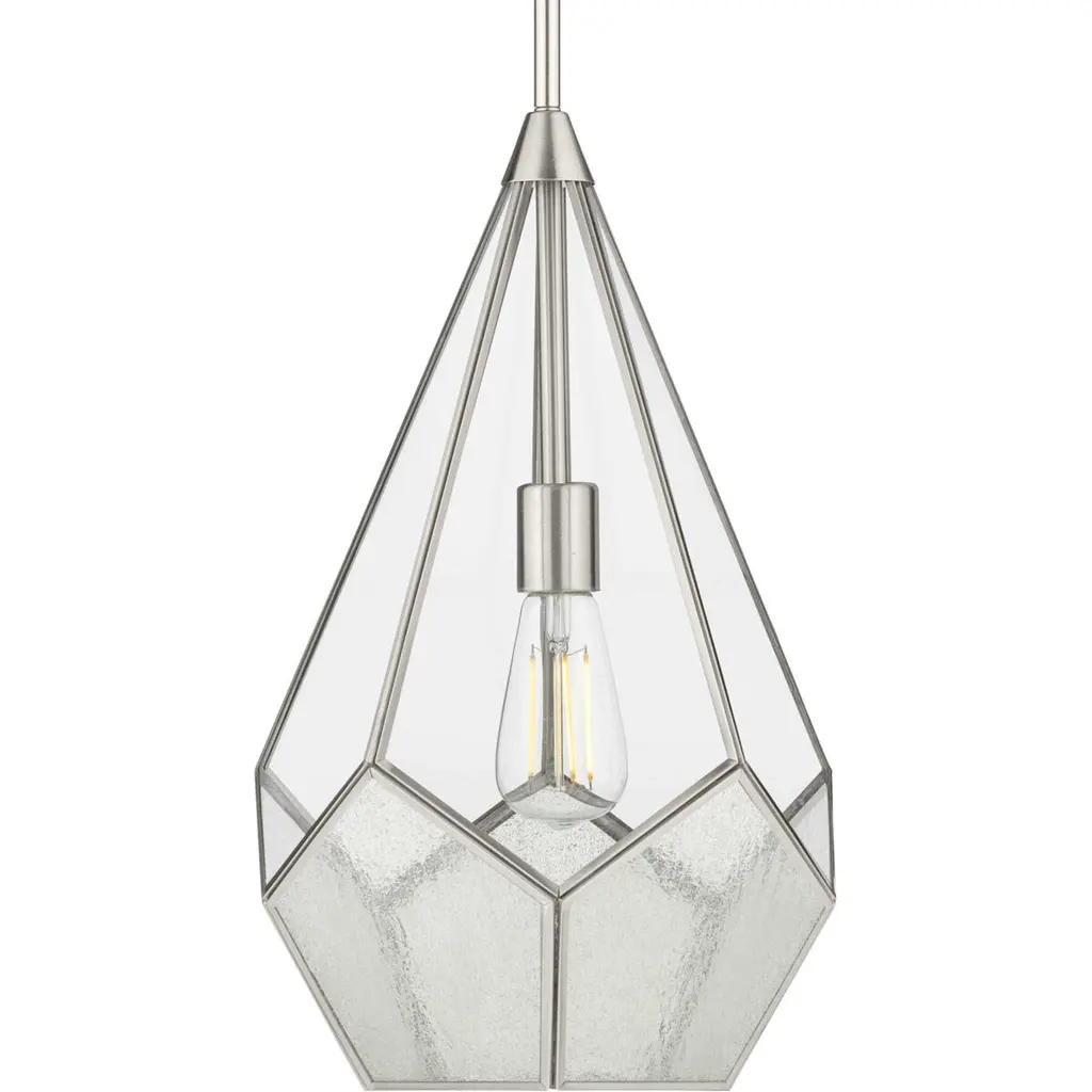 Introducing the Cinq Collection Pendant from Progress Lighting. Crafted from durable steel with an antique bronze finish, this 12" wide, 18.5" high, and 12" long pendant features a striking geometric design. The bohemian-style pendant is designed for dry rated areas and comes with an 8" chain for easy installation. The incandescent lamping type with a 100-watt capacity provides ample illumination. The product requires assembly and includes a 4.56" canopy, 8" chain, and rod lengths of 1-6 and 4-12. The glass panels create a unique shade that holds an industrial light base inside, making it an attention-grabber for all the right reasons. Elevate your space with the modern and contrasting elements of the Cinq Collection Pendant.