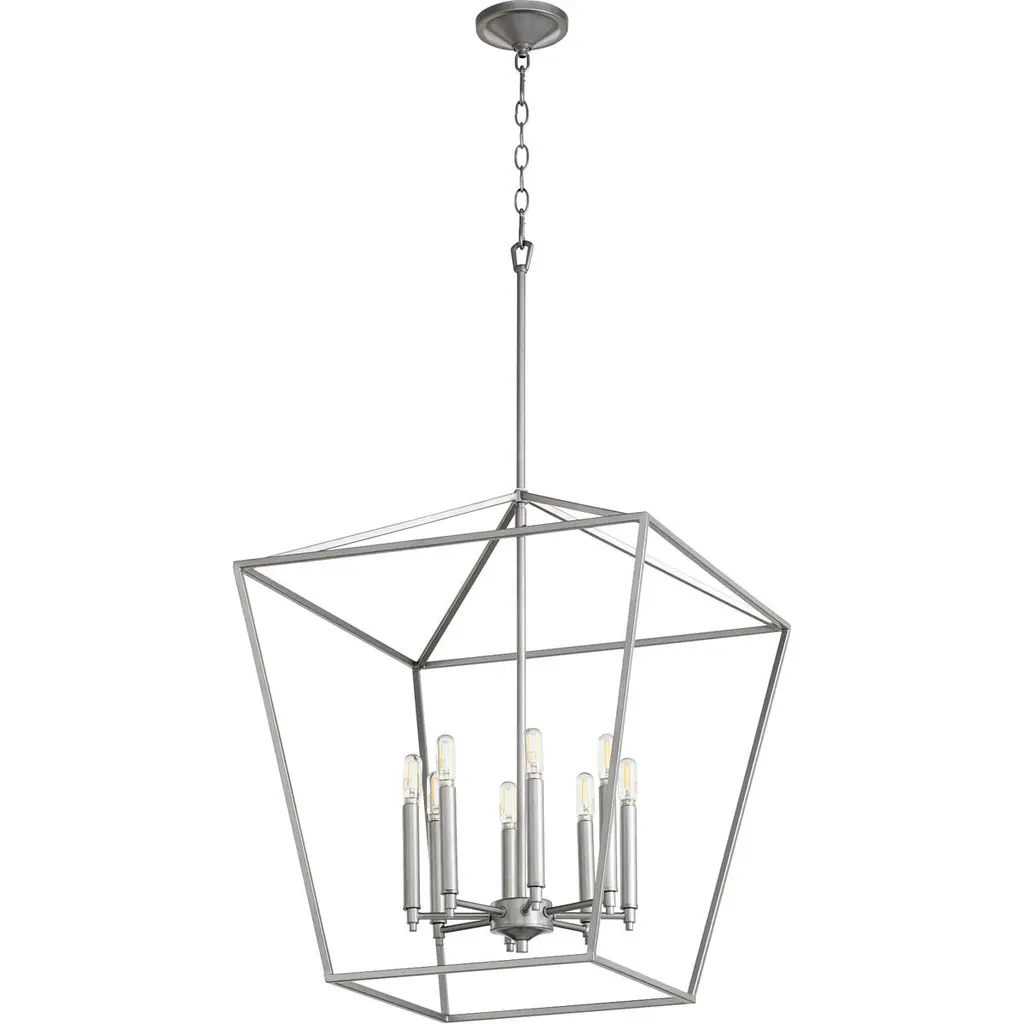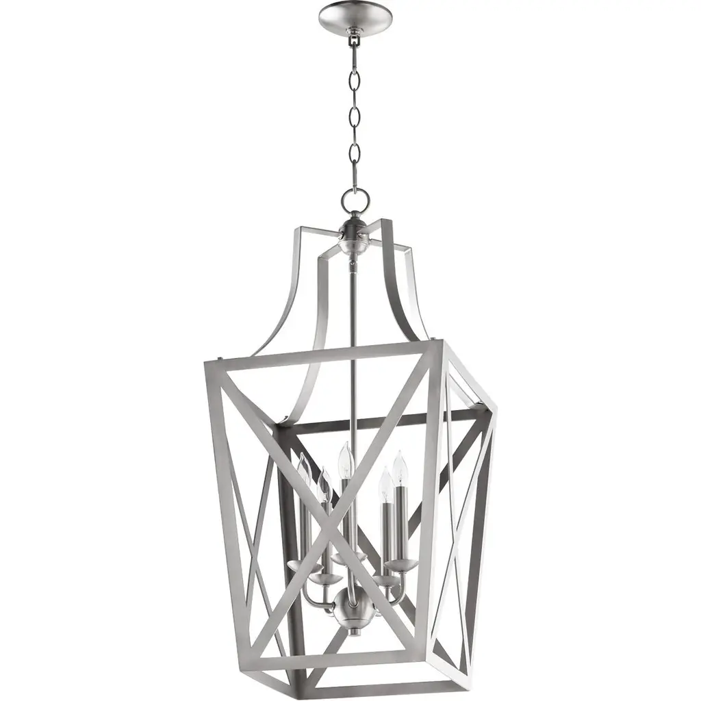 Introducing the Galloway Collection from Progress Lighting, a fusion of modern lines and rustic charm. Crafted from durable steel with a brushed nickel finish, this foyer light features a distressed grey washed oak frame suspended from an adjustable chain and round canopy. The fixture holds four incandescent candelabra lights, creating a casually elegant glow. With a width of 24" and a height of 30.87", it's perfect for great rooms, bedrooms, and dining rooms. Its versatile design suits modern farmhouse, modern mountain, and coastal interiors. This dry-rated fixture includes 72" of chain and can be used on a sloped ceiling. It measures 24" in diameter and 30.87" in height, and uses (4) 60-Watt maximum medium base bulbs (sold separately). The product comes with a 1-Year Limited Warranty, installation instructions, and mounting hardware for easy setup. Elevate your space with the Galloway Collection from Progress Lighting.