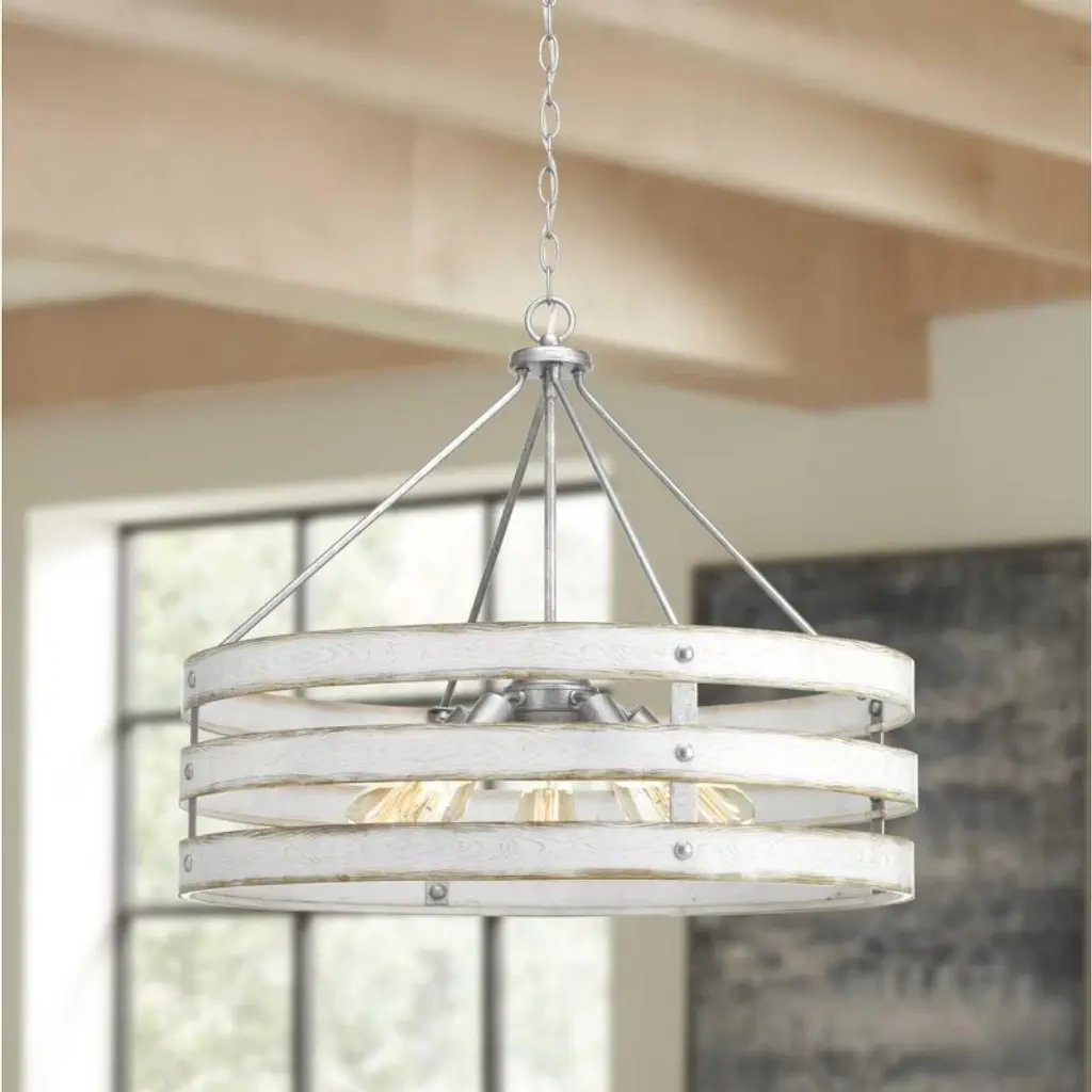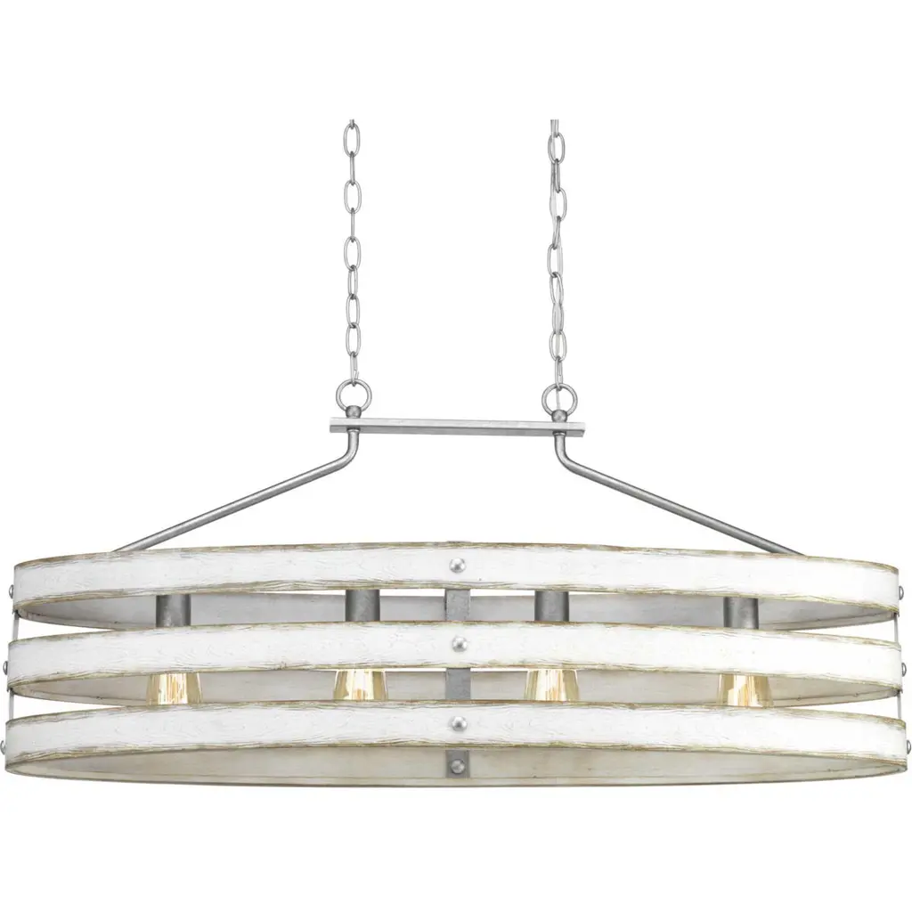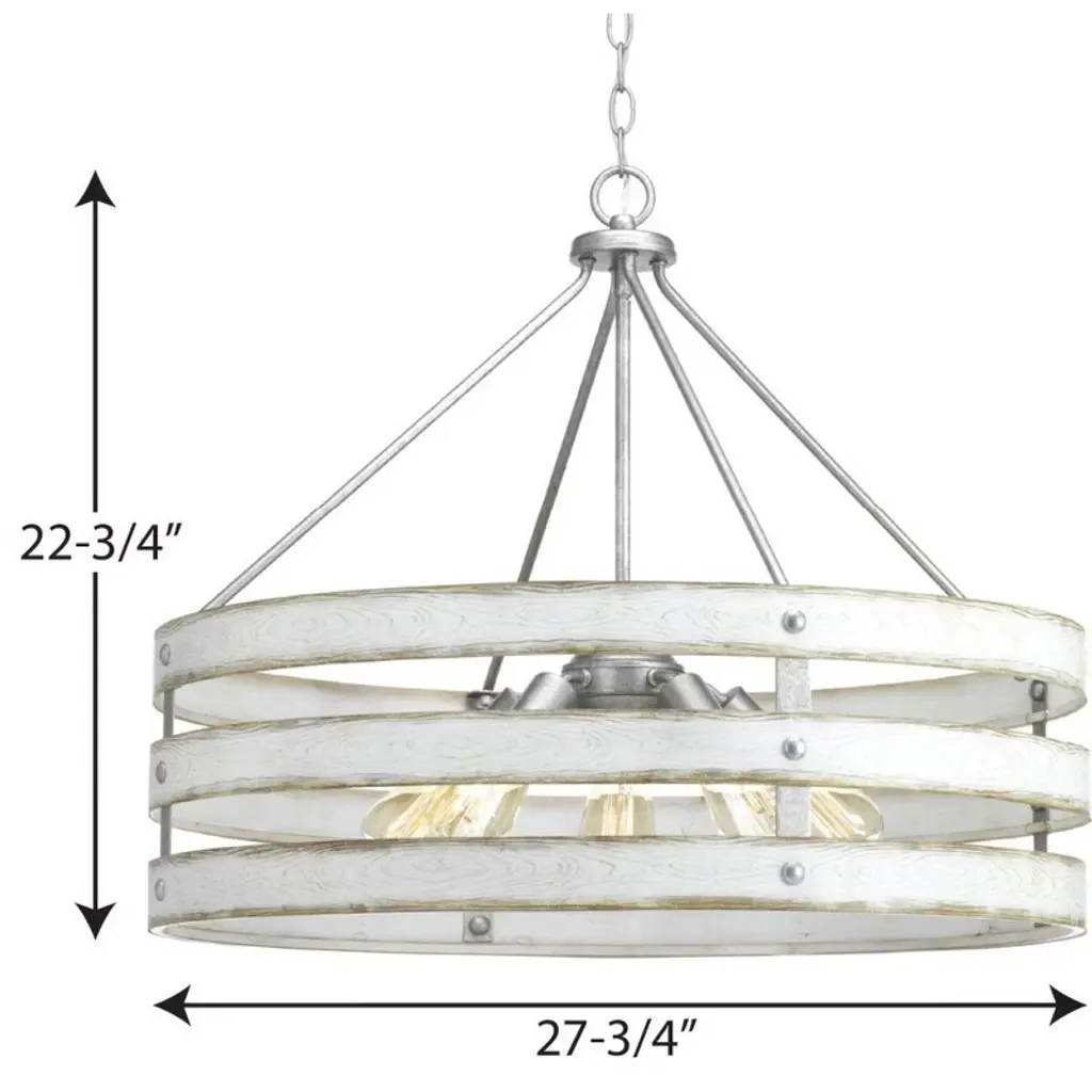 Introducing the Gulliver Collection by Progress Lighting, featuring the stunning five-light pendant. Crafted from durable steel with a galvanized finish, this pendant boasts a width of 27.75" and a height of 22.75". The pendant comes with a 72" chain for easy installation. With its incandescent lamping type and 75 watts of power, it provides ample illumination. The design features three circular bands in a dual-toned frame of galvanized with antique white accents, creating a hand-painted wood-grained texture. This versatile piece complements Rustic, Modern Farmhouse, Urban Industrial, and Coastal interior settings. The pendant is dry rated and includes a 5.13" canopy. Elevate your space with the Gulliver pendant, a perfect blend of style and functionality.